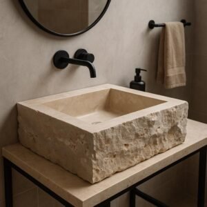 Handcrafted Travertine Stone Sink: Rustic Square Vessel Basin, 19x19x6″