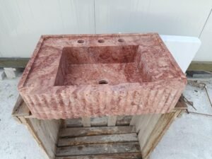 Red Marble Bathroom Sink with Faucet Holes – Handcarved Stone Vanity Basin