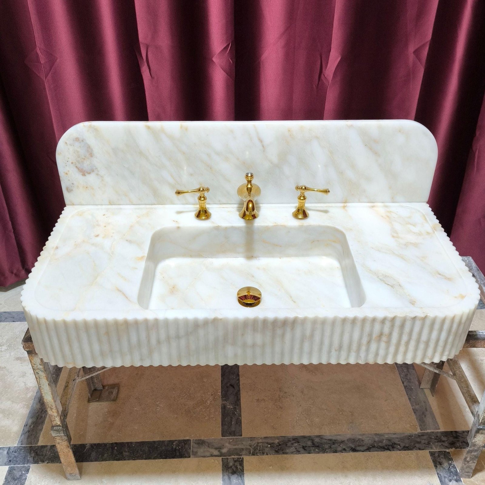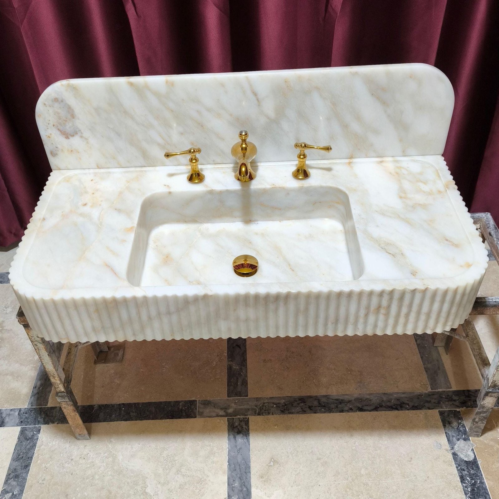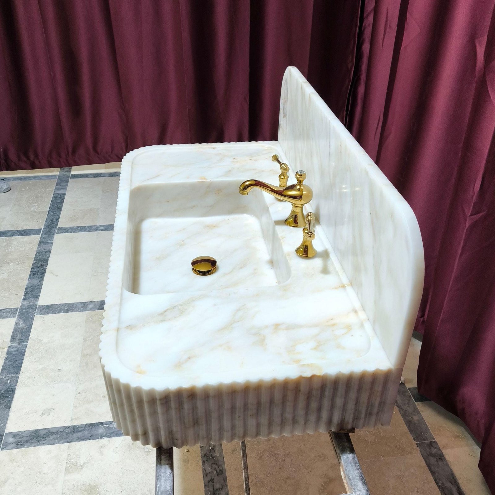 Enhance your bathroom with the luxury of this Calacatta Gold marble sink, featuring a sleek fluted front and elegant rectangular design. Perfect for any modern bathroom, this custom marble sink brings timeless sophistication to your space. 🛁✨