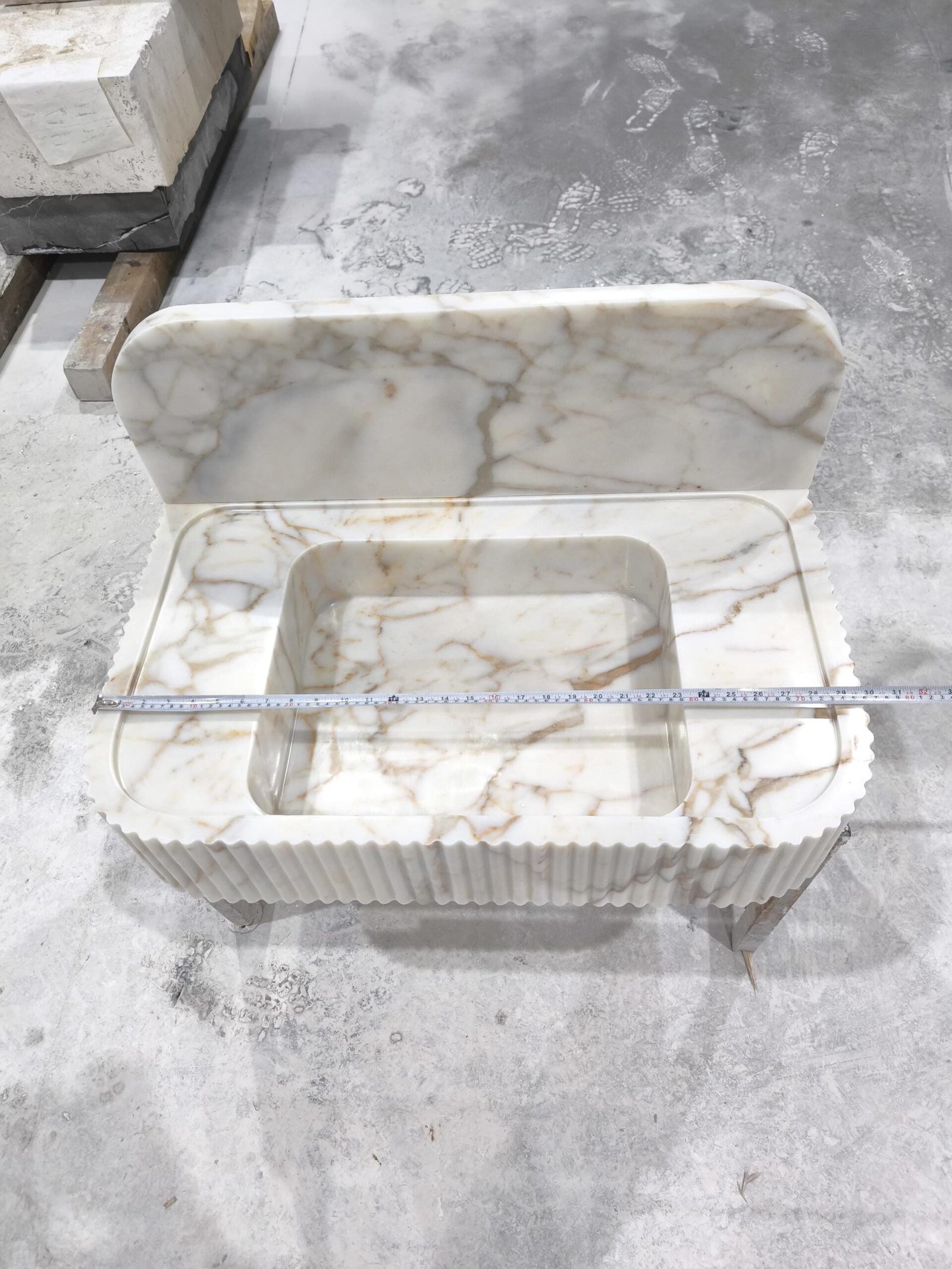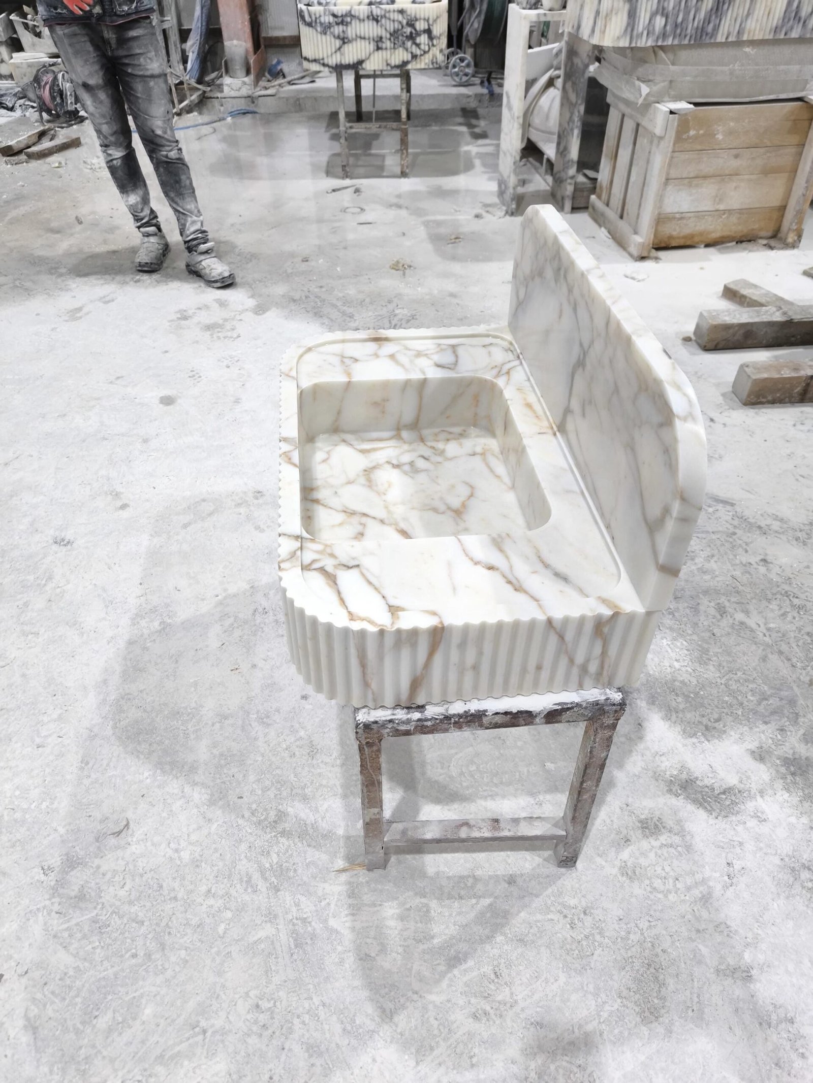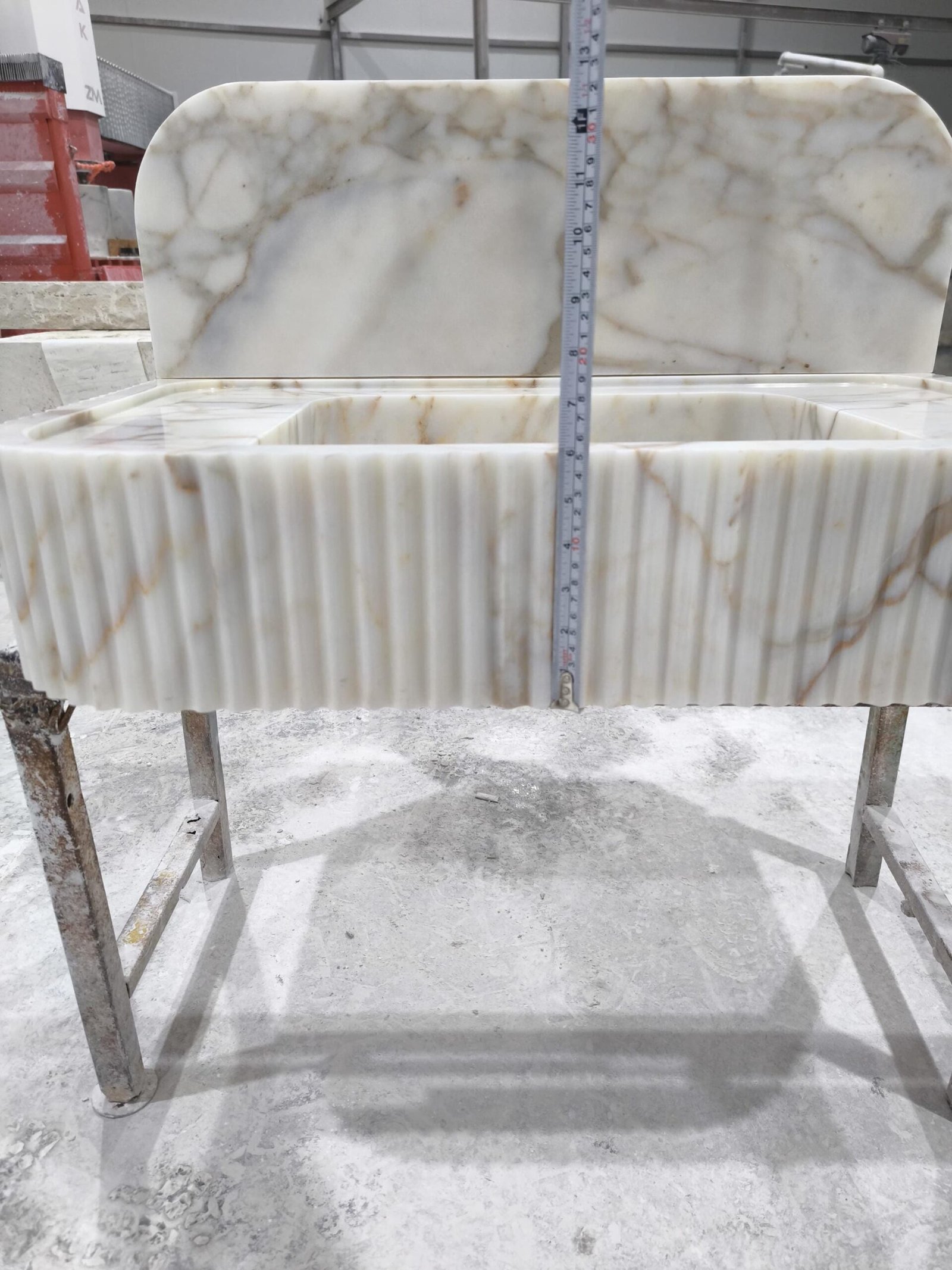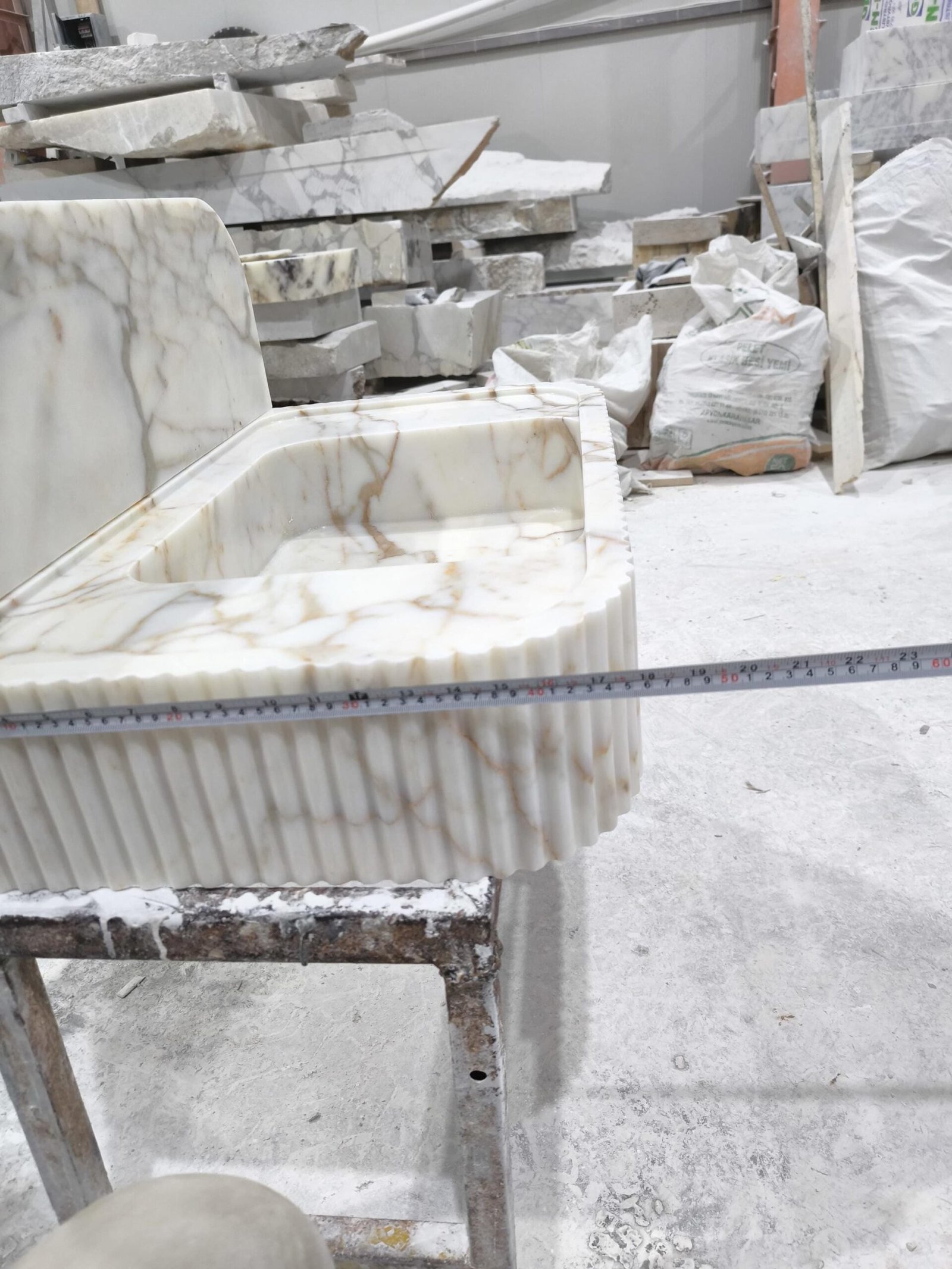 🛁Refined, radiant, and rooted in timeless style — this Calacatta Gold Marble Sink brings serene elegance to modern interiors. Its creamy stone base is traced with delicate golden veins, framed in a fluted front and topped with a sweeping 10” curved backsplash.🎯Sized at 18x30x6”, it’s a functional showpiece for those who curate calm, spa-like spaces with sculptural form.🪨Hand-carved from solid natural marble with unmatched precision.⚒️Perfect for designer homes, boutique projects, or architectural renovations.🎁Carefully packed and protected, this handmade basin is built to inspire across generations.🛡️Durable, sealed, and designed to age beautifully with time and use.