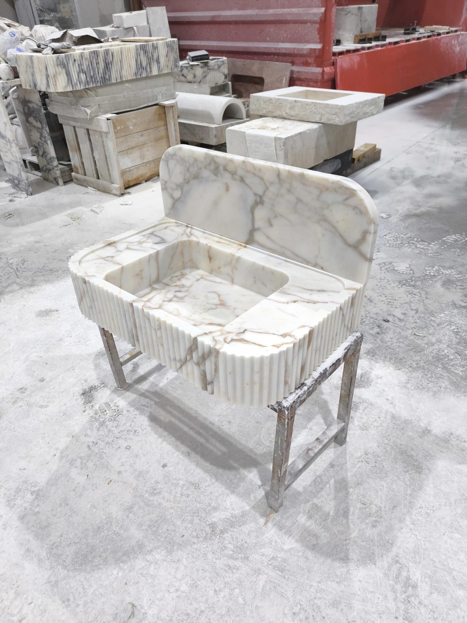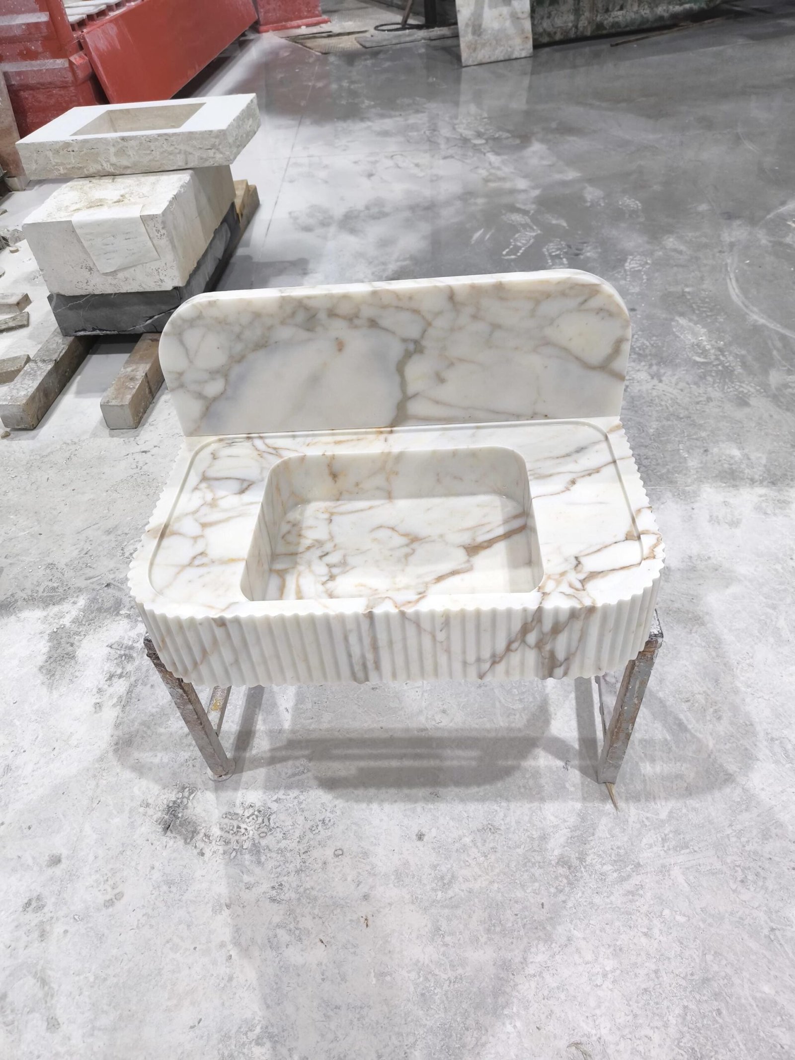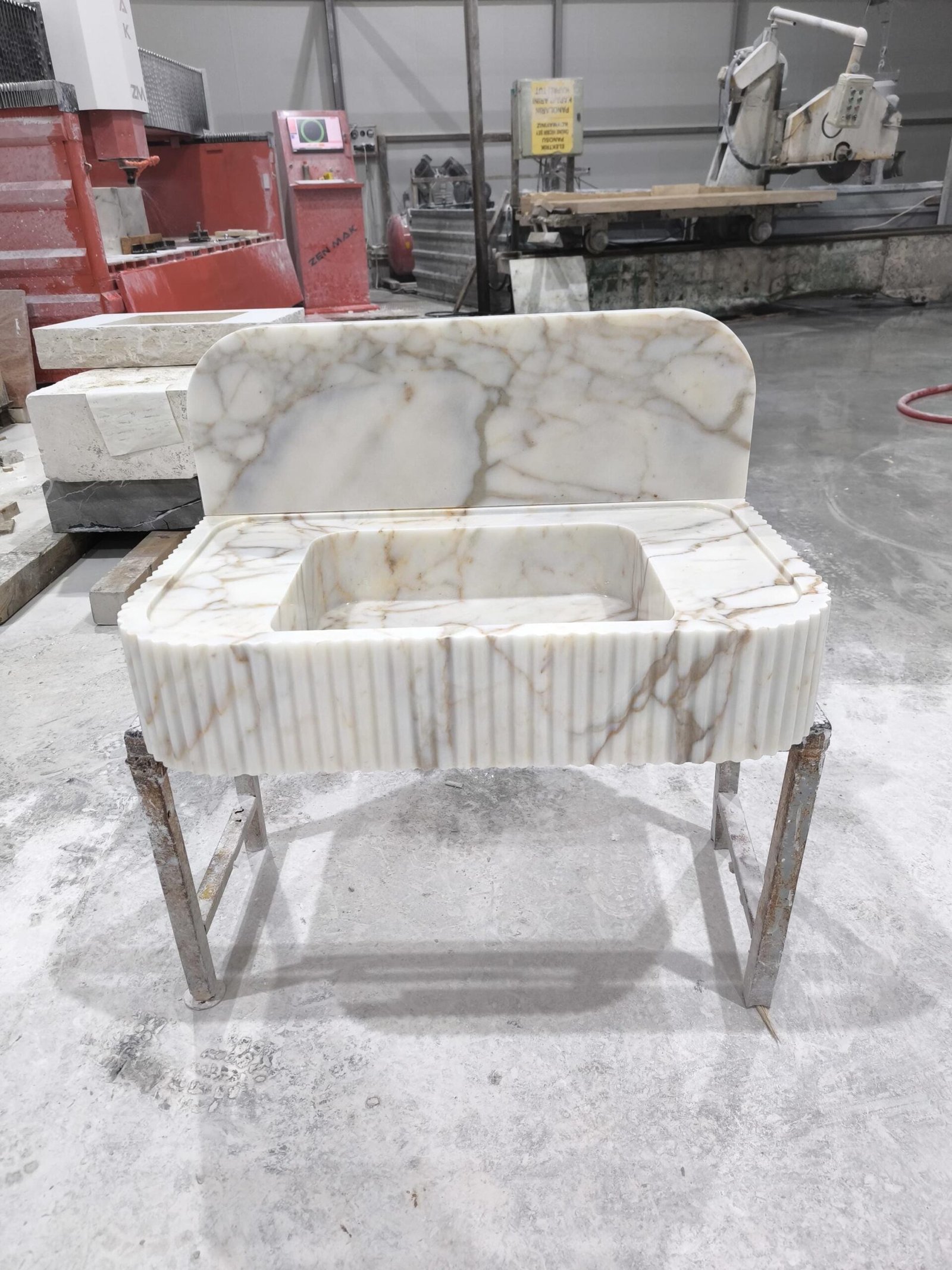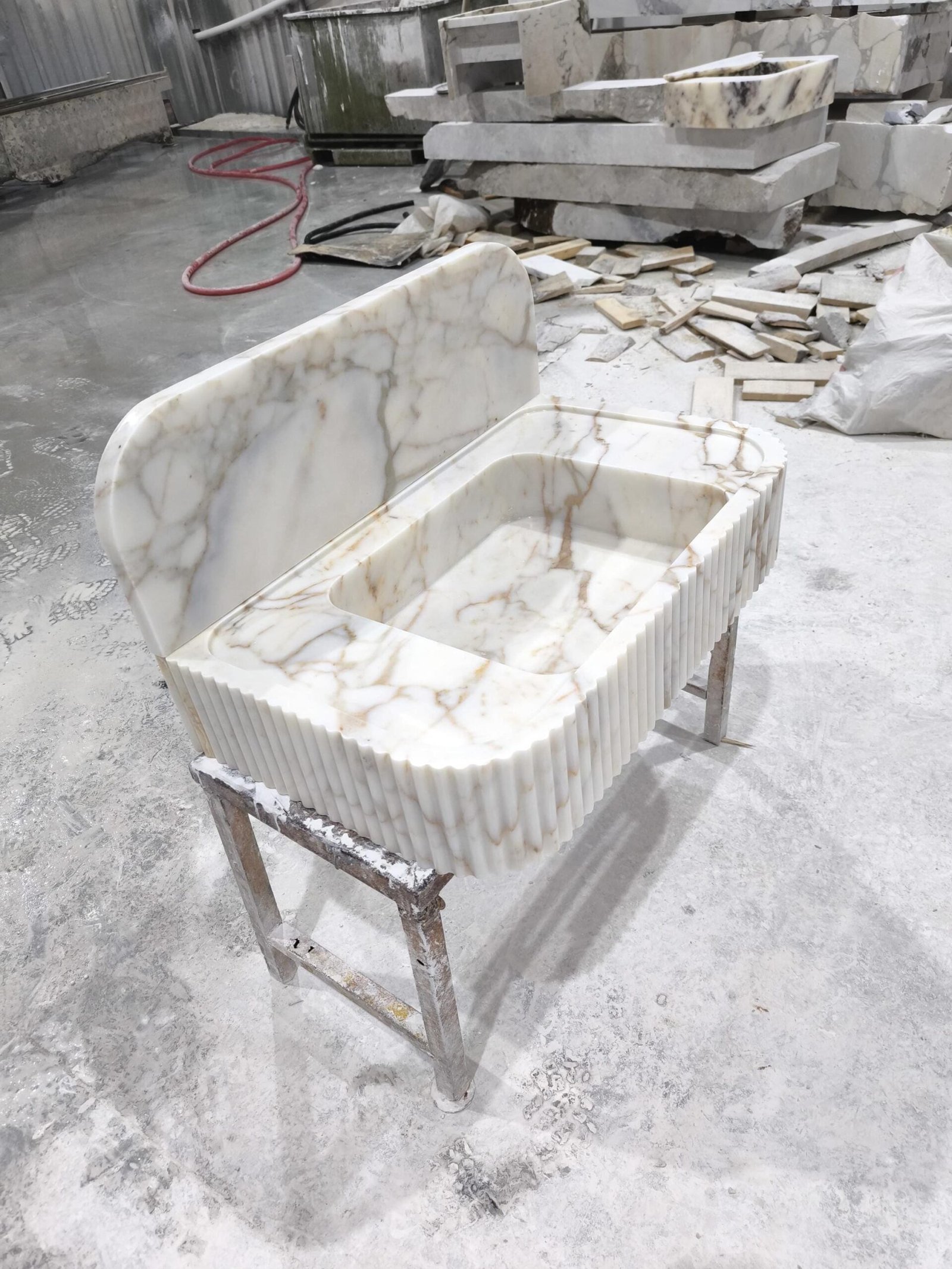 🛁Refined, radiant, and rooted in timeless style — this Calacatta Gold Marble Sink brings serene elegance to modern interiors. Its creamy stone base is traced with delicate golden veins, framed in a fluted front and topped with a sweeping 10” curved backsplash.🎯Sized at 18x30x6”, it’s a functional showpiece for those who curate calm, spa-like spaces with sculptural form.🪨Hand-carved from solid natural marble with unmatched precision.⚒️Perfect for designer homes, boutique projects, or architectural renovations.🎁Carefully packed and protected, this handmade basin is built to inspire across generations.🛡️Durable, sealed, and designed to age beautifully with time and use.