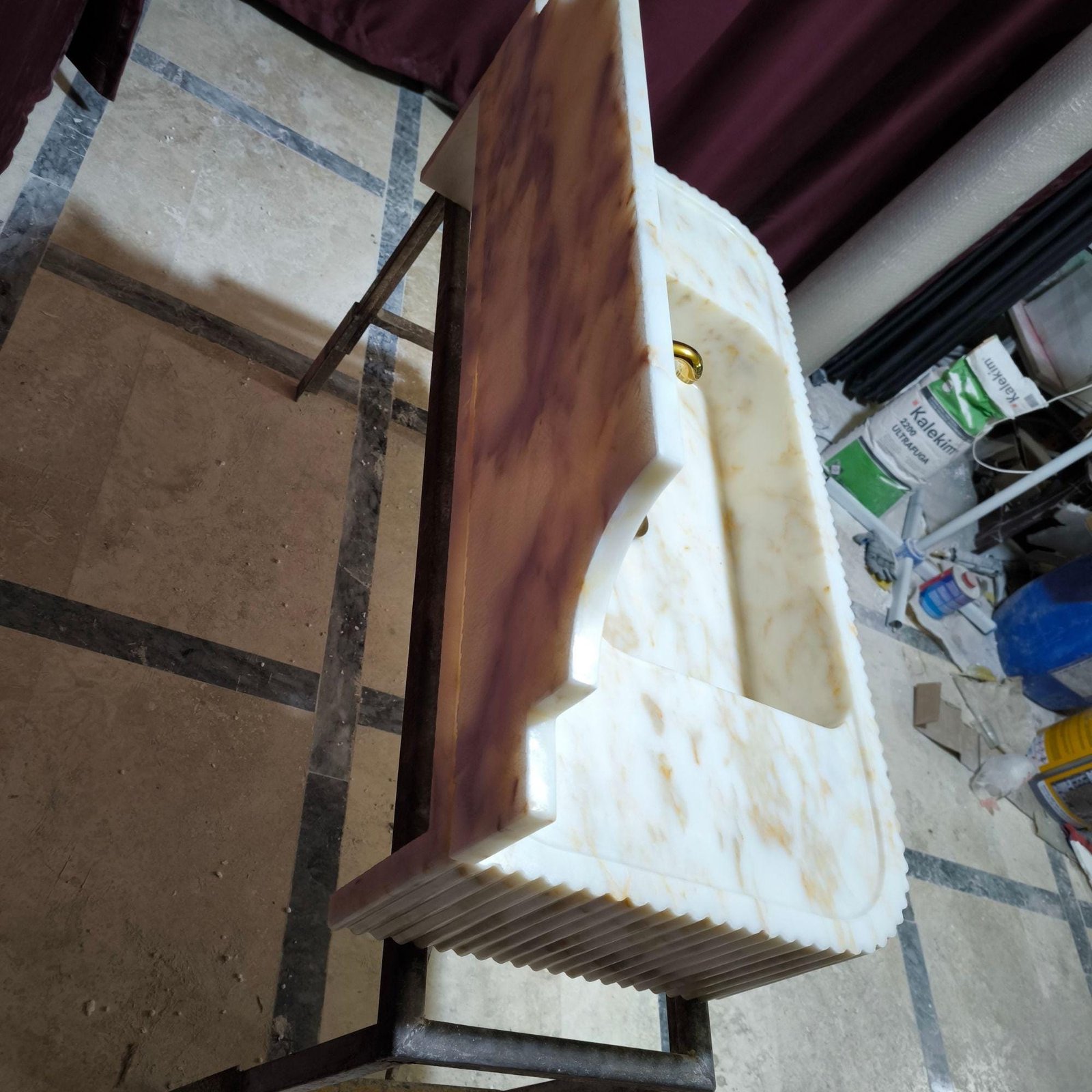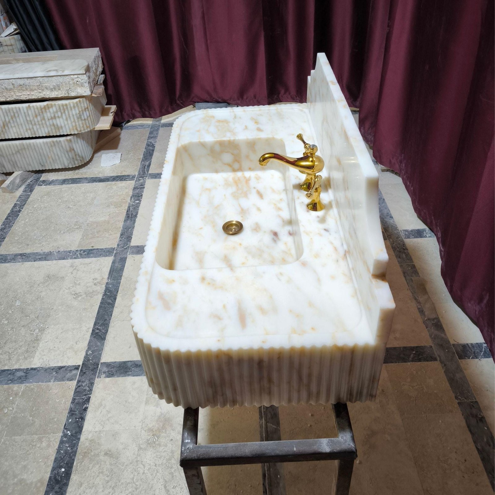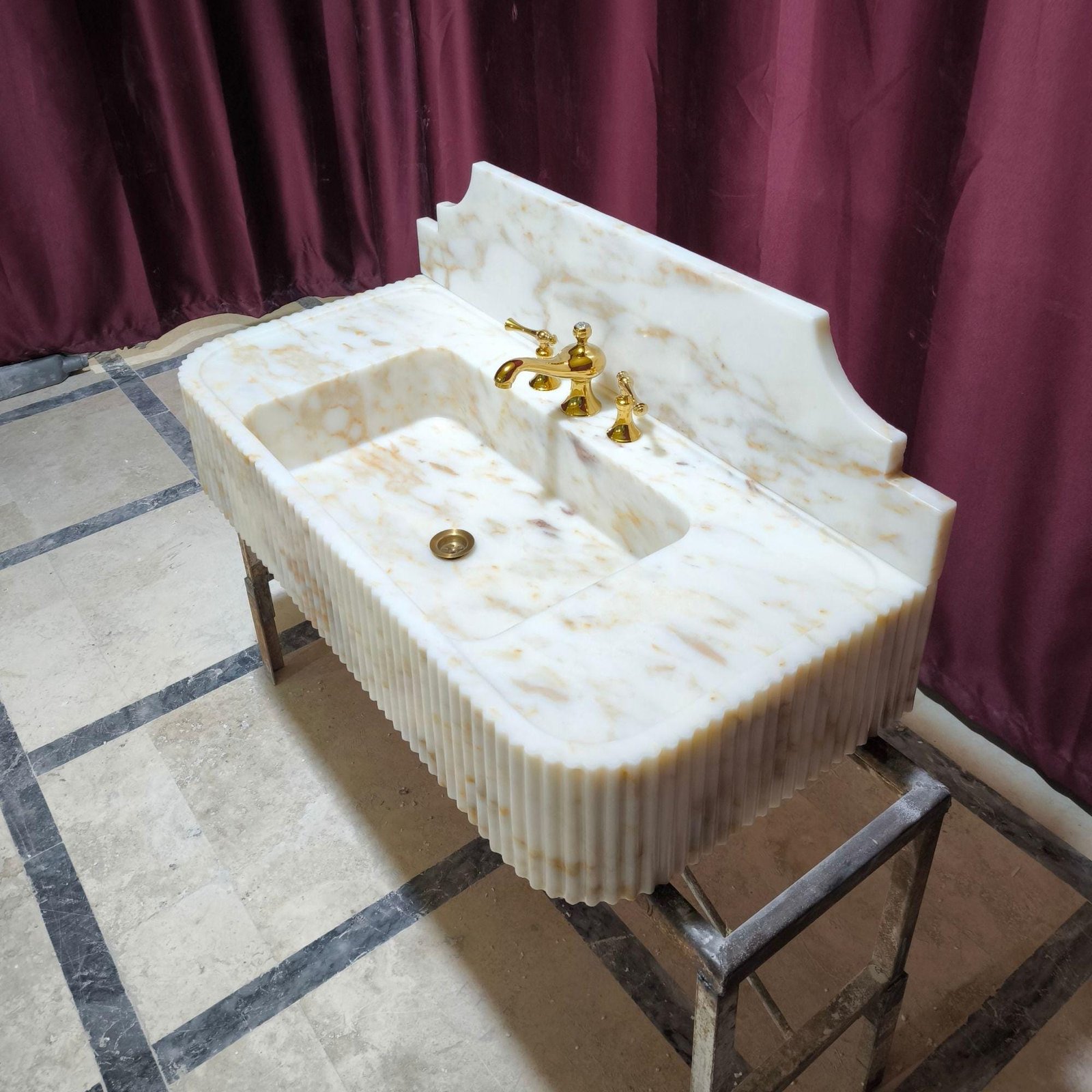 Measuring 20 x 42 x 8 inches with a 10 inch backsplash, this extended stone vanity sink offers generous space while maintaining a floating, modern aesthetic. The fluted exterior adds depth and texture, enhancing light and shadow for a sophisticated, design-forward finish.