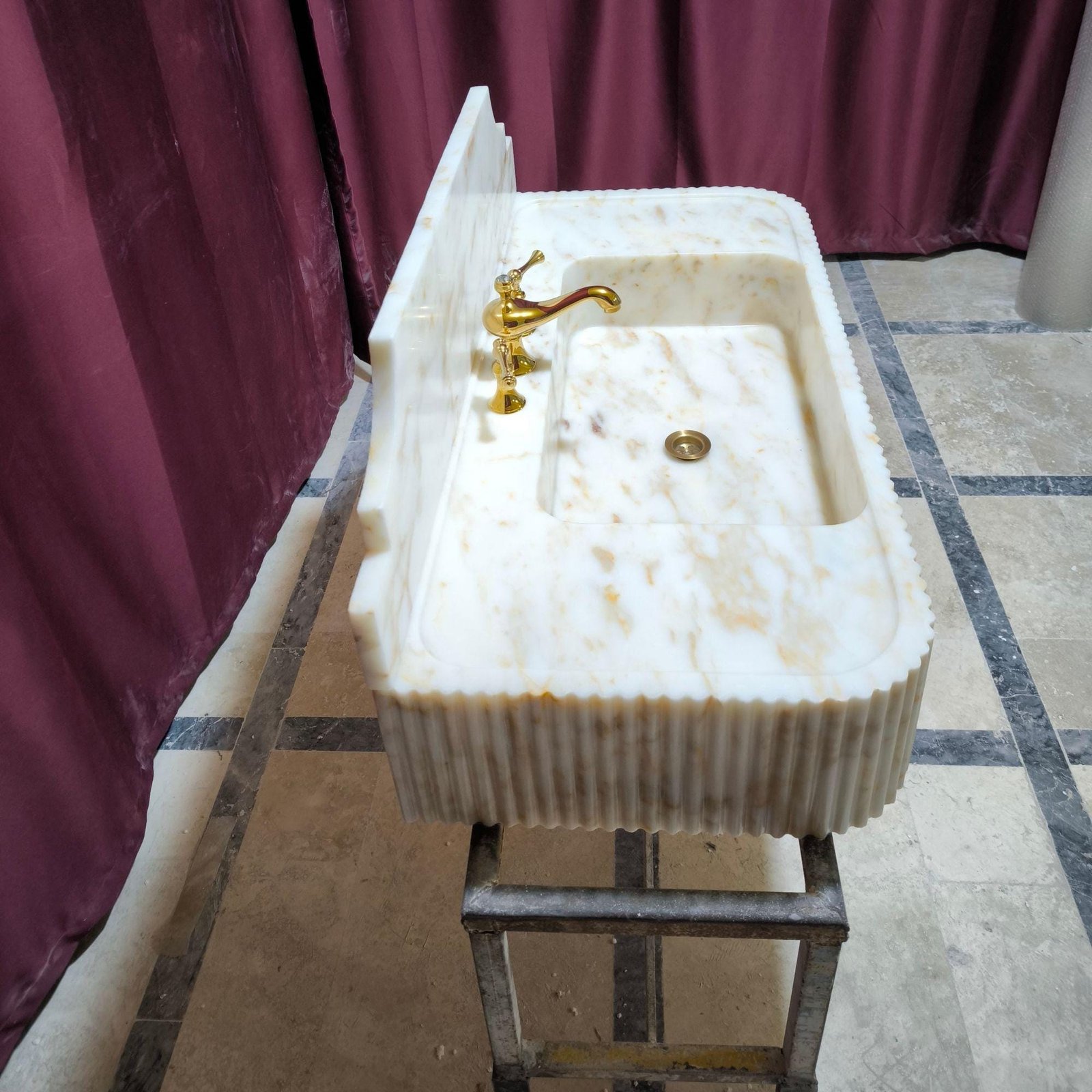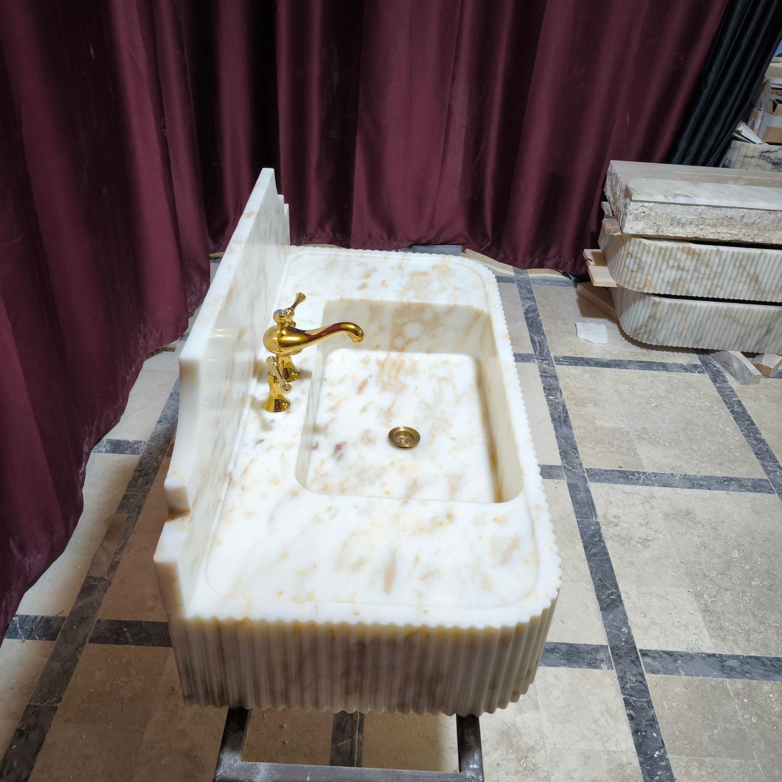 This Calacatta Gold marble wall mount sink with integrated backsplash delivers architectural presence and refined natural beauty in one sculptural piece. Hand-carved from premium marble, the warm gold veining flows across a creamy white base, creating a timeless focal point for luxury bathrooms.