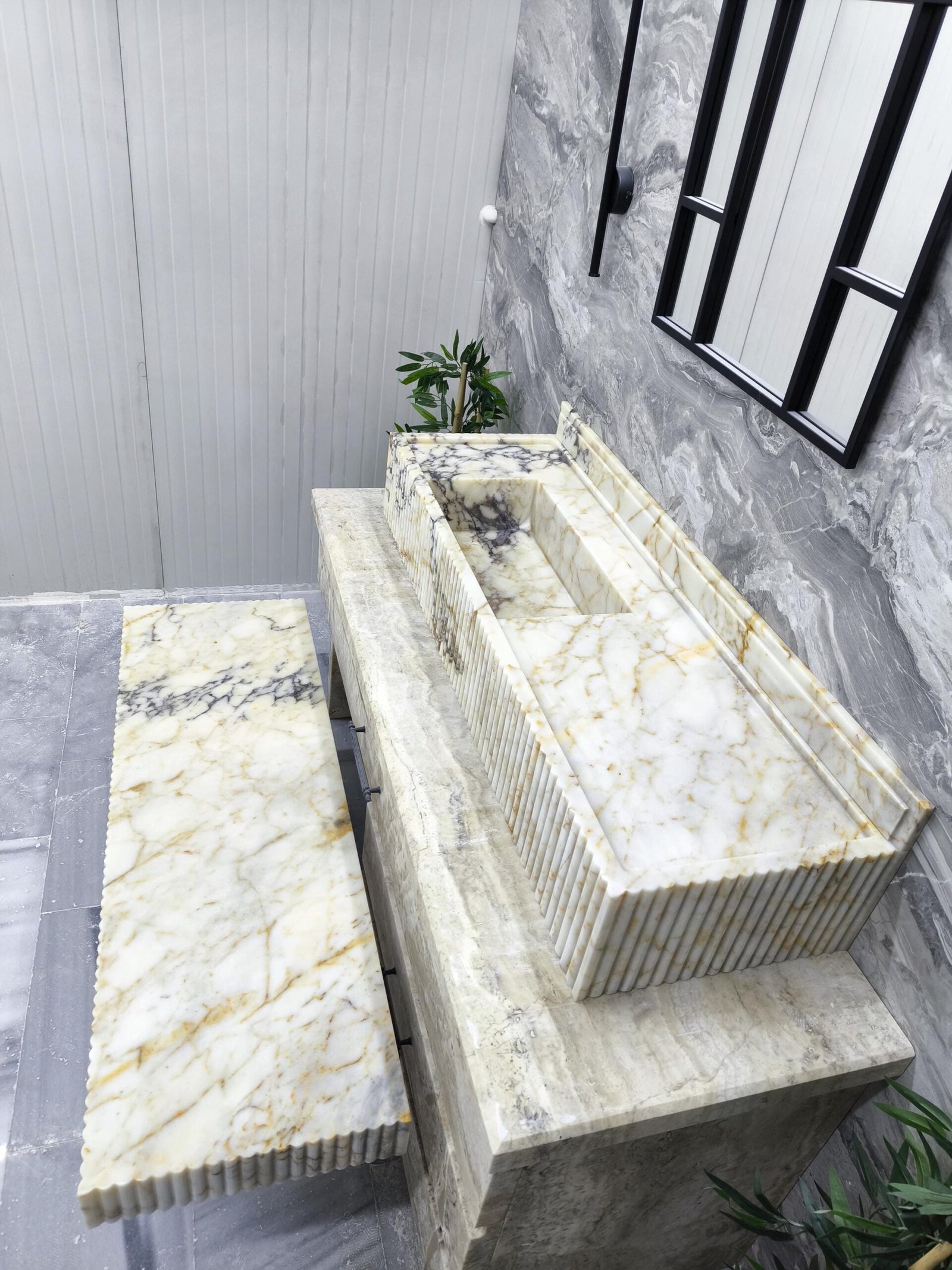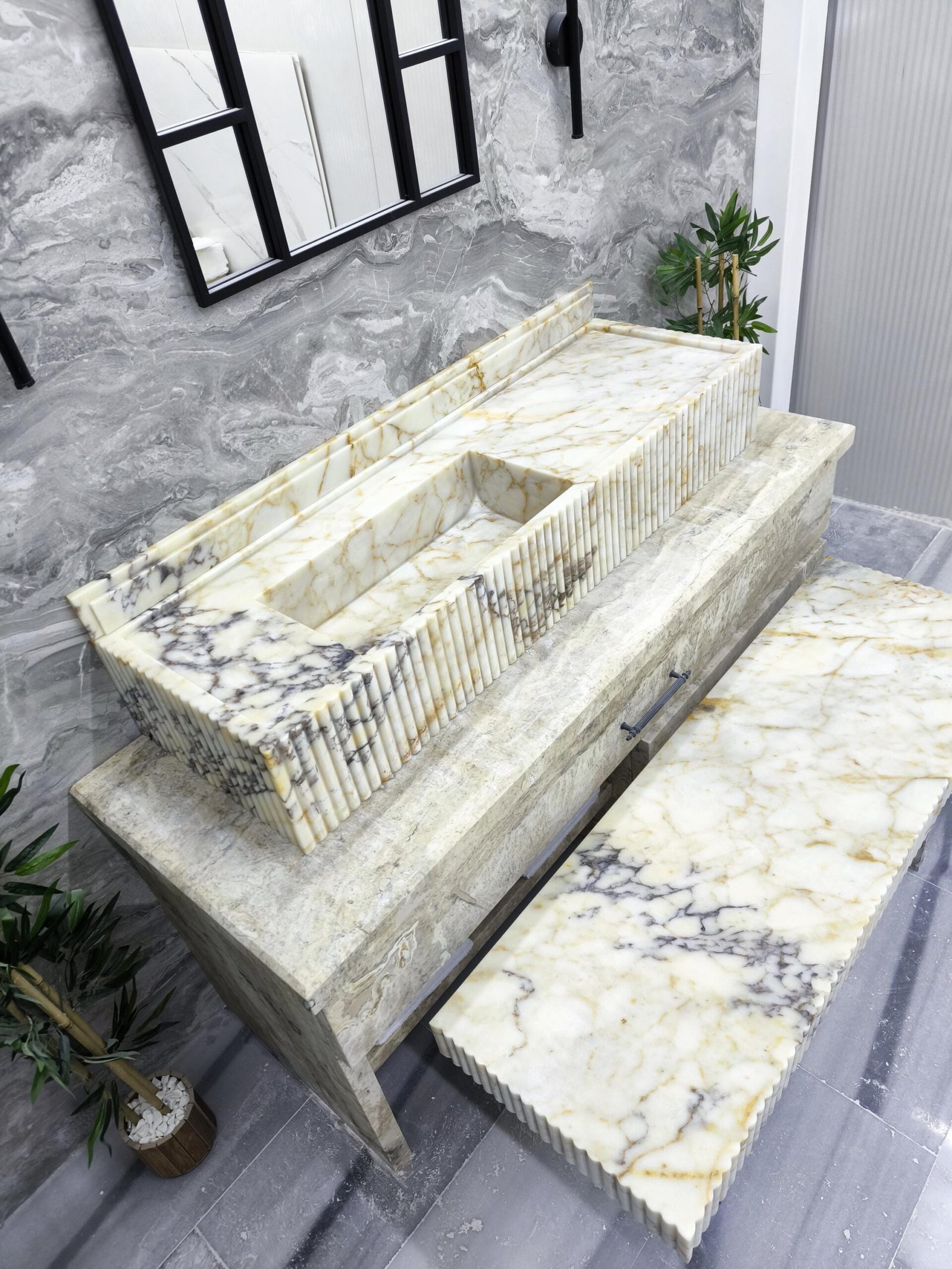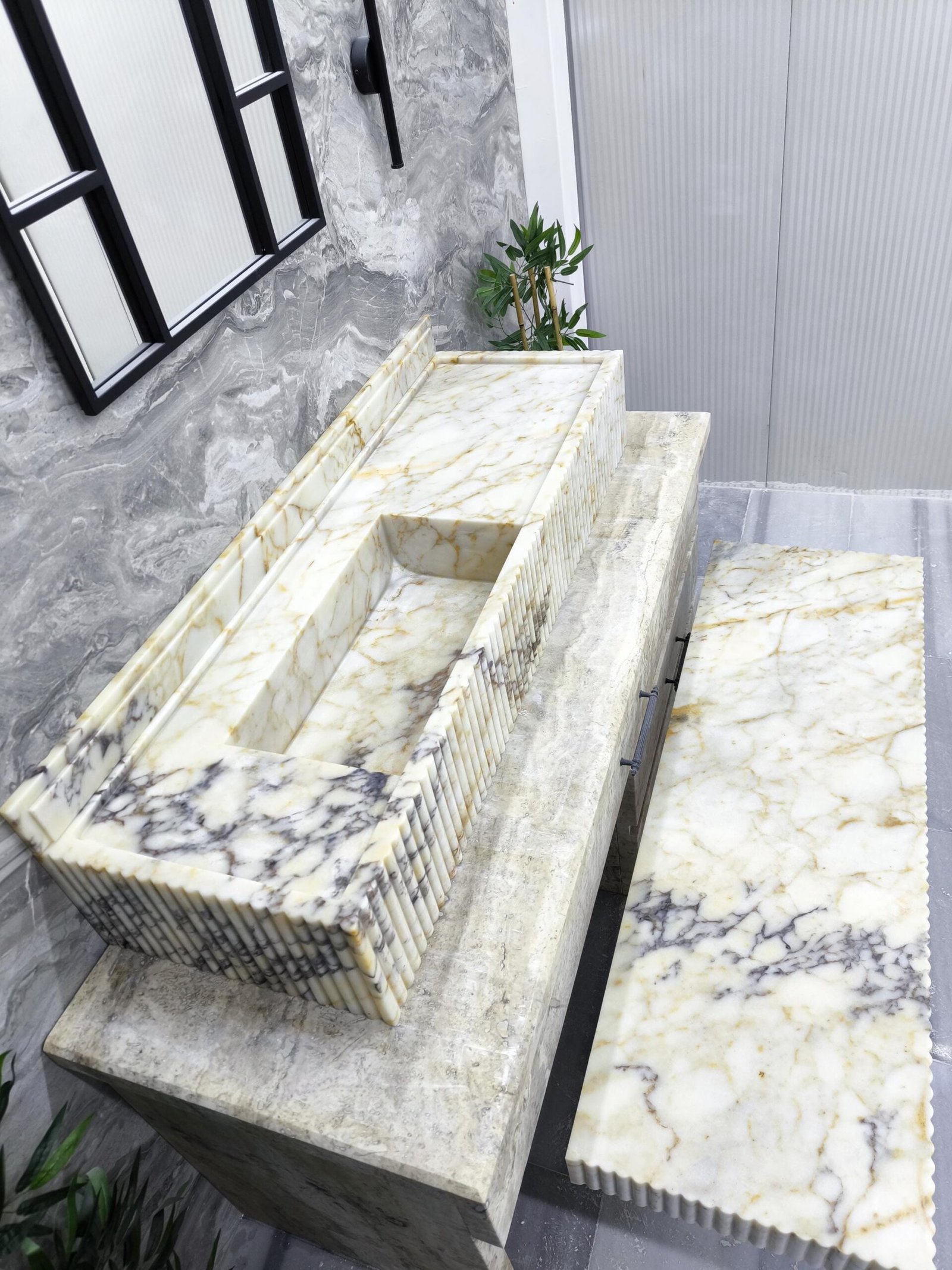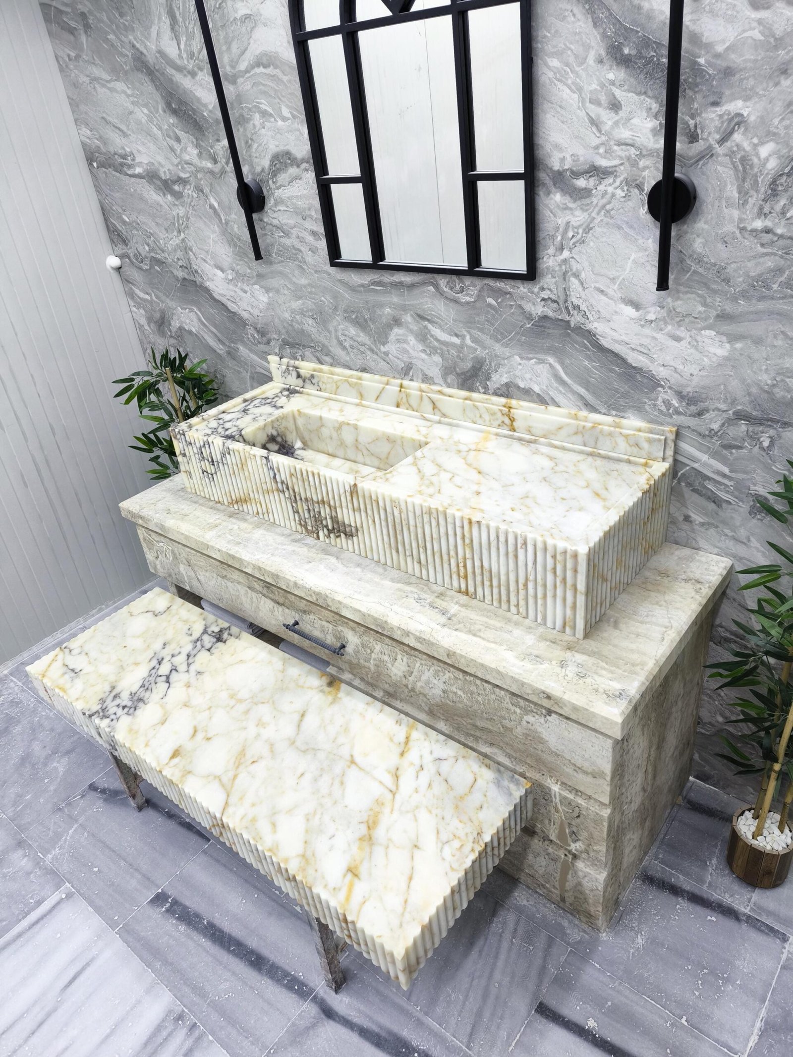 Designed for statement bathrooms and curated interiors, the fluted detail adds refined texture while the extended silhouette enhances the sense of architectural luxury. This matching duo is handcrafted, polished, and ready to ship for your next high-end project.