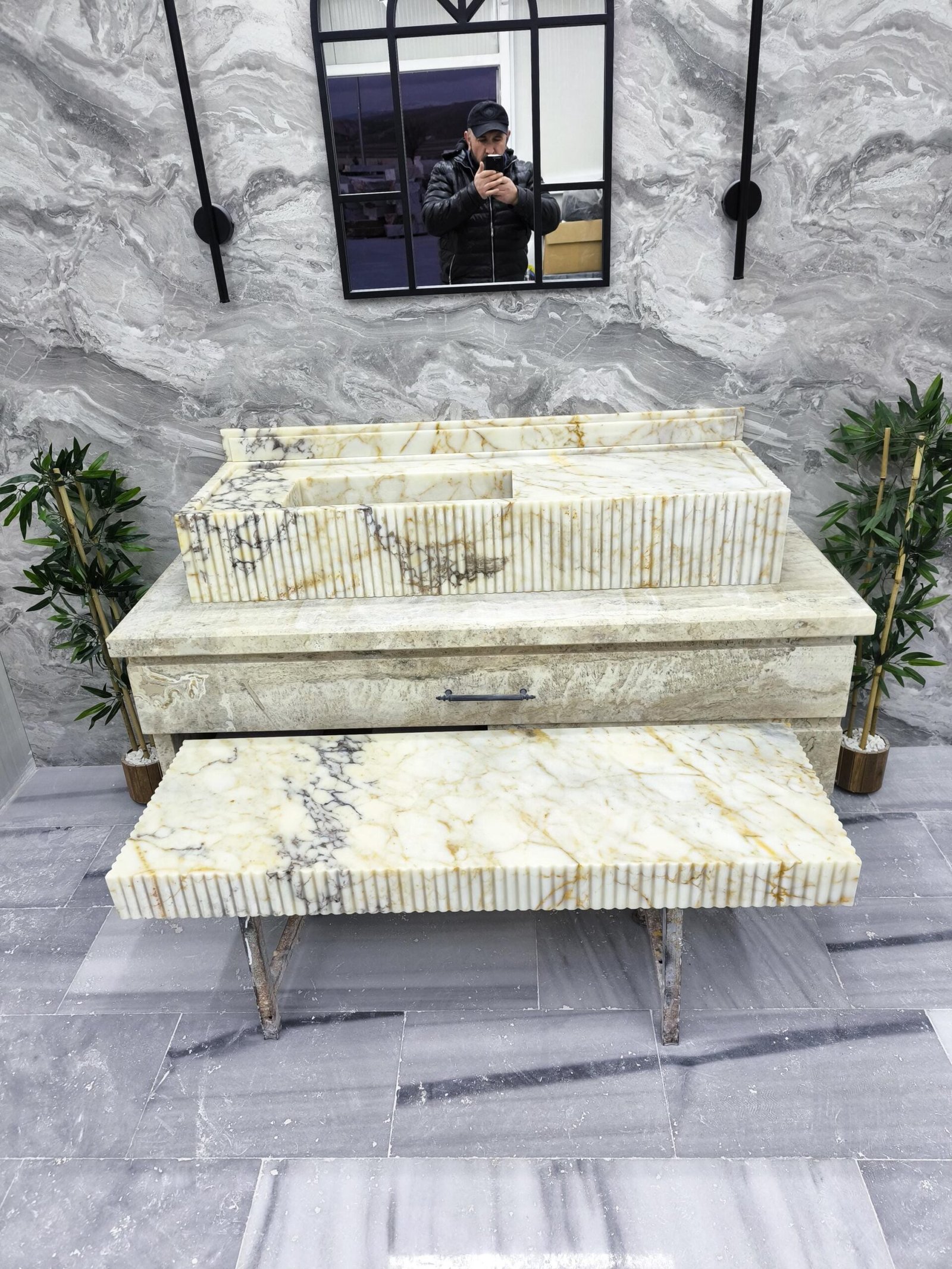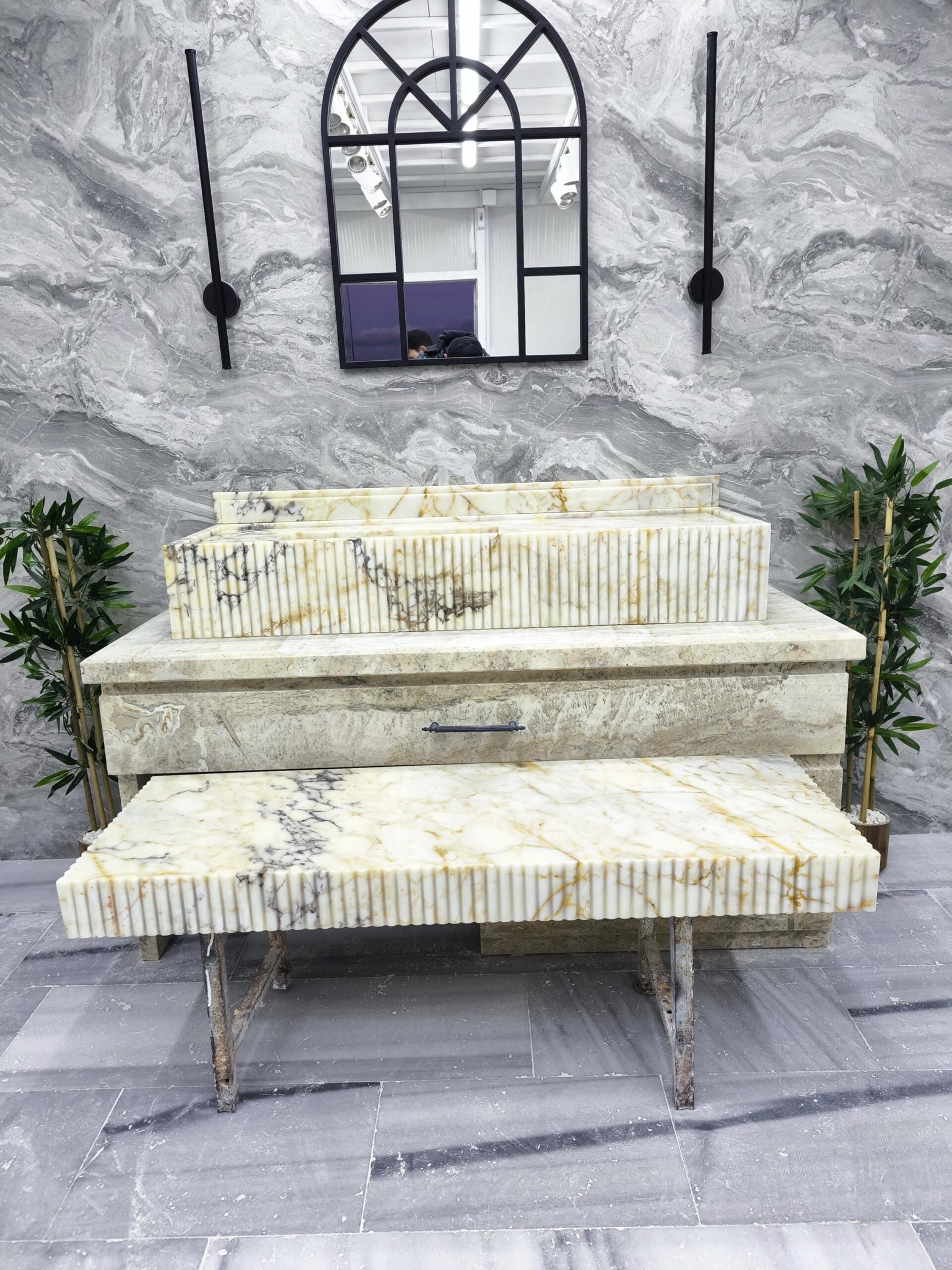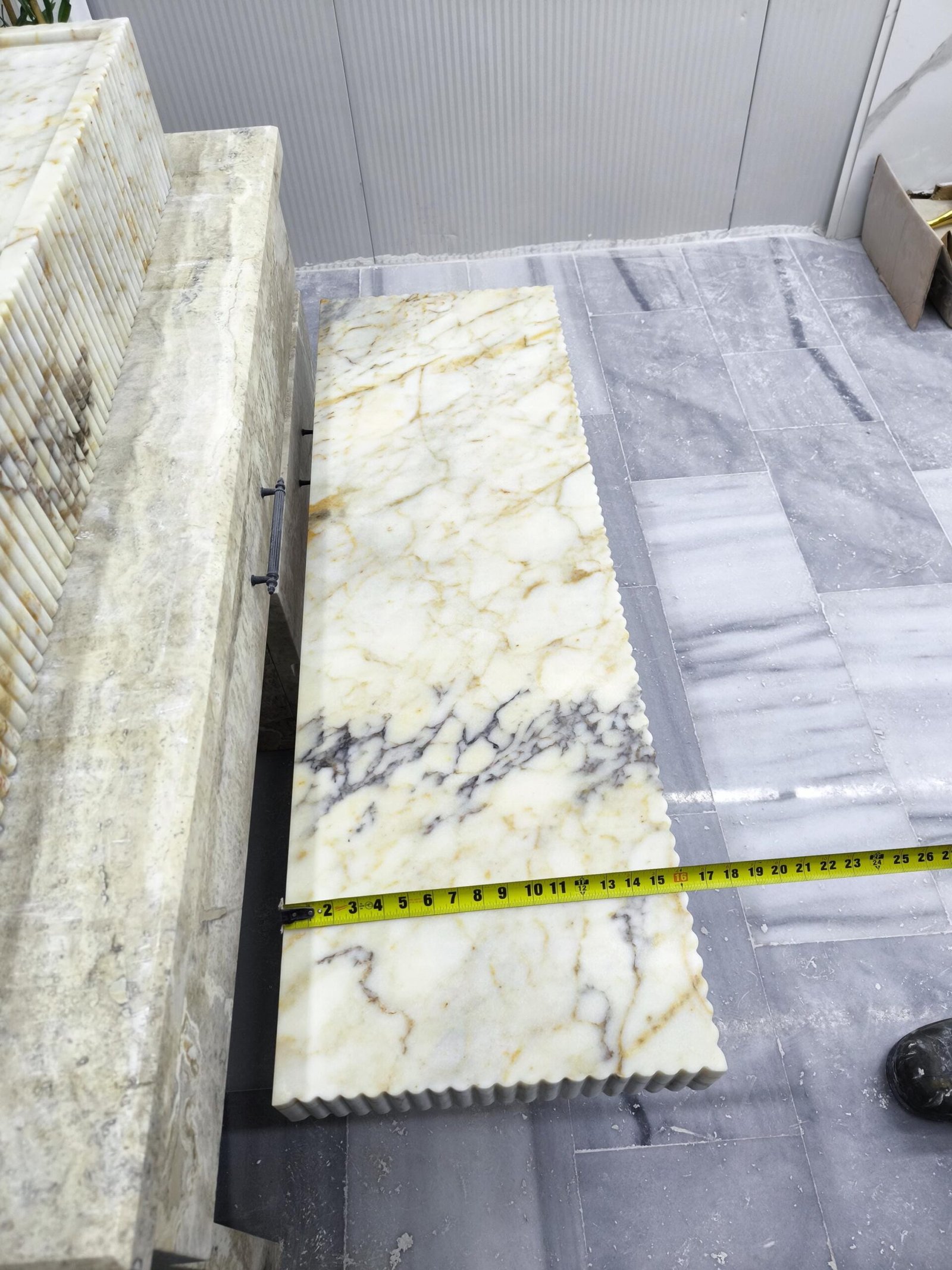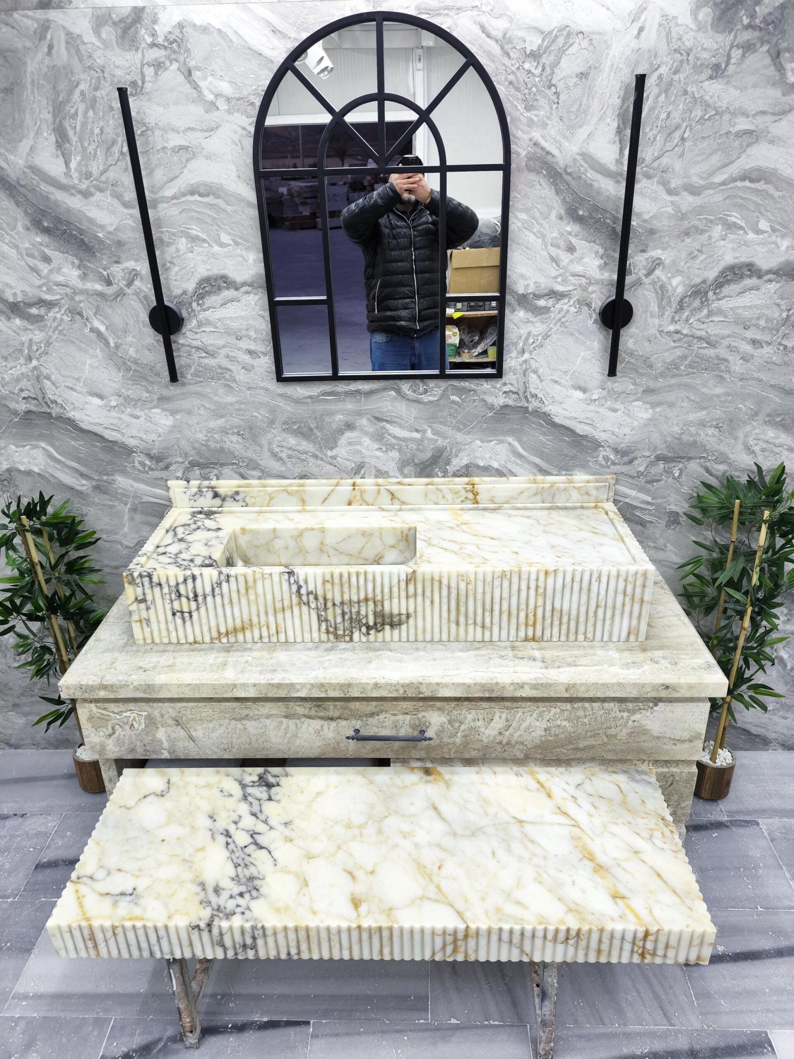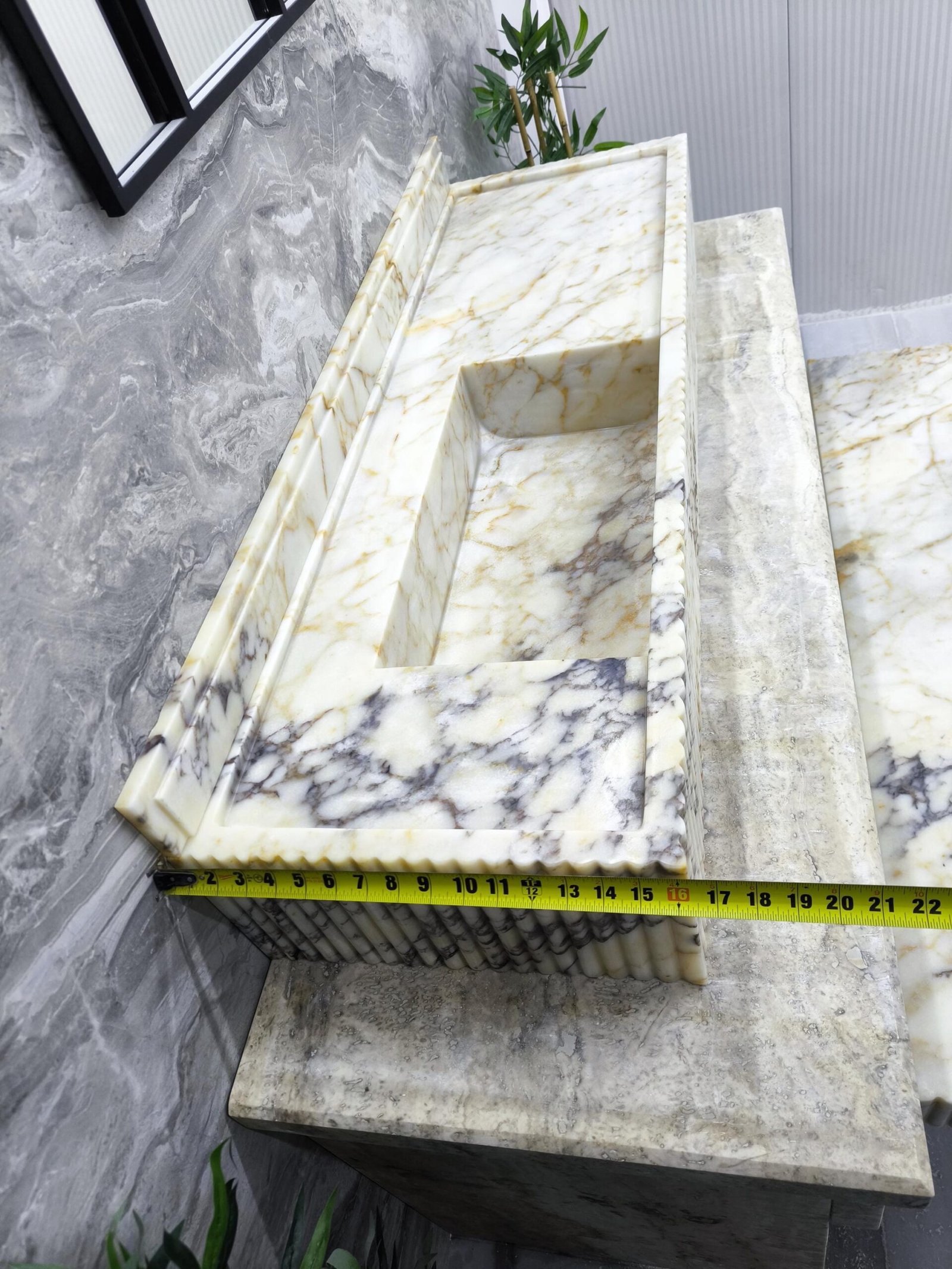 Designed for statement bathrooms and curated interiors, the fluted detail adds refined texture while the extended silhouette enhances the sense of architectural luxury. This matching duo is handcrafted, polished, and ready to ship for your next high-end project.