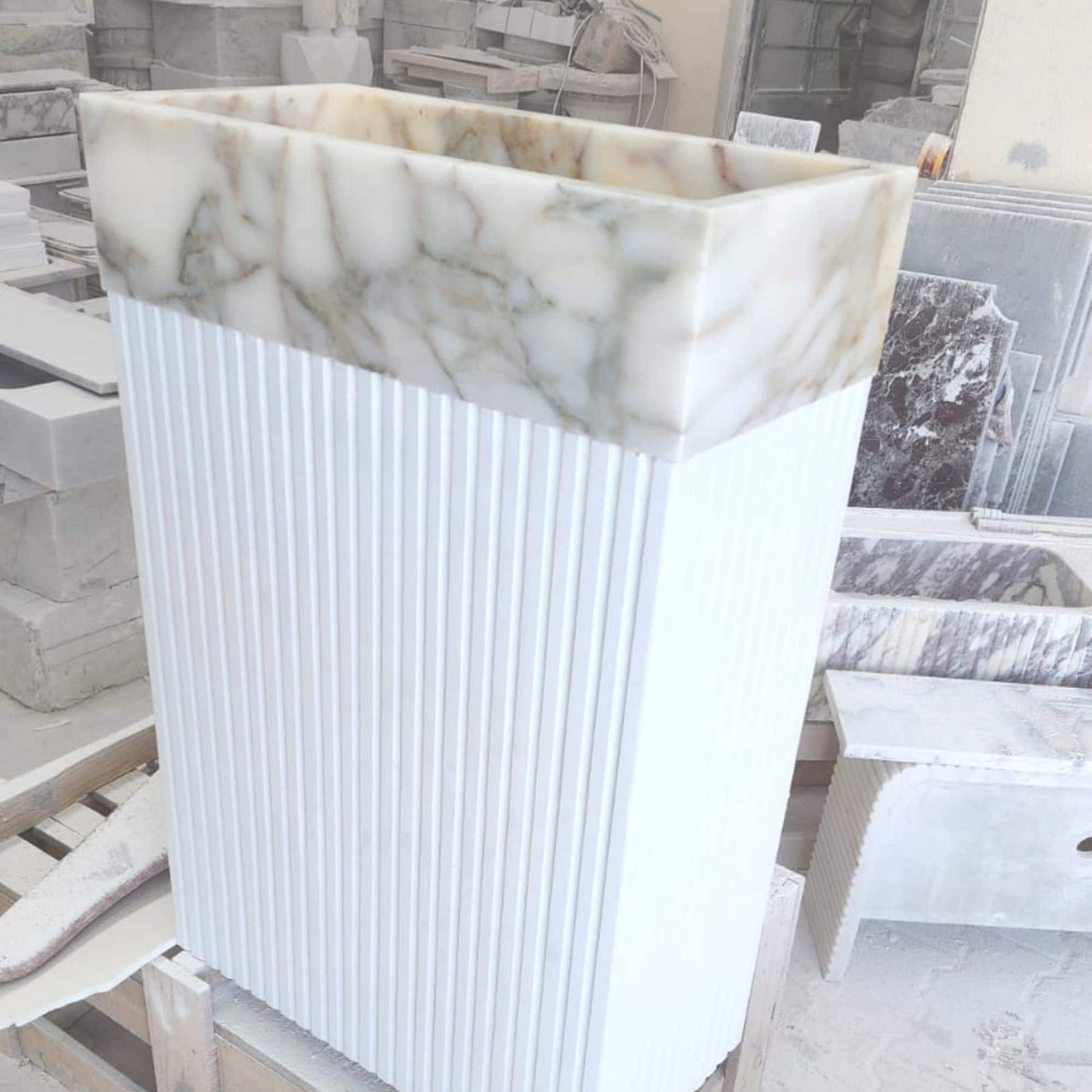 Elevate your bathroom with our Custom Calacatta Monet Marble Sink — a statement of handcrafted elegance and sculptural beauty. This luxurious freestanding pedestal sink features the dramatic veining of Calacatta Monet marble contrasted against a sleek limestone base, offering both visual impact and timeless charm.