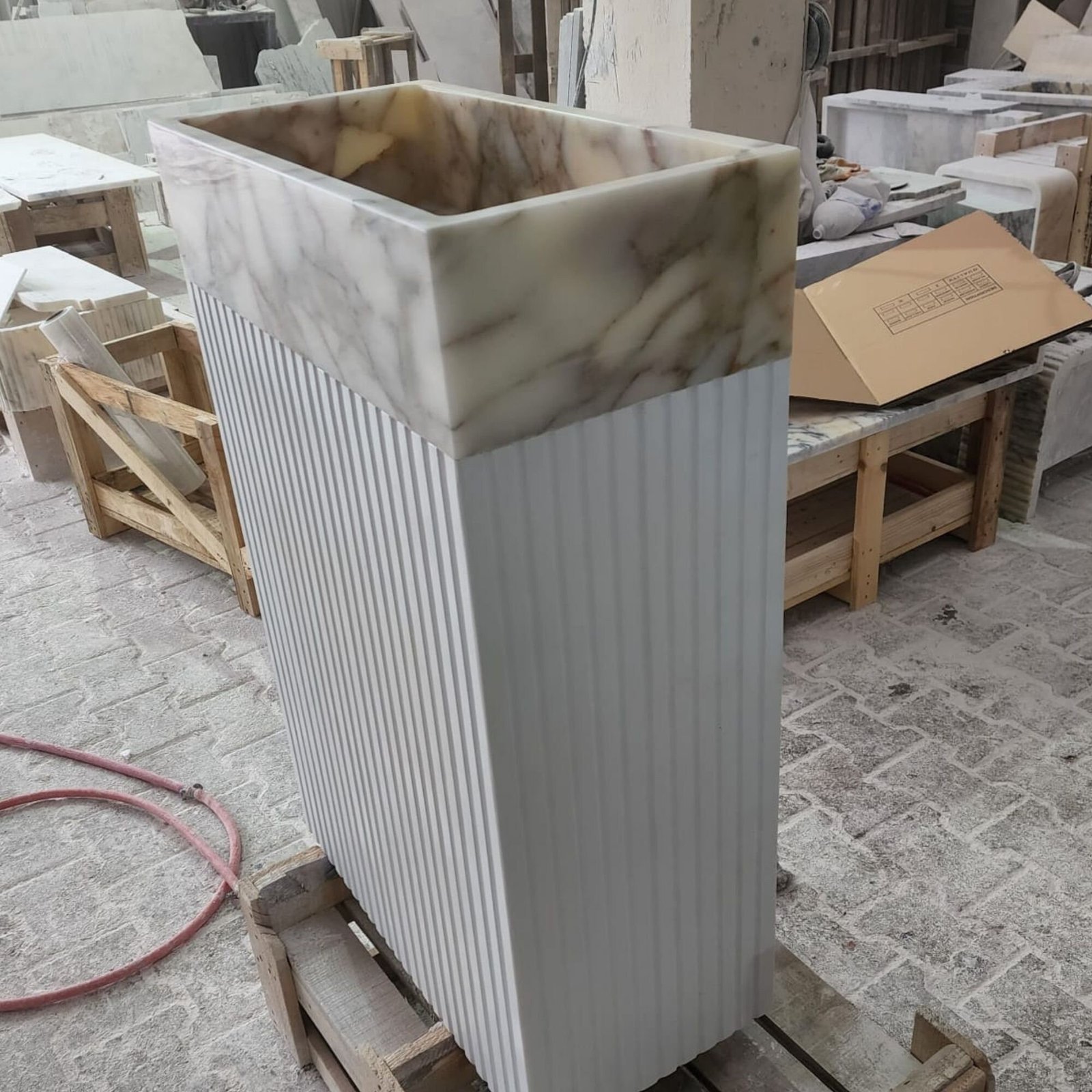 • Material: Calacatta Monet Marble with Limestone Pedestal
