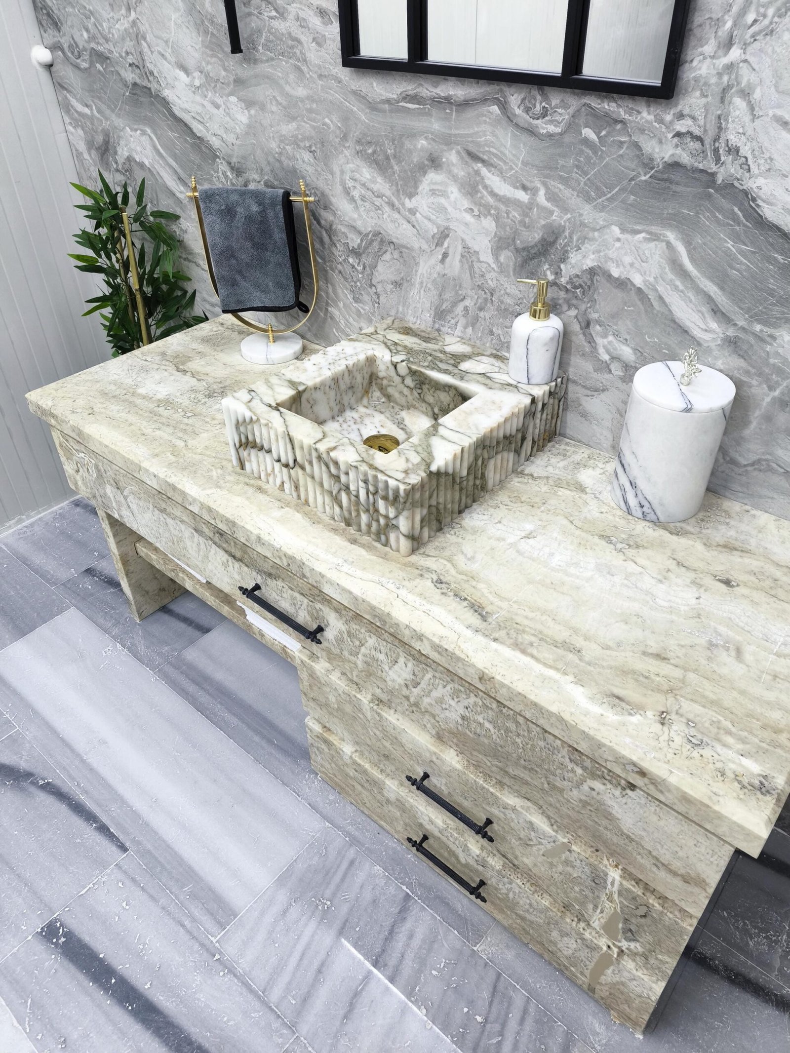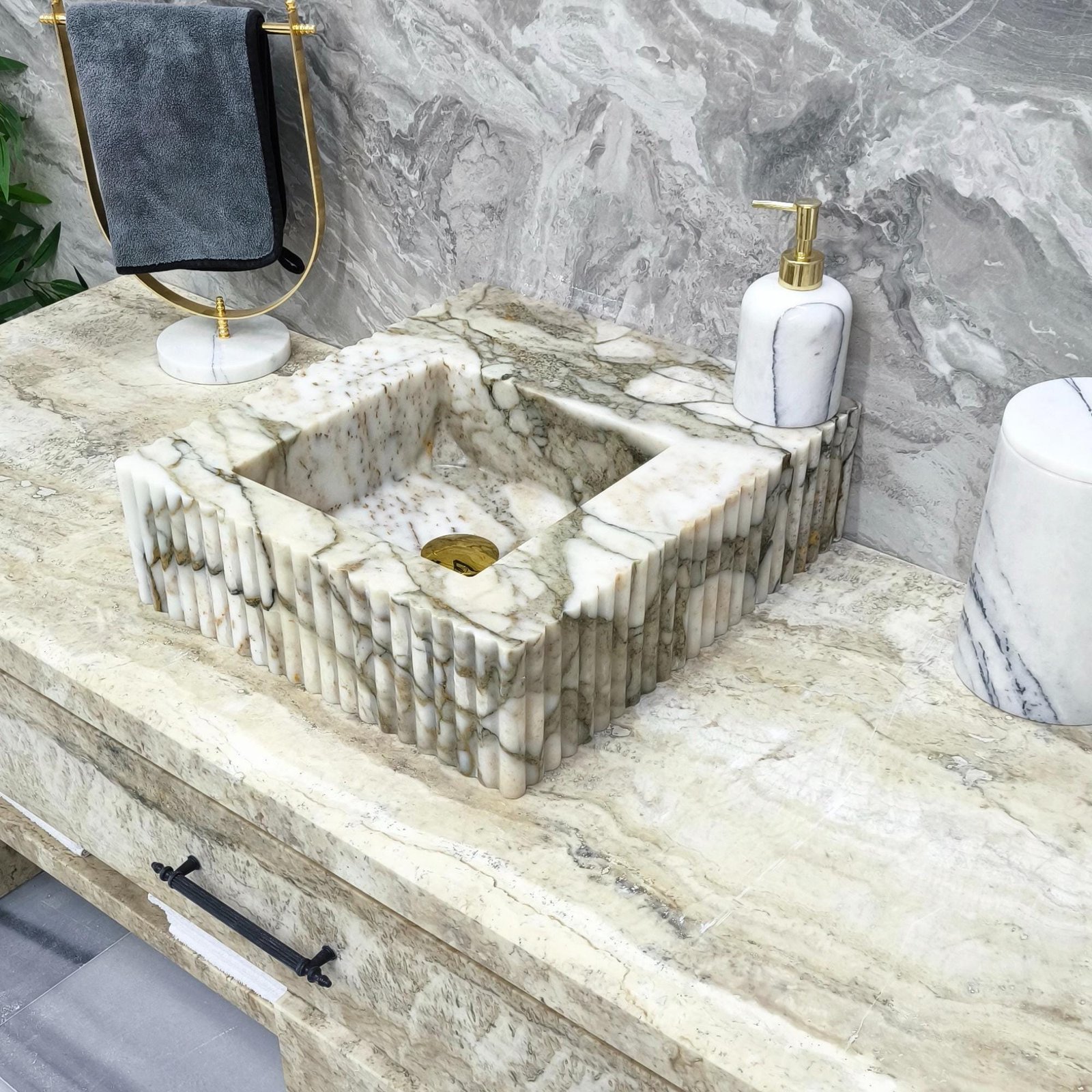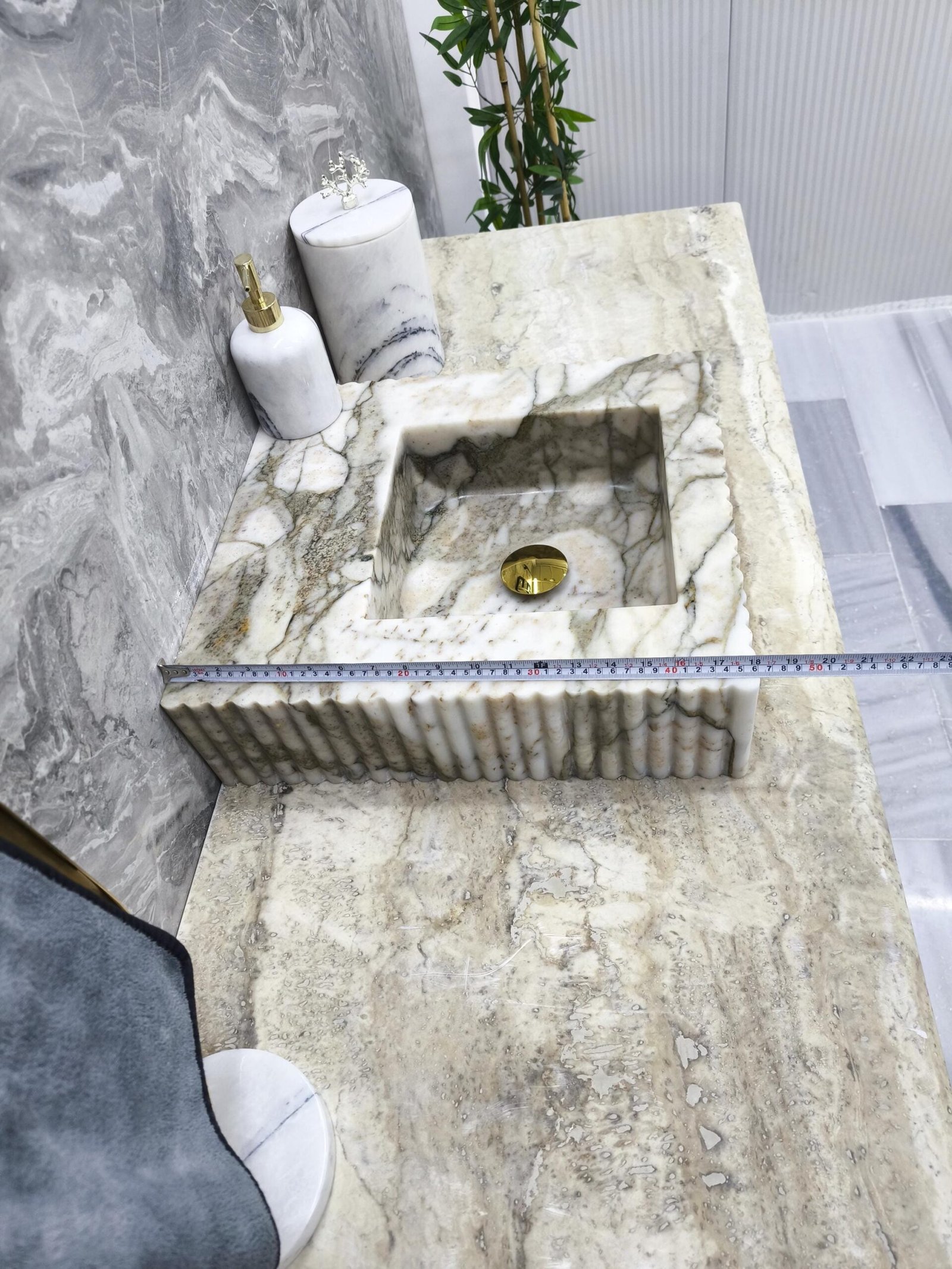 Compact and luxurious, this artisan piece transforms powder rooms or vanity tops into refined sanctuaries. The grooved face detail offers a tactile and visual statement that blends seamlessly with both modern and classic interiors.