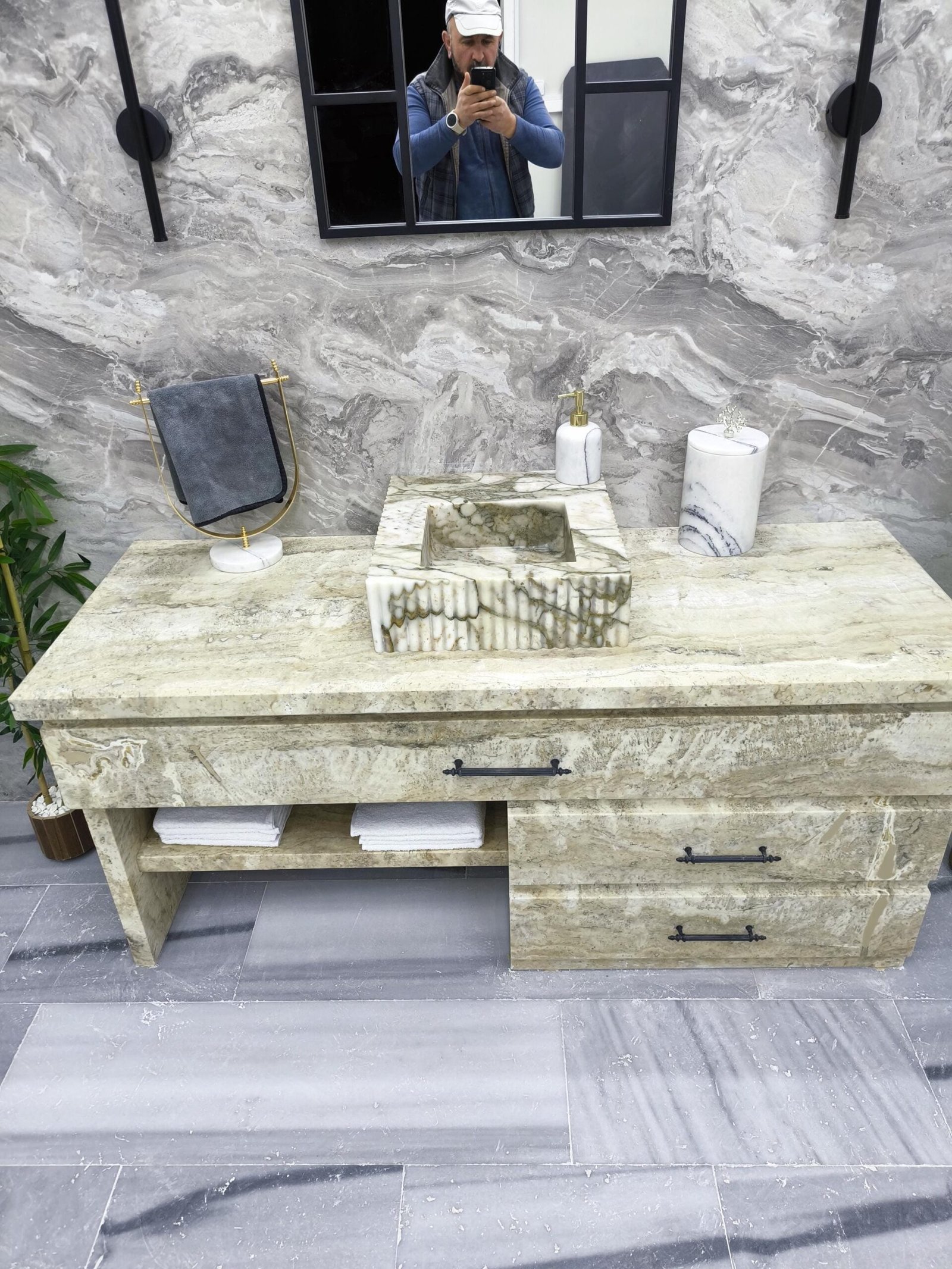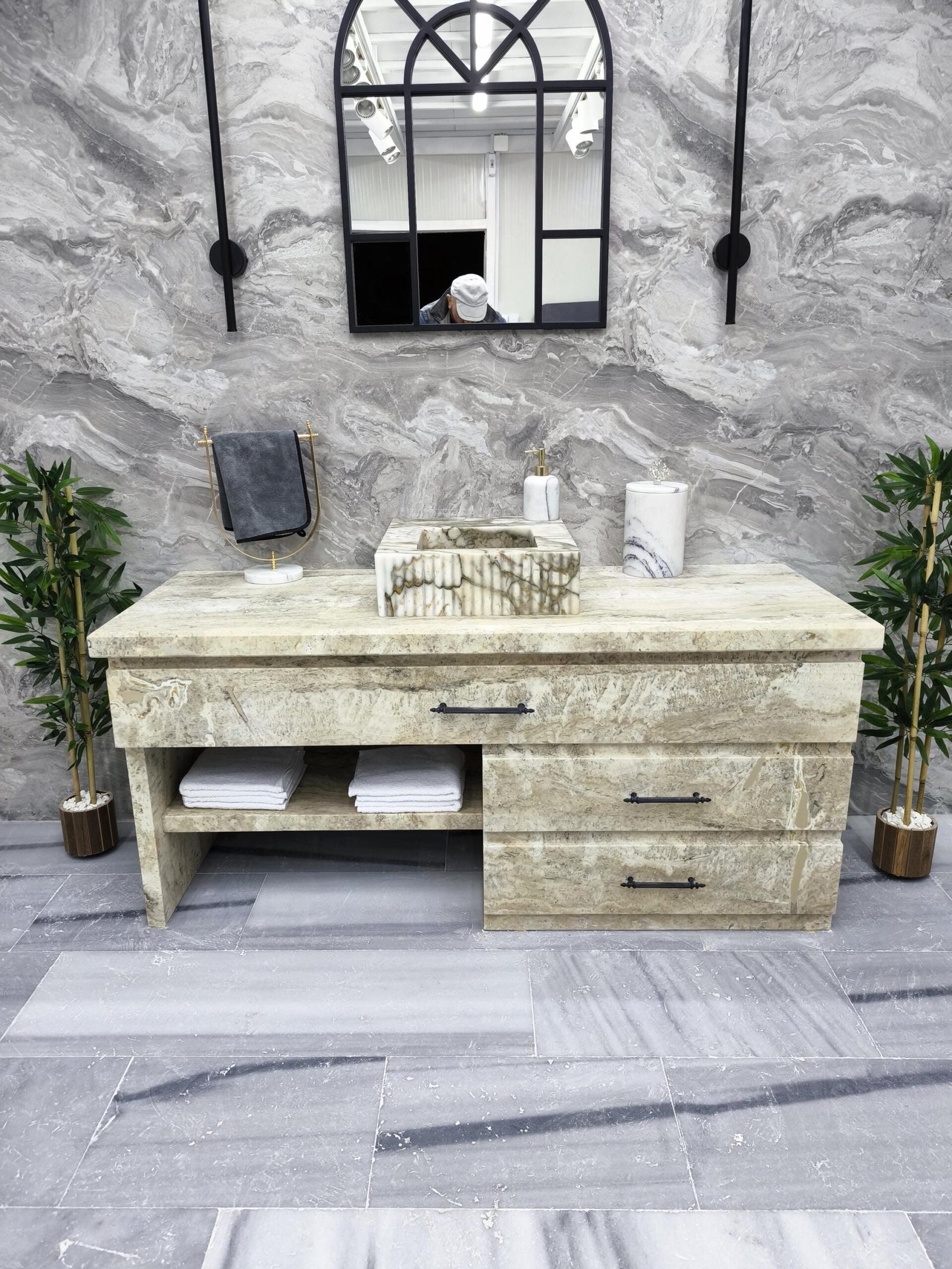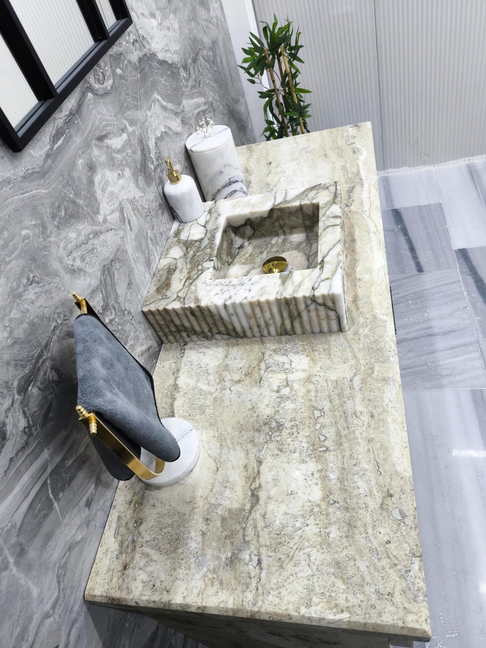 Compact and luxurious, this artisan piece transforms powder rooms or vanity tops into refined sanctuaries. The grooved face detail offers a tactile and visual statement that blends seamlessly with both modern and classic interiors.