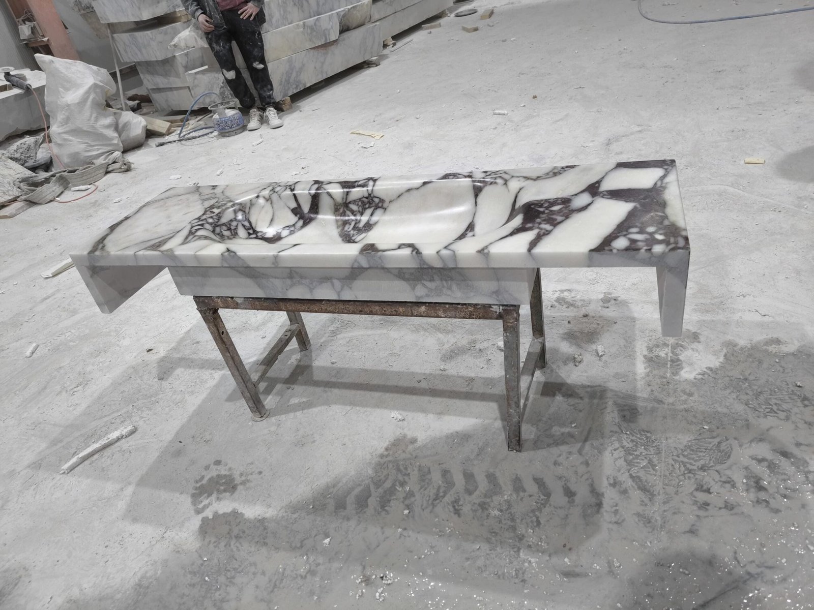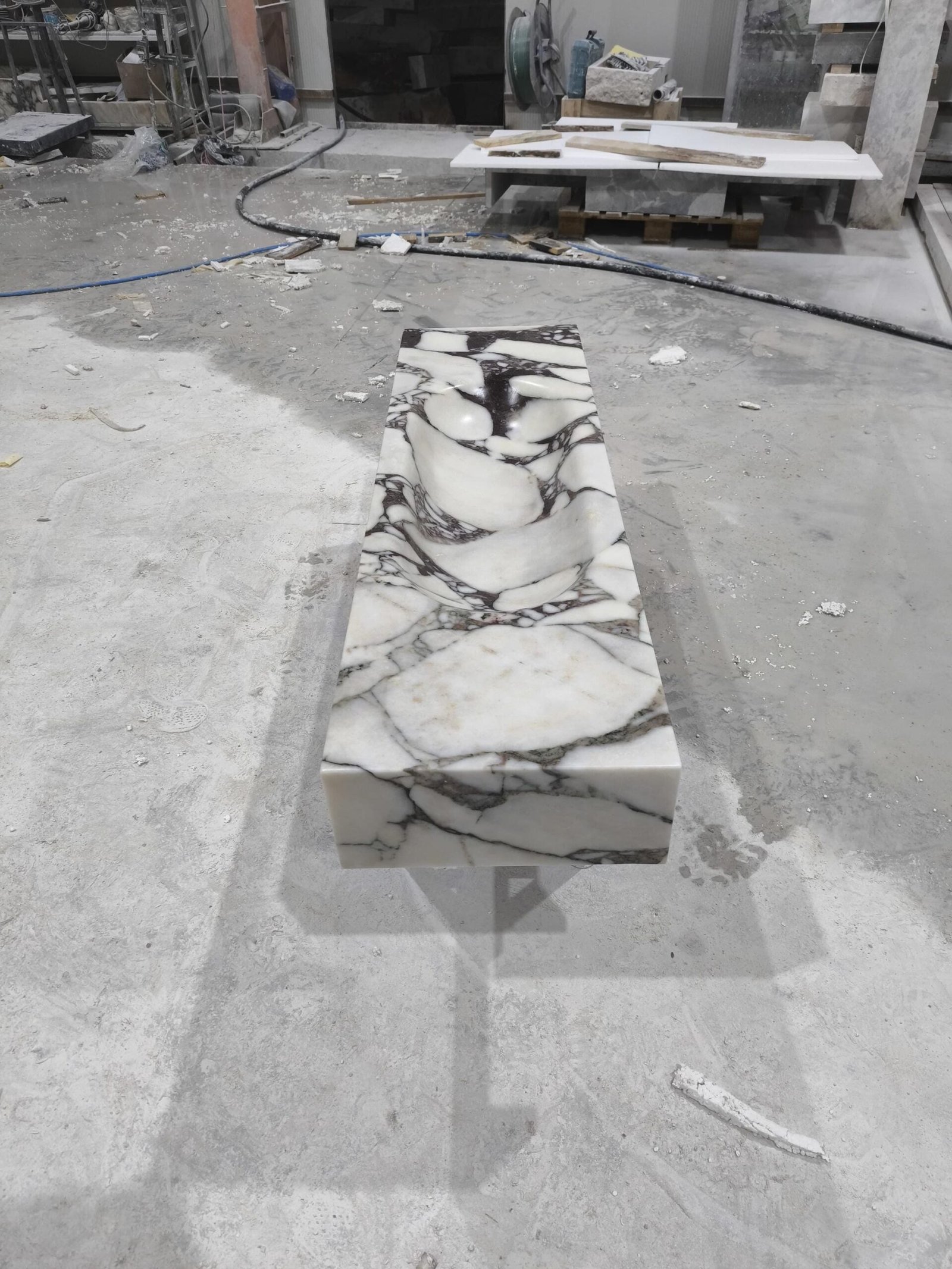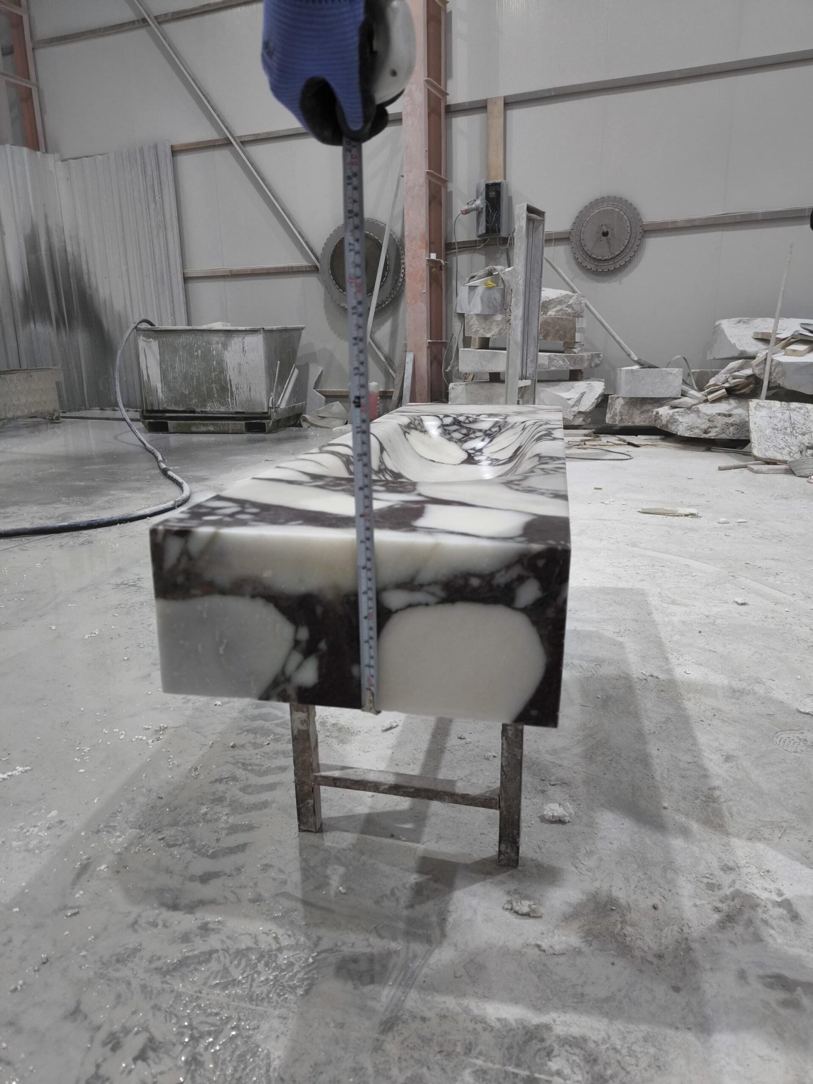 Transform your bathroom into a gallery of natural beauty with this handmade Calacatta Monet marble sink, expertly crafted from premium natural stone. Featuring rich purple and grey veining on a creamy white background, every piece is a one-of-a-kind statement of elegance.