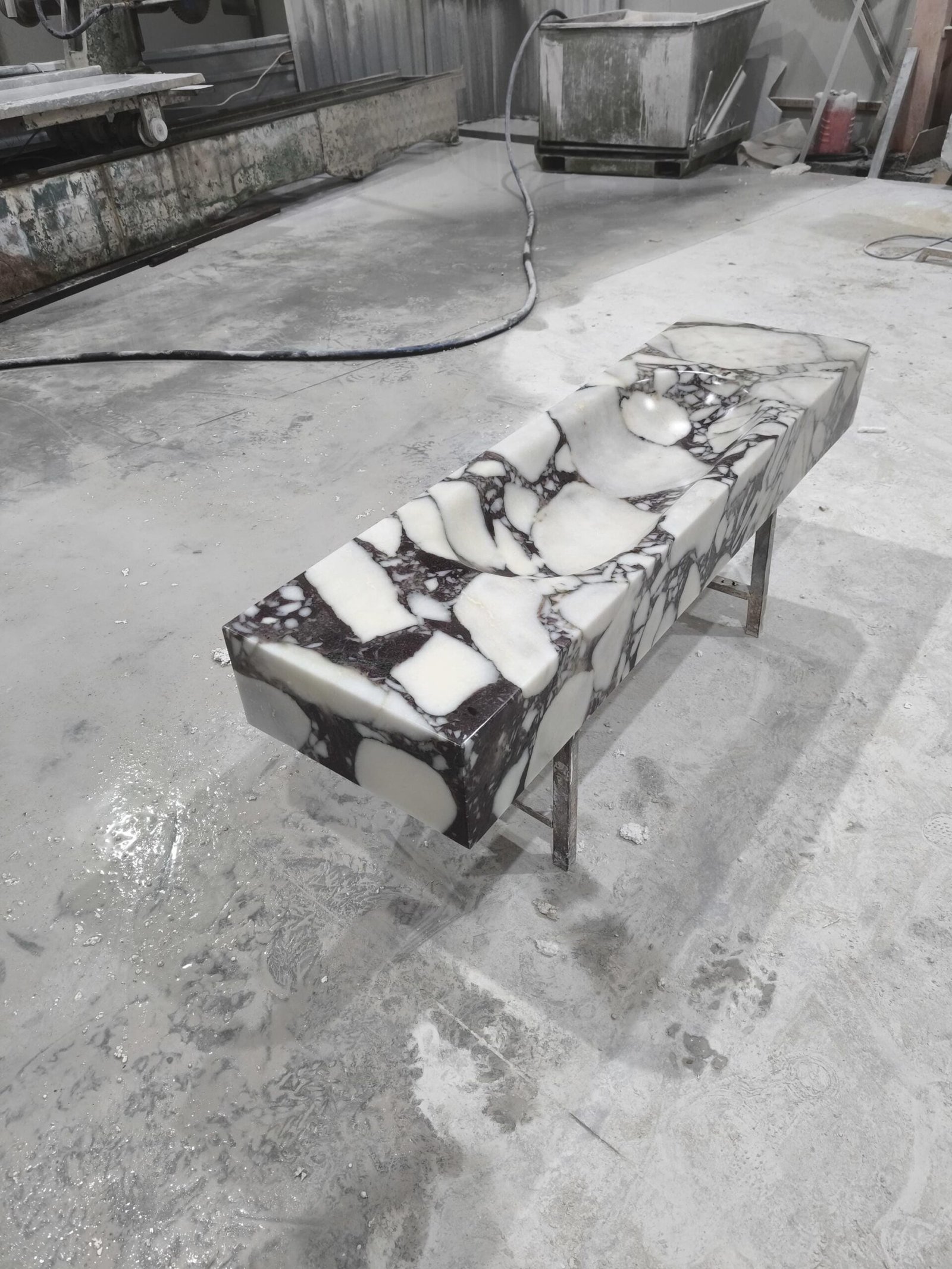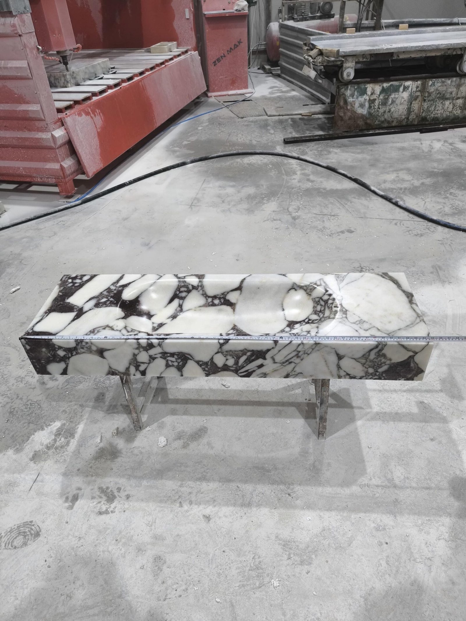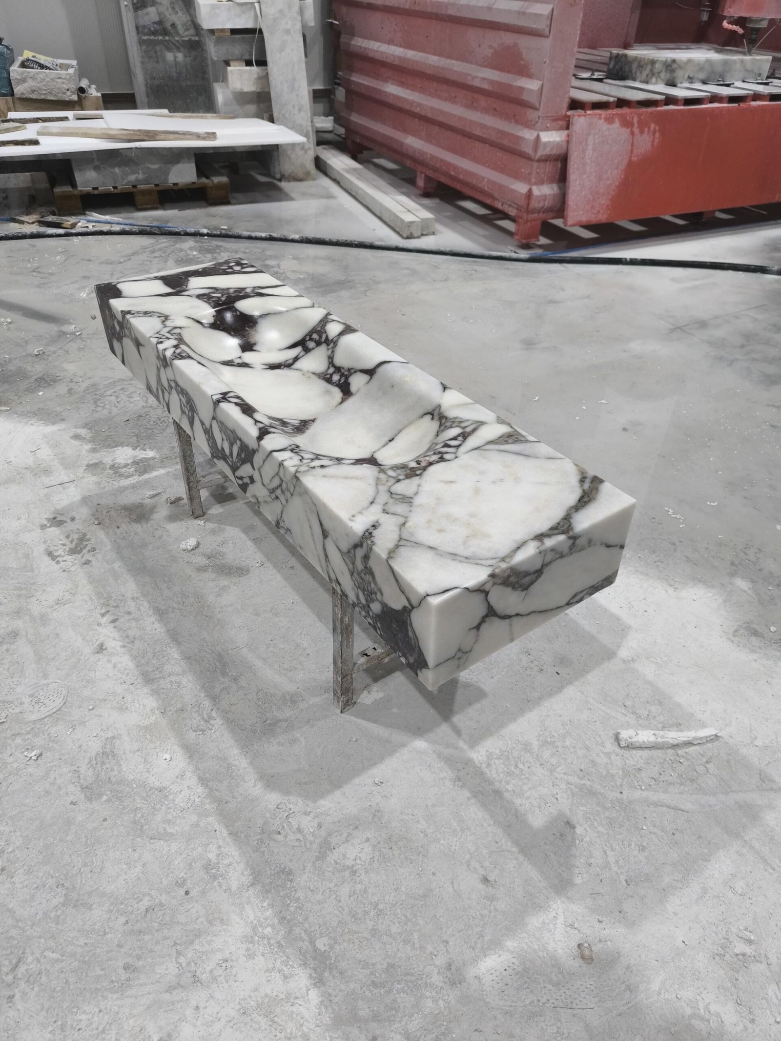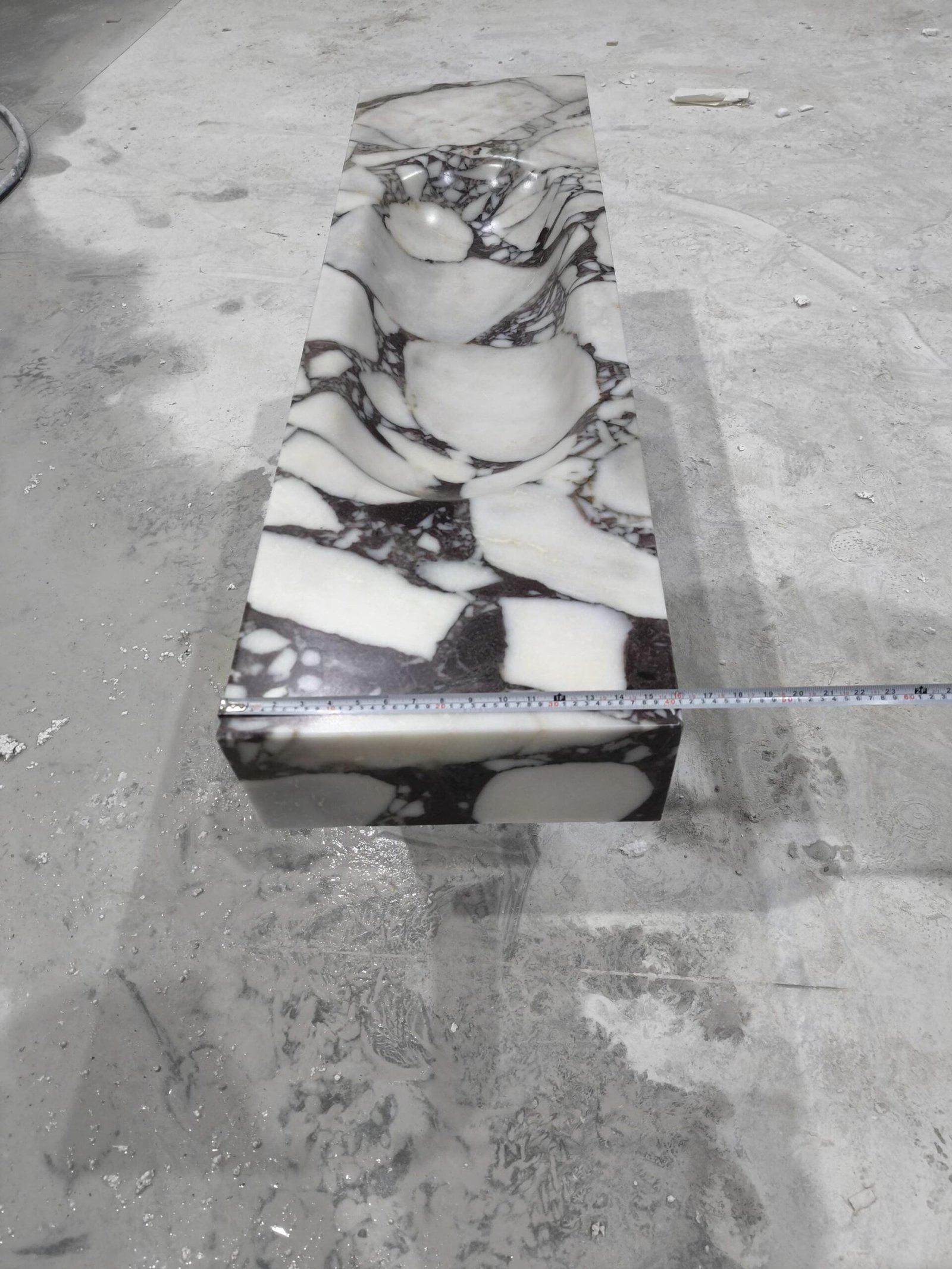 Transform your bathroom into a gallery of natural beauty with this handmade Calacatta Monet marble sink, expertly crafted from premium natural stone. Featuring rich purple and grey veining on a creamy white background, every piece is a one-of-a-kind statement of elegance.