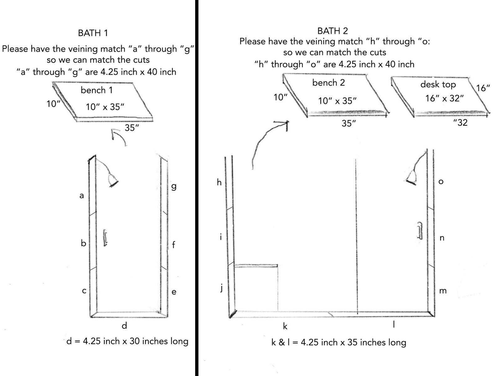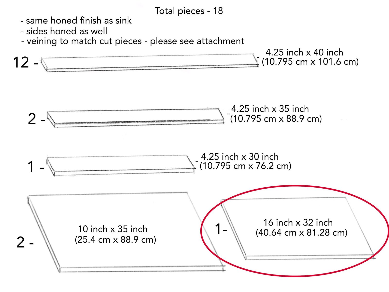 For Heather: 18 pieces will be produced using two previously produced Calacatta Viola marble pieces identical to the sink stone, honed and following the vein pattern as closely as possible (one-to-one vein tracing is not possible). The price includes…
