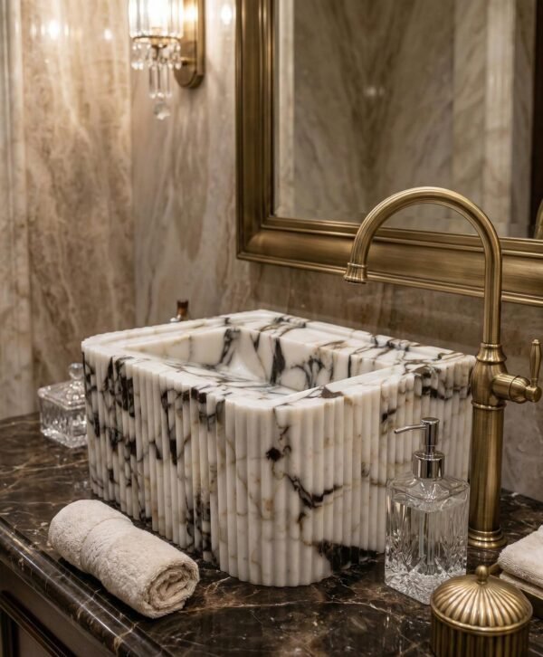 This Calacatta Viola marble fluted sink transforms your bathroom into a sculptural statement of natural luxury. Hand-carved from premium marble, its dramatic violet and charcoal veining flows across a creamy white base, while the fluted exterior adds…