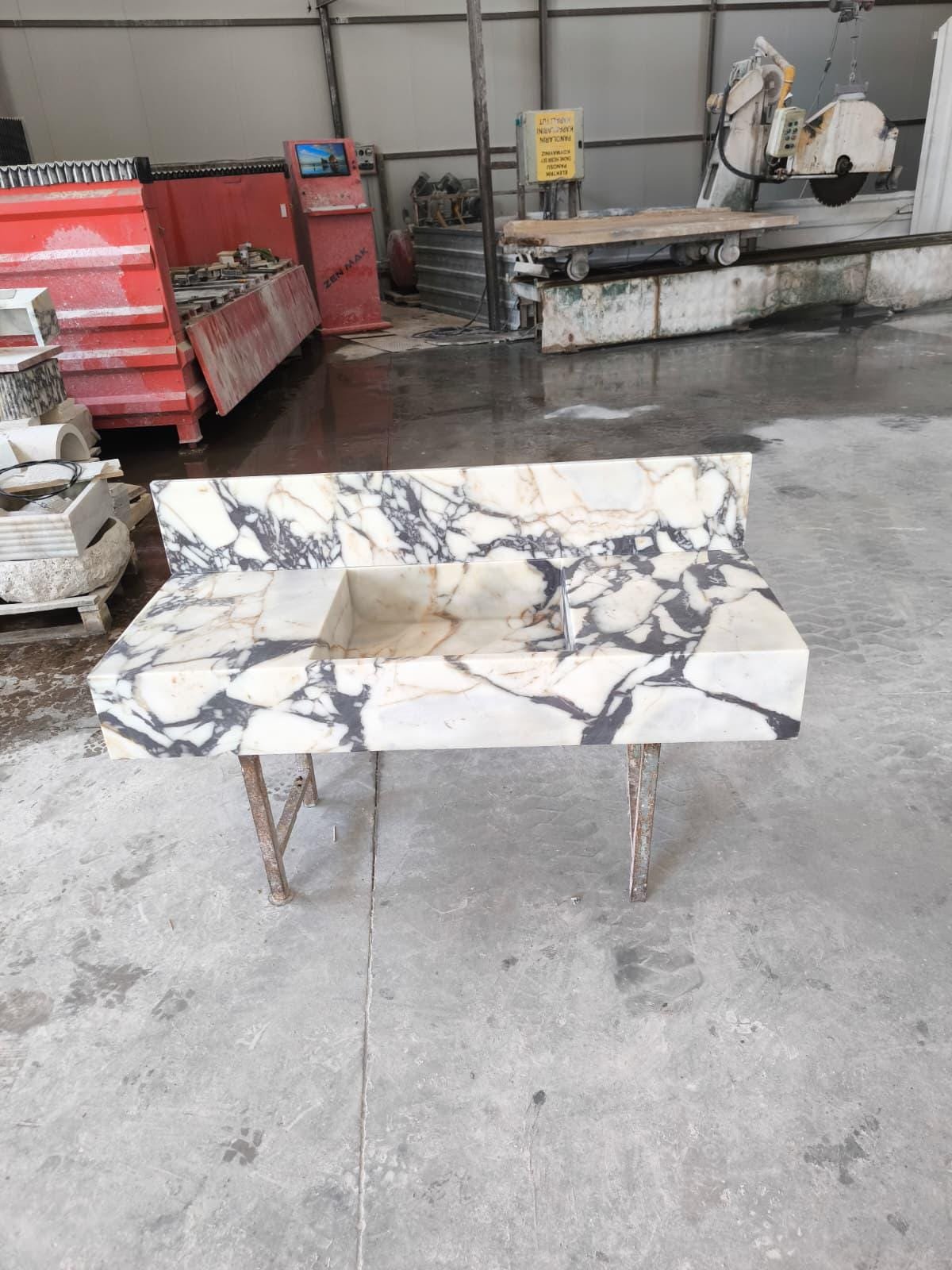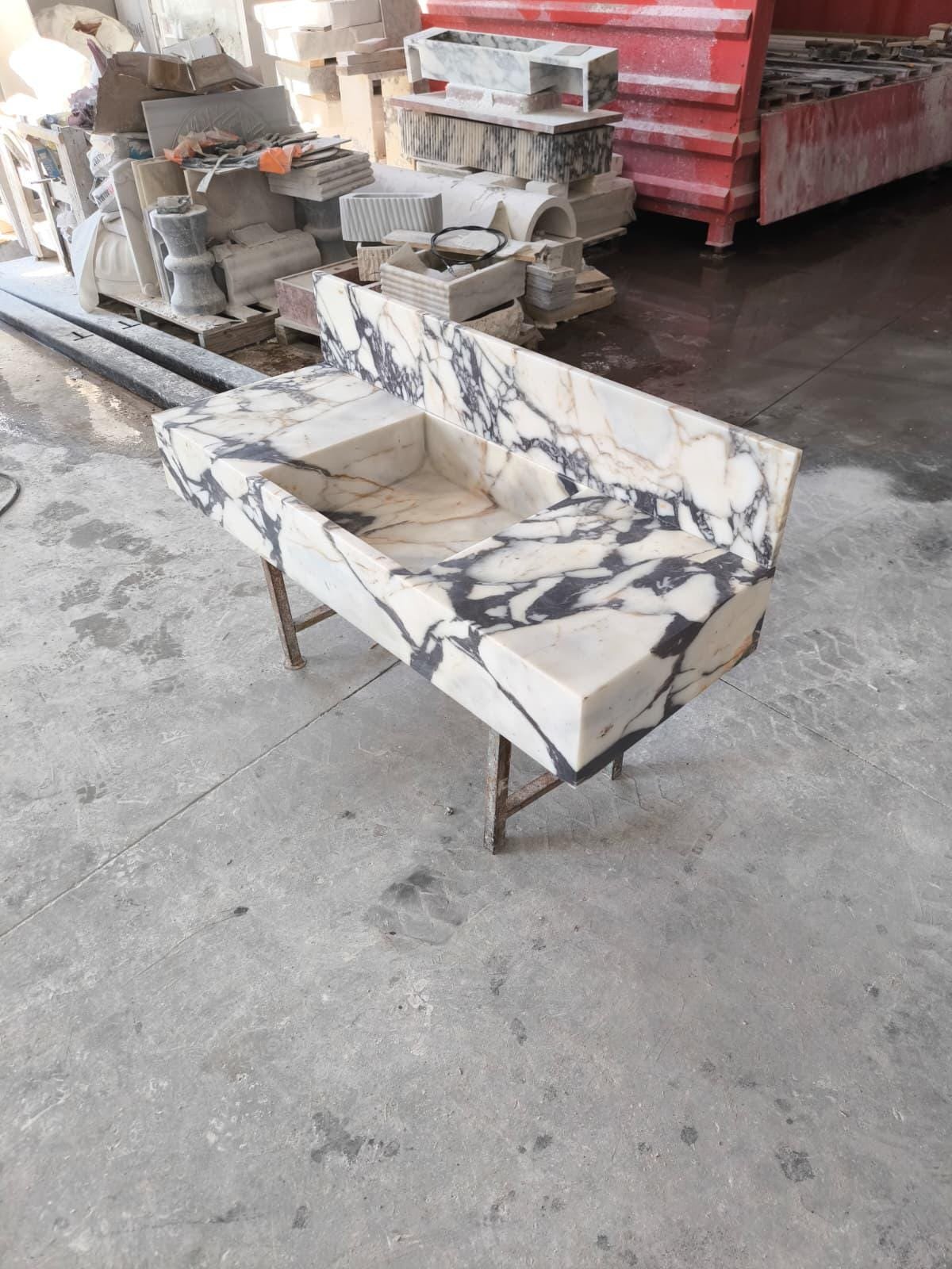 Elevate your bathroom with this bold Calacatta Viola marble sink, designed to make a powerful style statement. With deep veining and a solid 8” backsplash, this handcrafted piece offers timeless luxury in functional form.