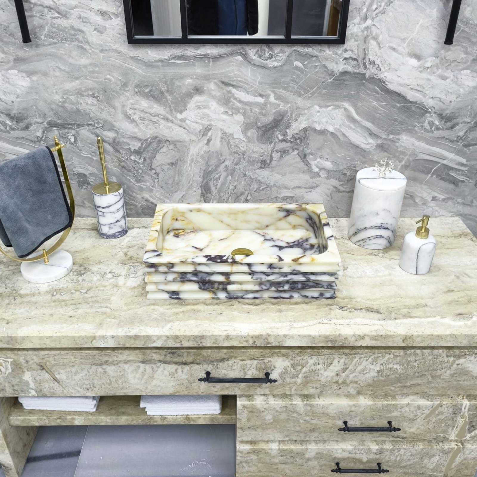 Genuine Calacatta Viola marble – each sink is one-of-a-kind