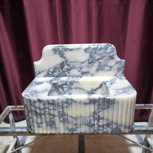 Transform your bathroom with this luxurious Viola marble sink, featuring a ribbed design on three sides for an elegant touch. Crafted from high-quality natural marble, this sink showcases Calacatta patterns, combining timeless beauty with modern functionality. Its wall-mount style and rounded corners make it a perfect choice for powder rooms and vanities.