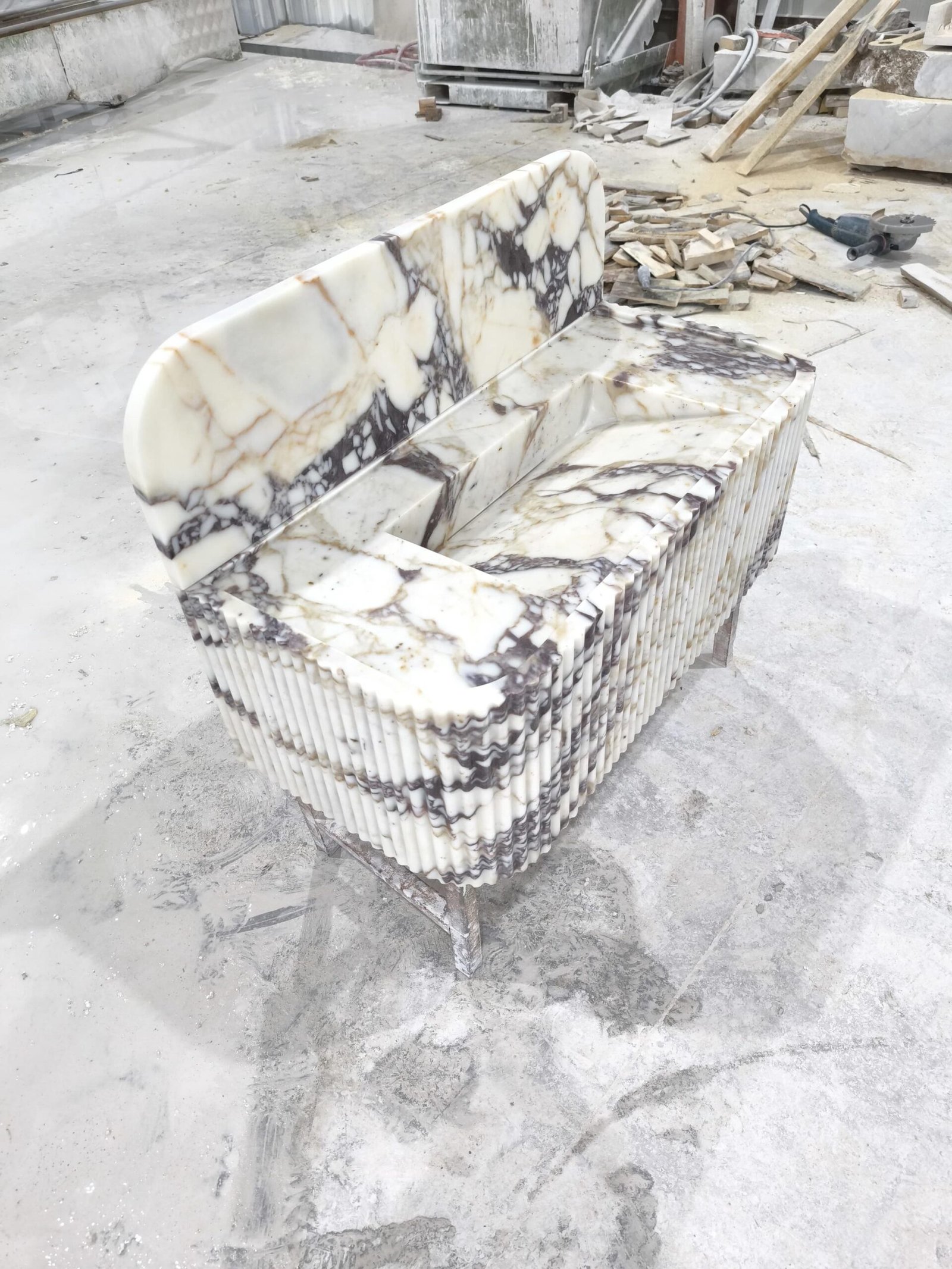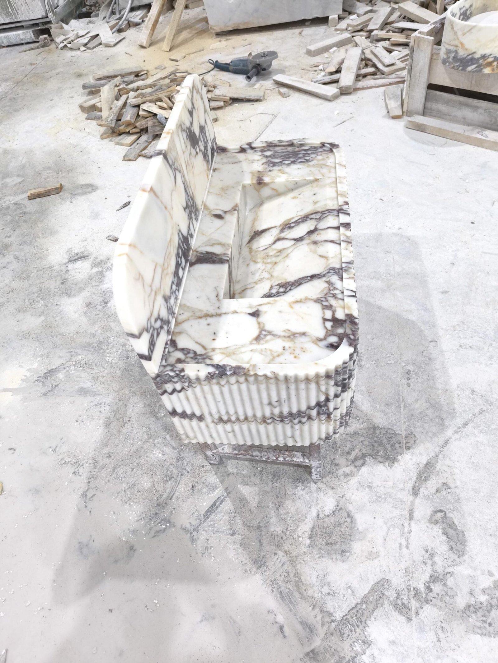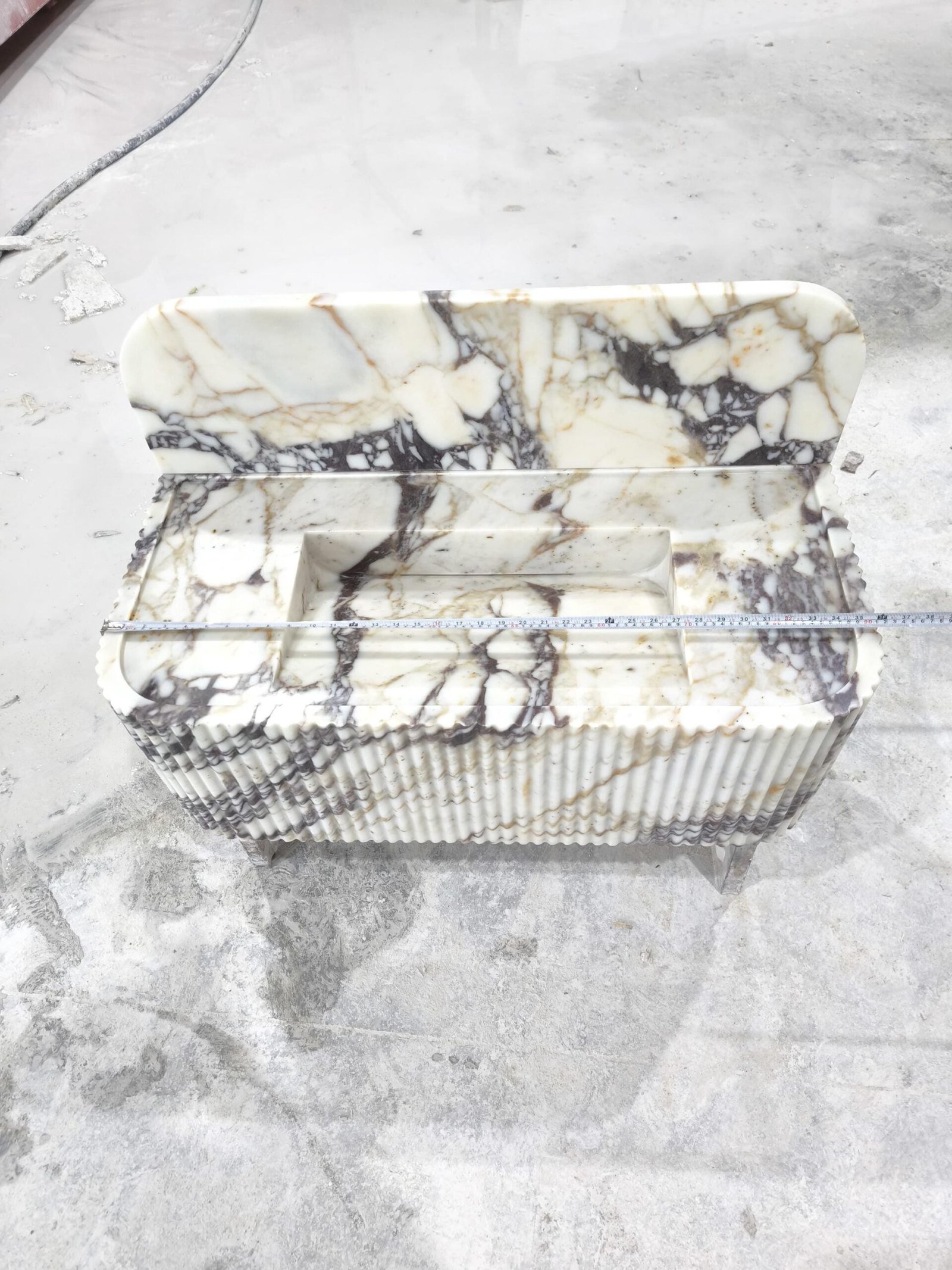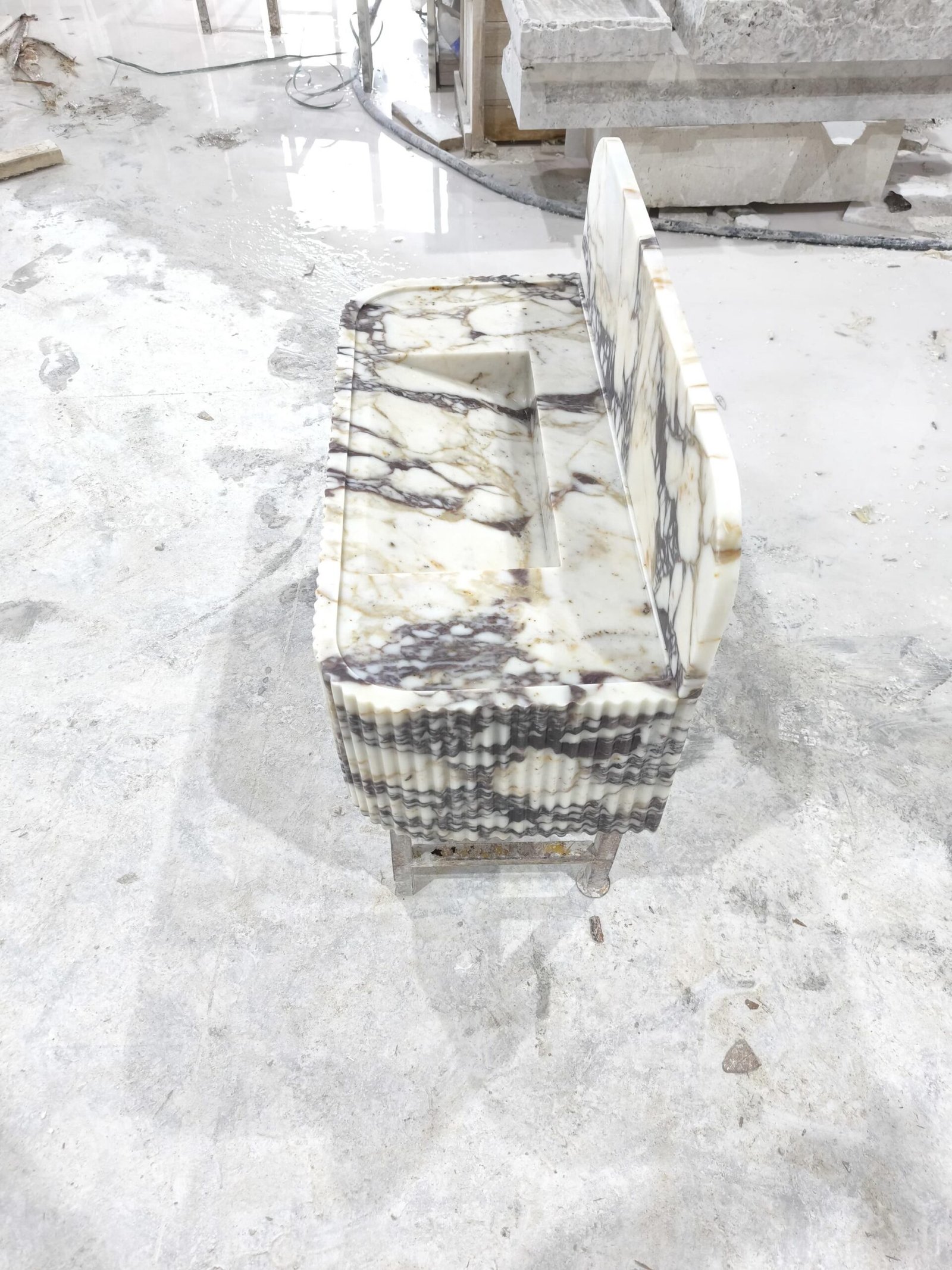 Elevate your space with this Calacatta Viola marble sink — a luxurious fusion of sculptural art and timeless Italian craftsmanship. The rich, natural veining and fluted façade create a commanding presence, perfect for those curating a bold, designer-level bathroom aesthetic.