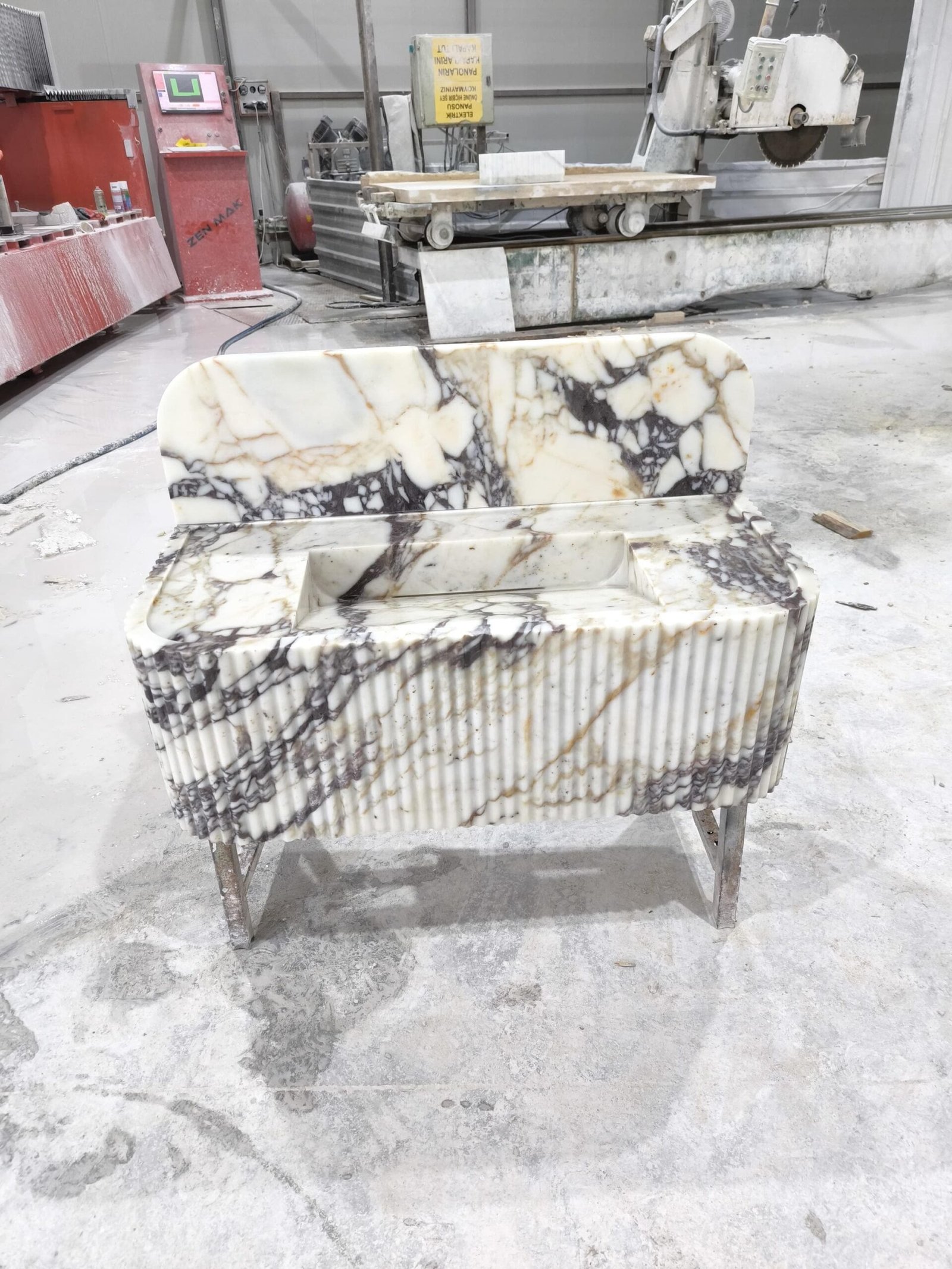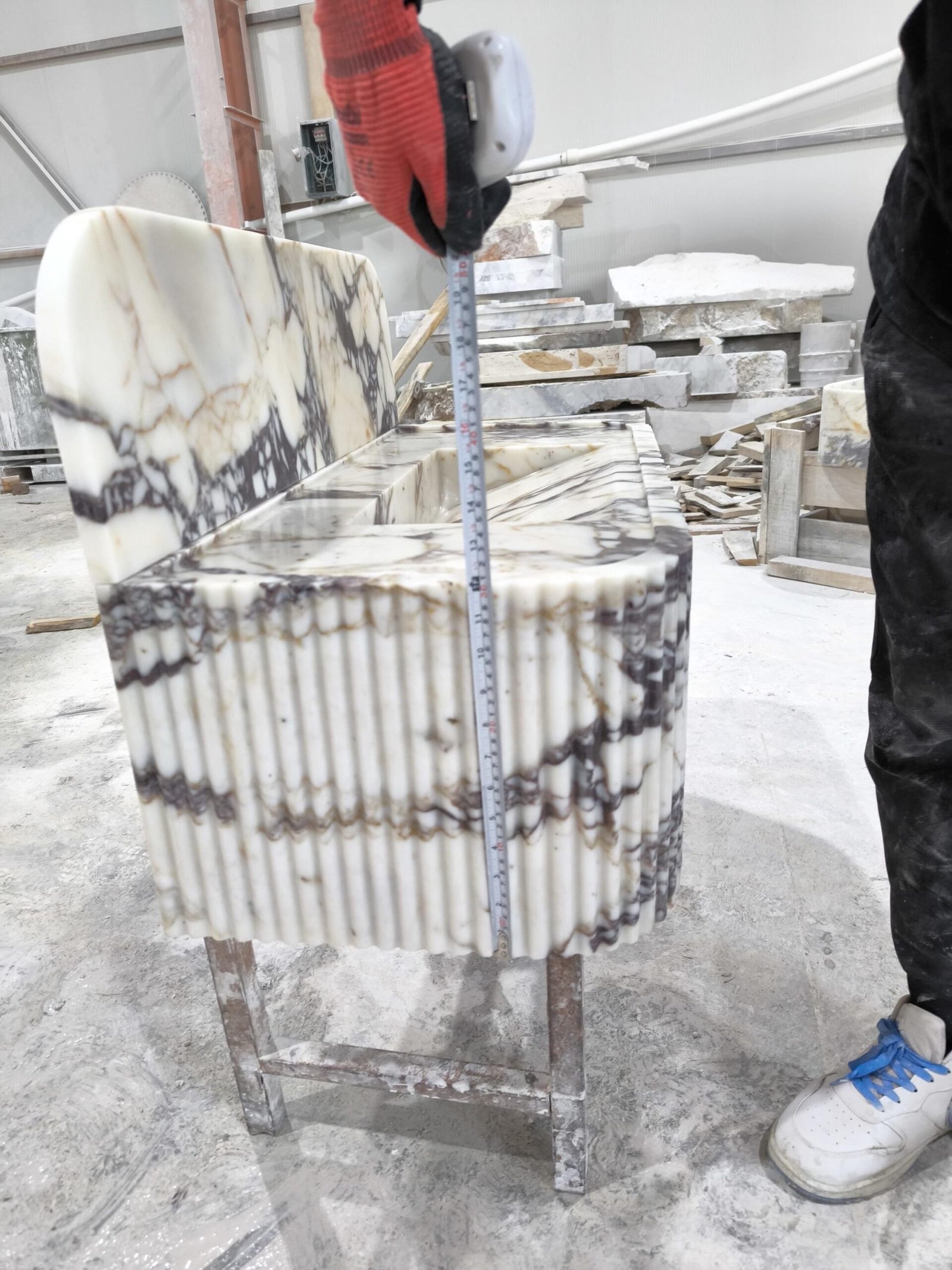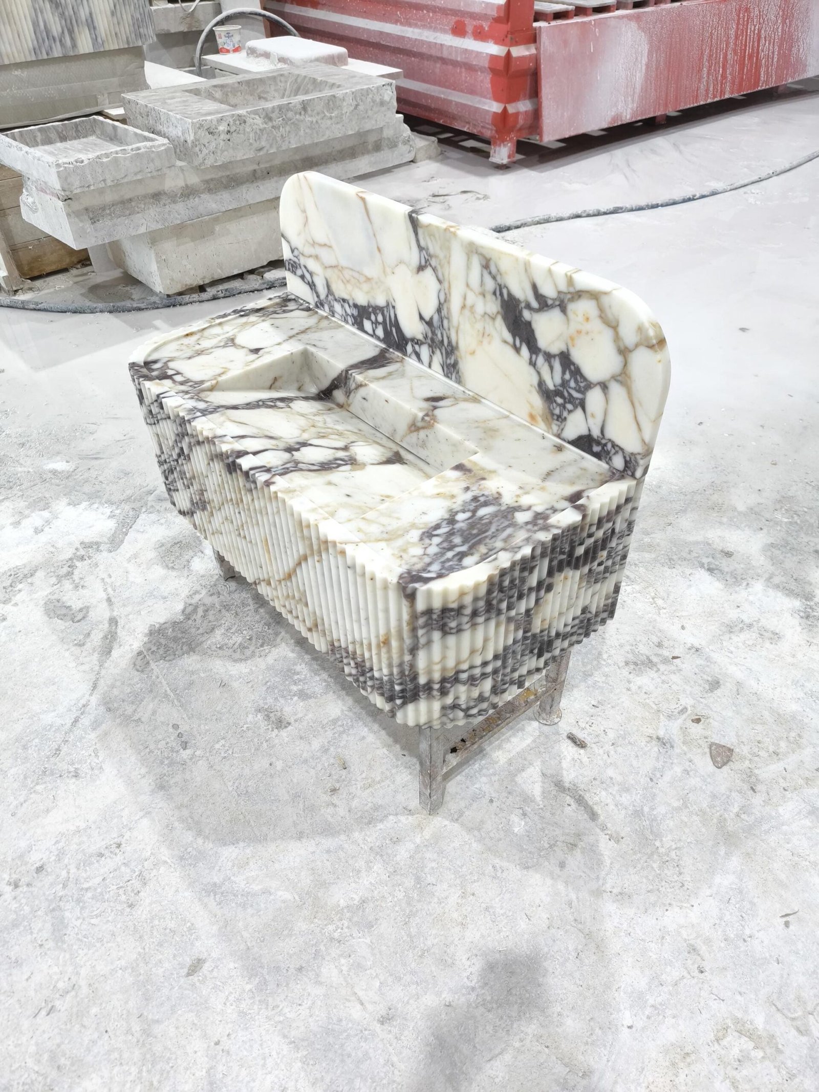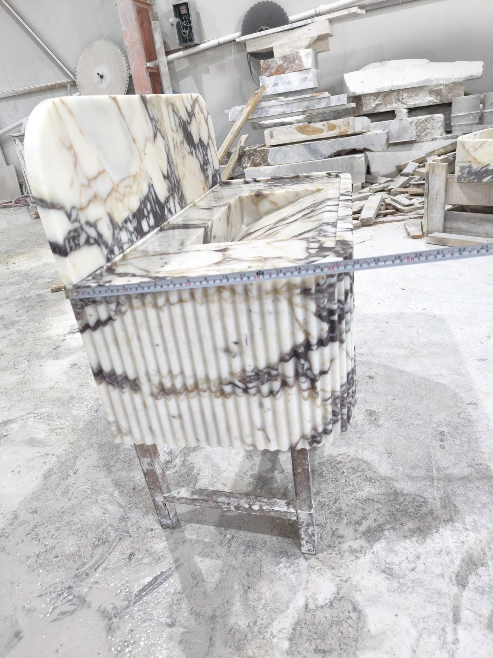 Elevate your space with this Calacatta Viola marble sink — a luxurious fusion of sculptural art and timeless Italian craftsmanship. The rich, natural veining and fluted façade create a commanding presence, perfect for those curating a bold, designer-level bathroom aesthetic.