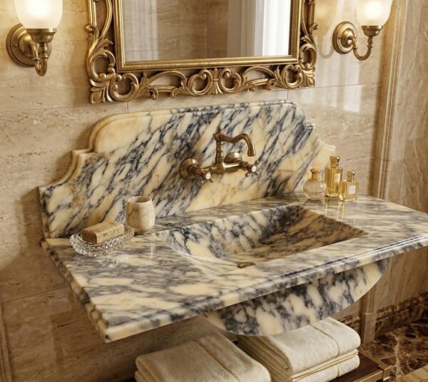 Elevate your bathroom’s elegance with the Calacatta Viola Marble Sink, a masterpiece of natural beauty and craftsmanship. This luxury wall-mounted sink is crafted from high-quality marble, making it a stunning focal point in any bathroom or powder room.
