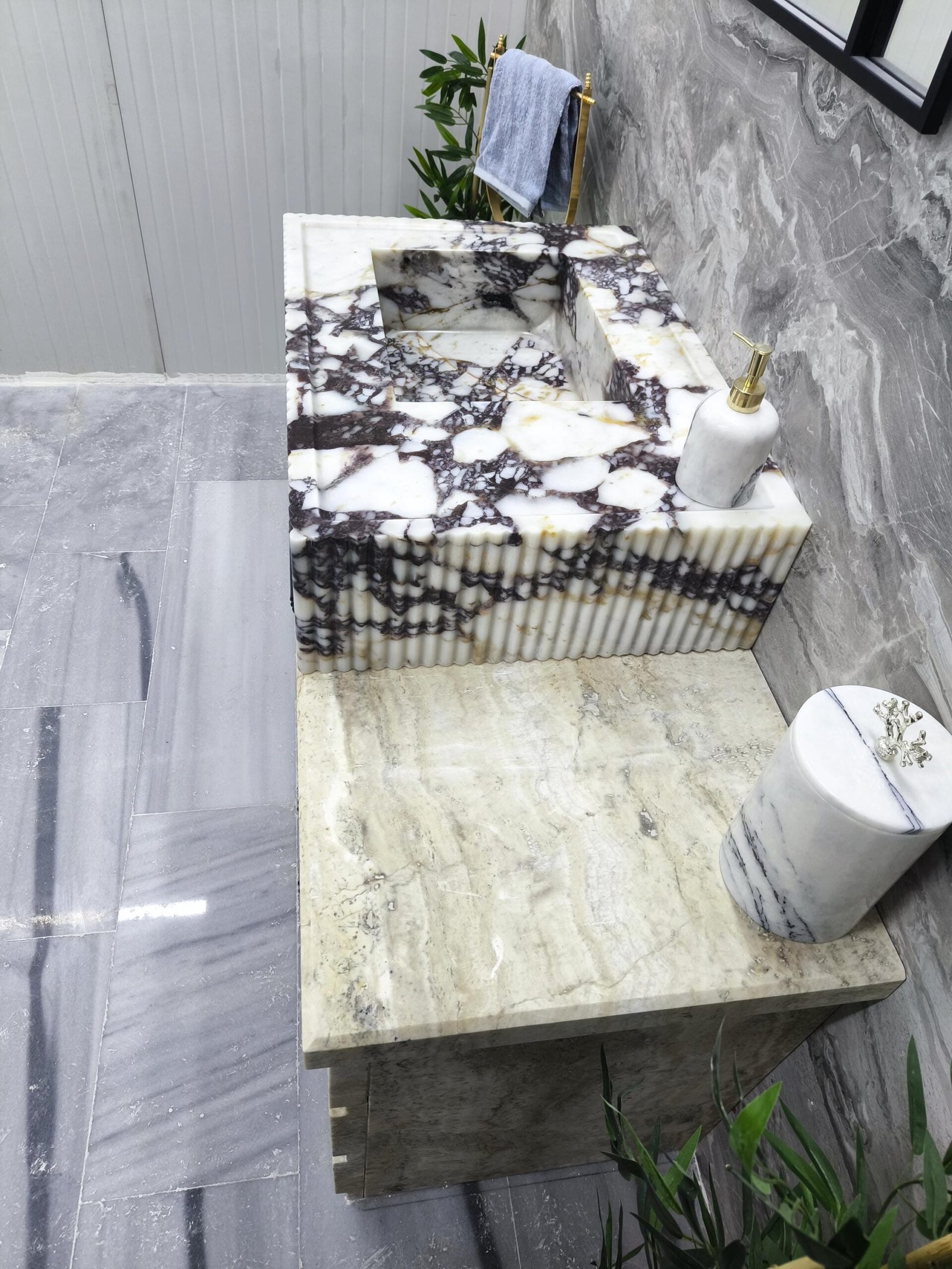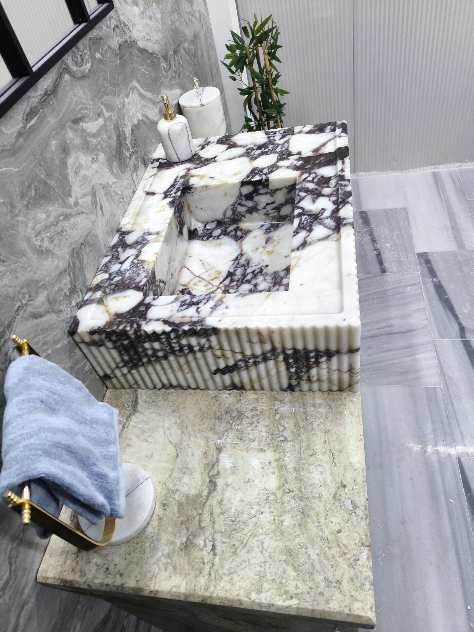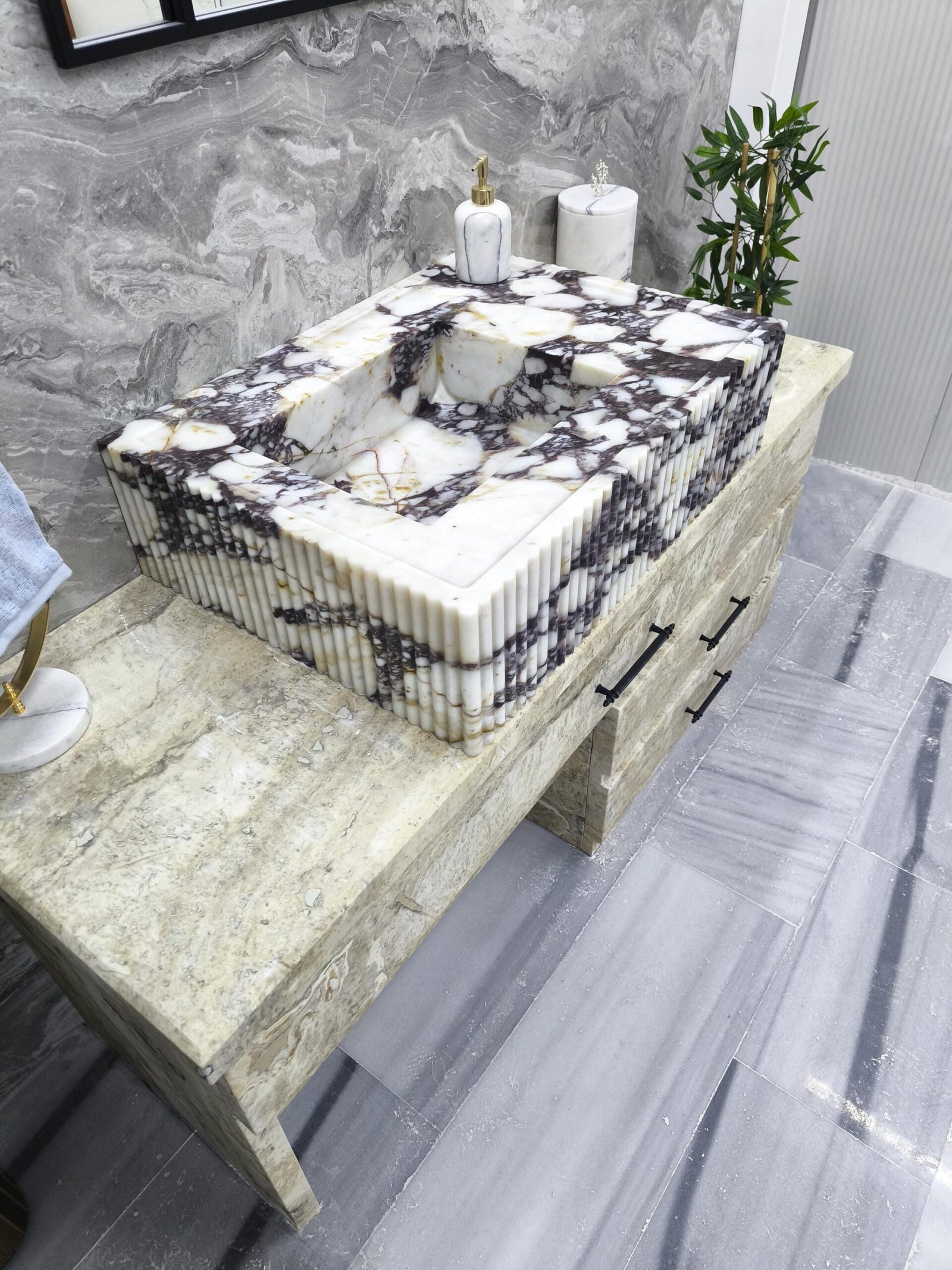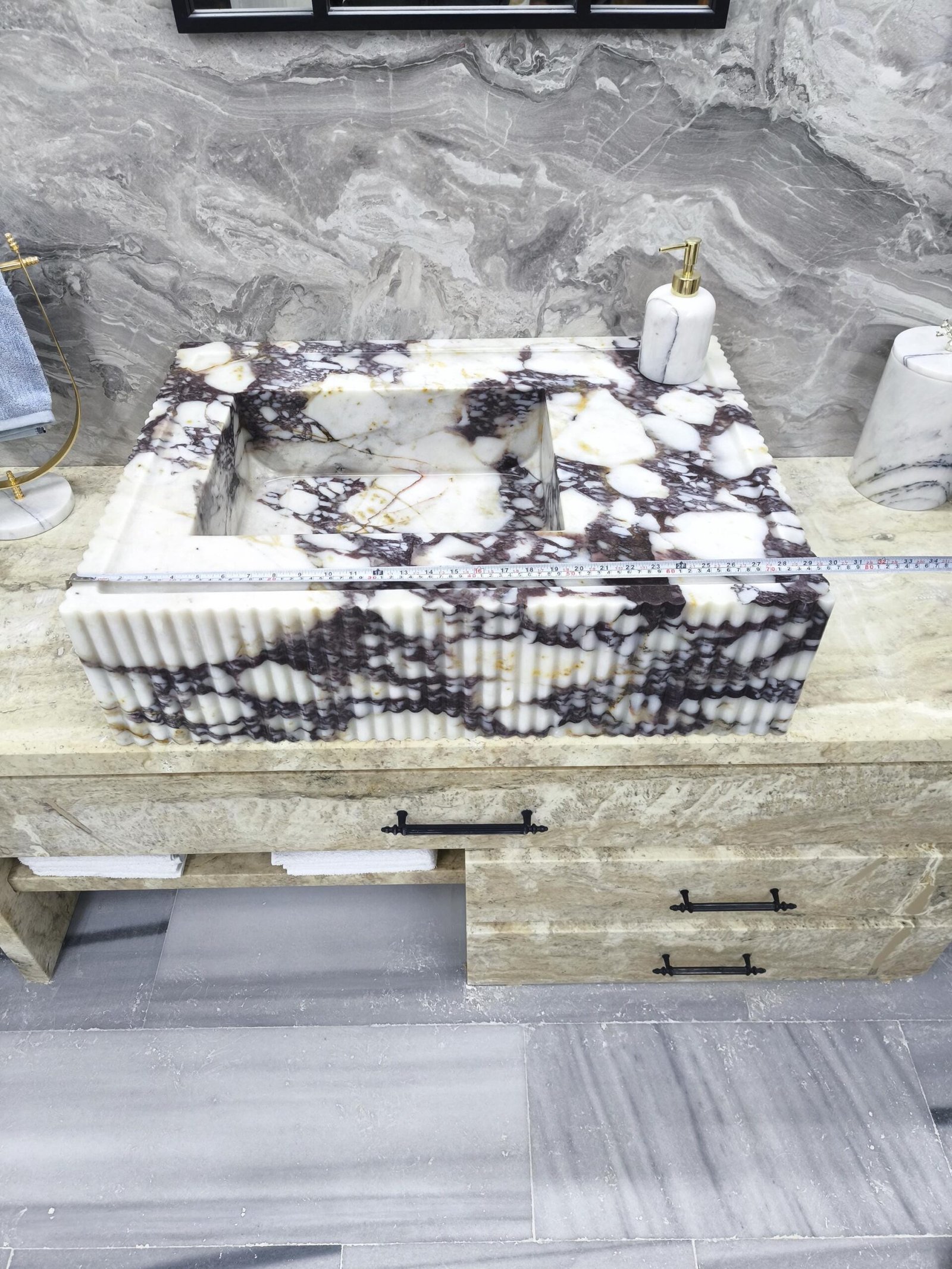 Carved from dramatic Calacatta Viola marble, this sink features rich purple veining over crisp white stone—enhanced with finely fluted edging for a modern sculptural feel. It’s a true showpiece for interiors that dare to stand out.