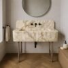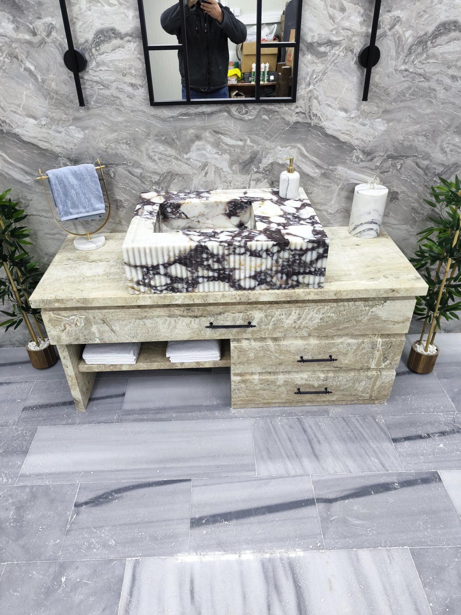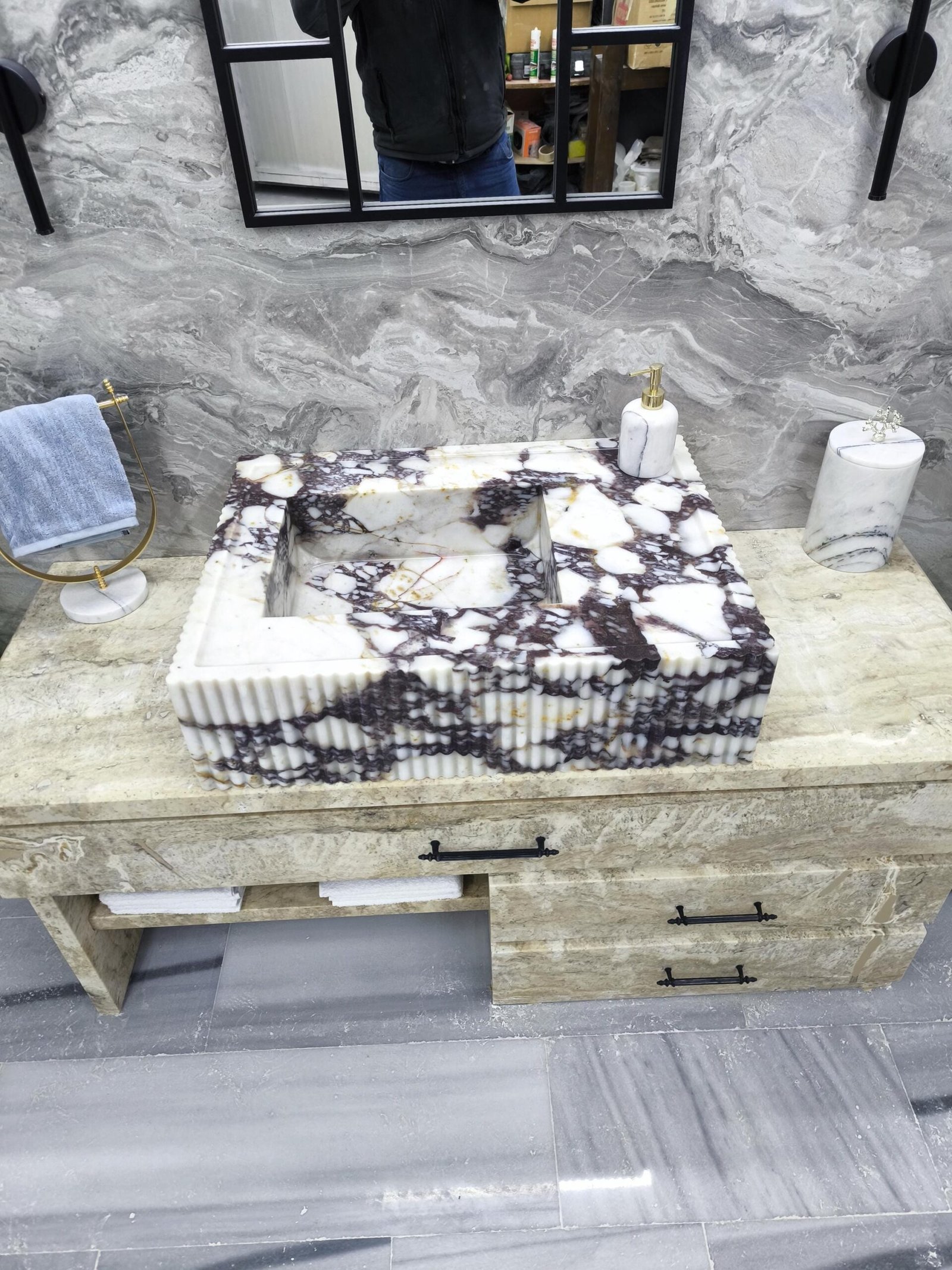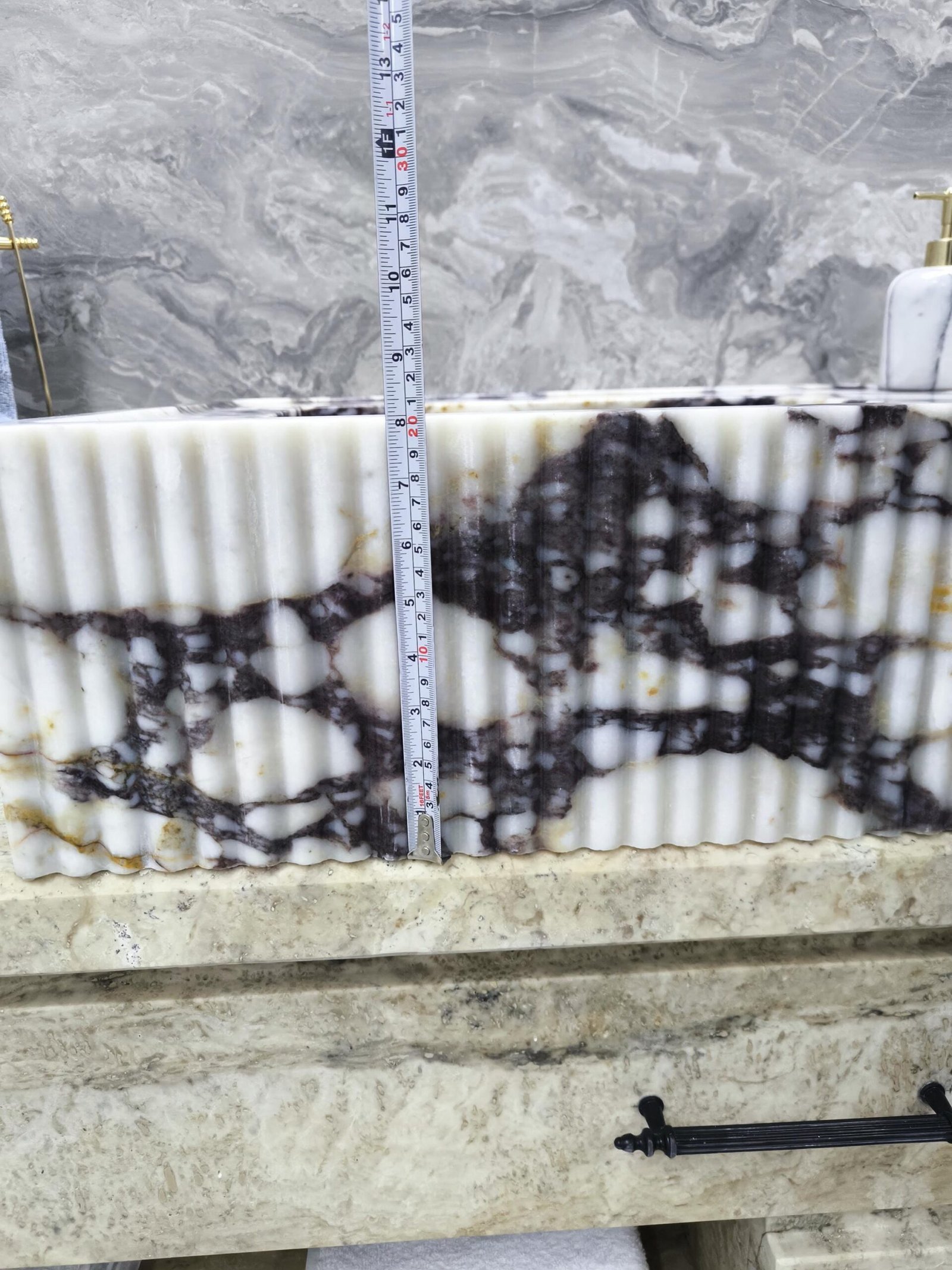 Carved from dramatic Calacatta Viola marble, this sink features rich purple veining over crisp white stone—enhanced with finely fluted edging for a modern sculptural feel. It’s a true showpiece for interiors that dare to stand out.