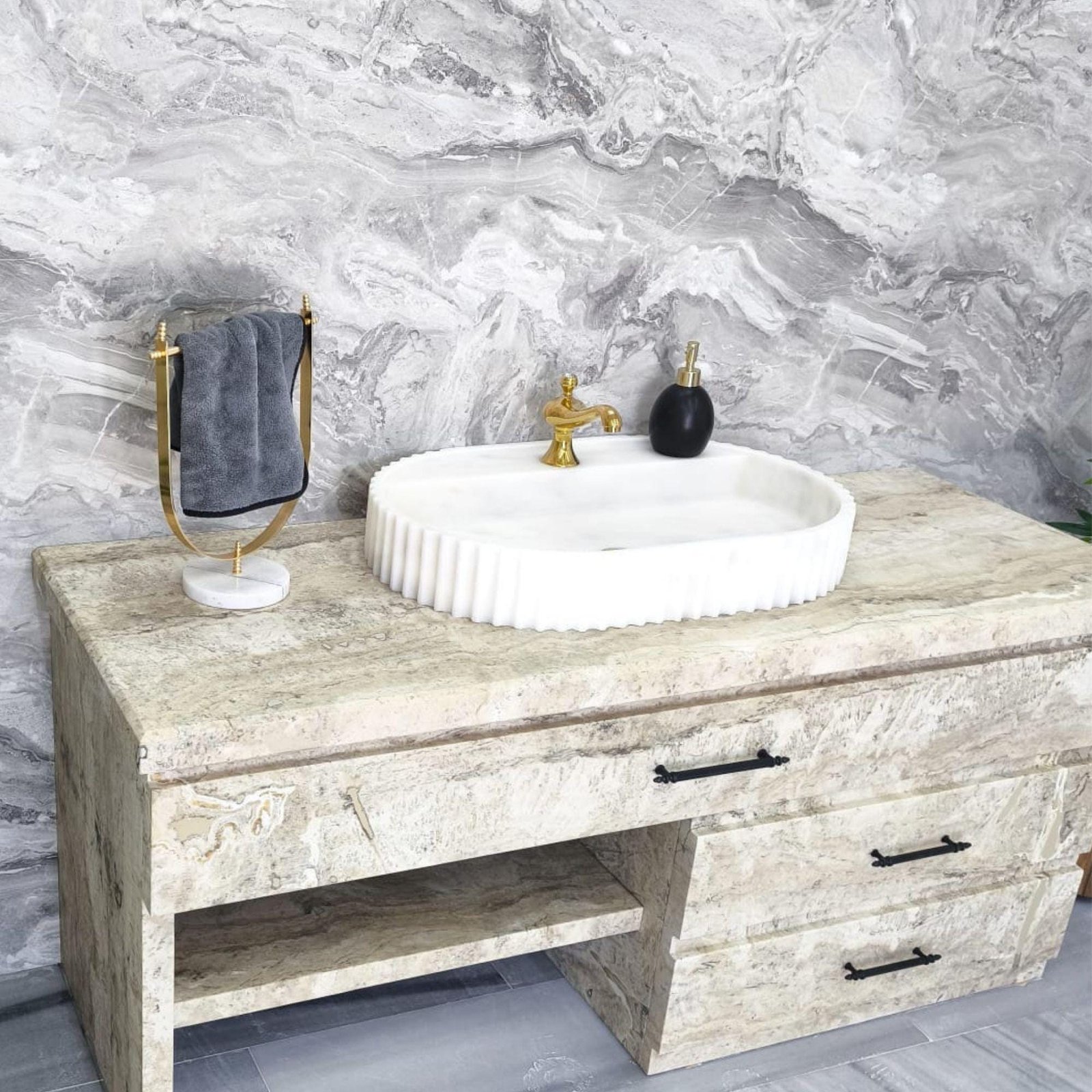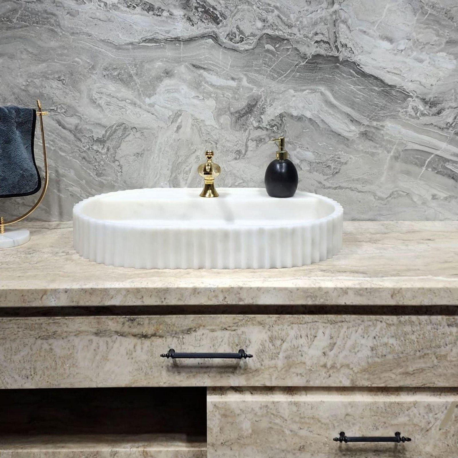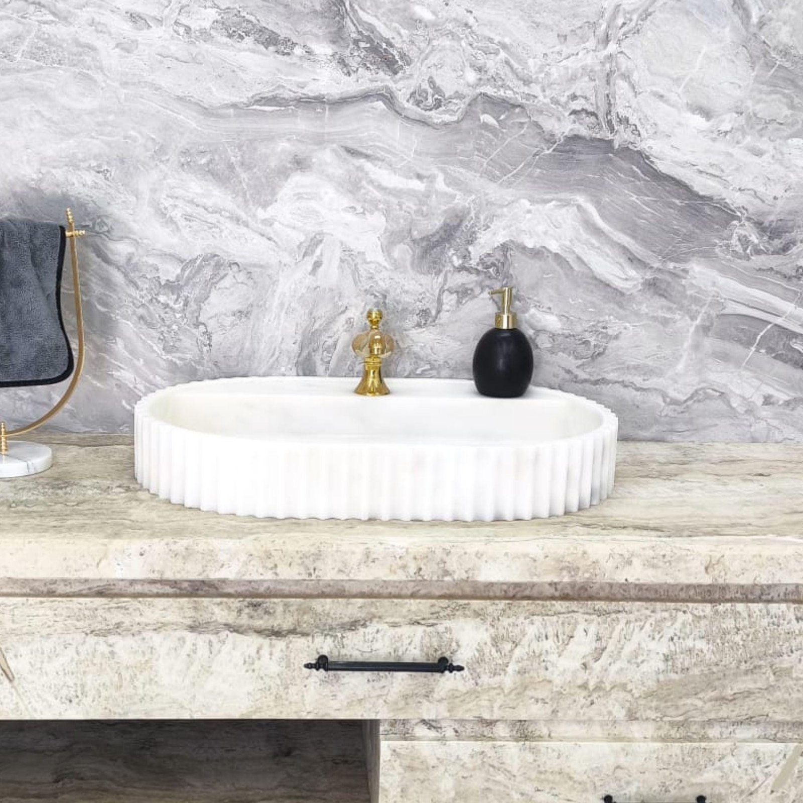 Refine your bathroom with the elegance of handcrafted stone. This Premium White Marble Sink features a soft oval silhouette with sculptural fluted edges — a clean, modern shape that radiates timeless luxury. At 18x28x4”, it’s perfectly sized for contemporary vanities and boutique spaces alike.