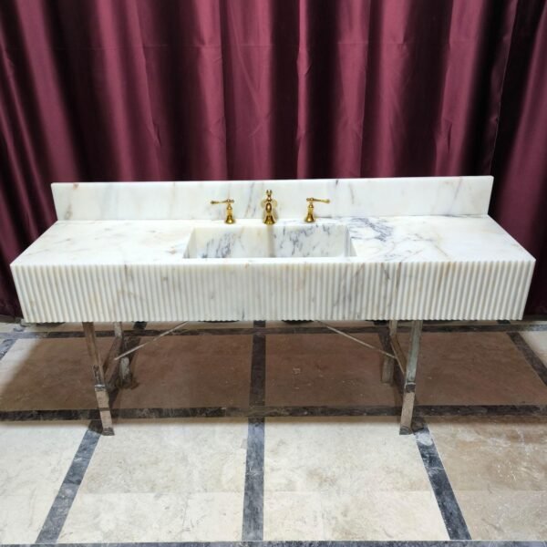 Upgrade your bathroom or powder room with this luxurious Calacatta gold marble sink, crafted from high-quality natural marble. This large, wall-mounted sink combines elegance and functionality, creating a timeless focal point with its hand-carved design and natural stone appeal.