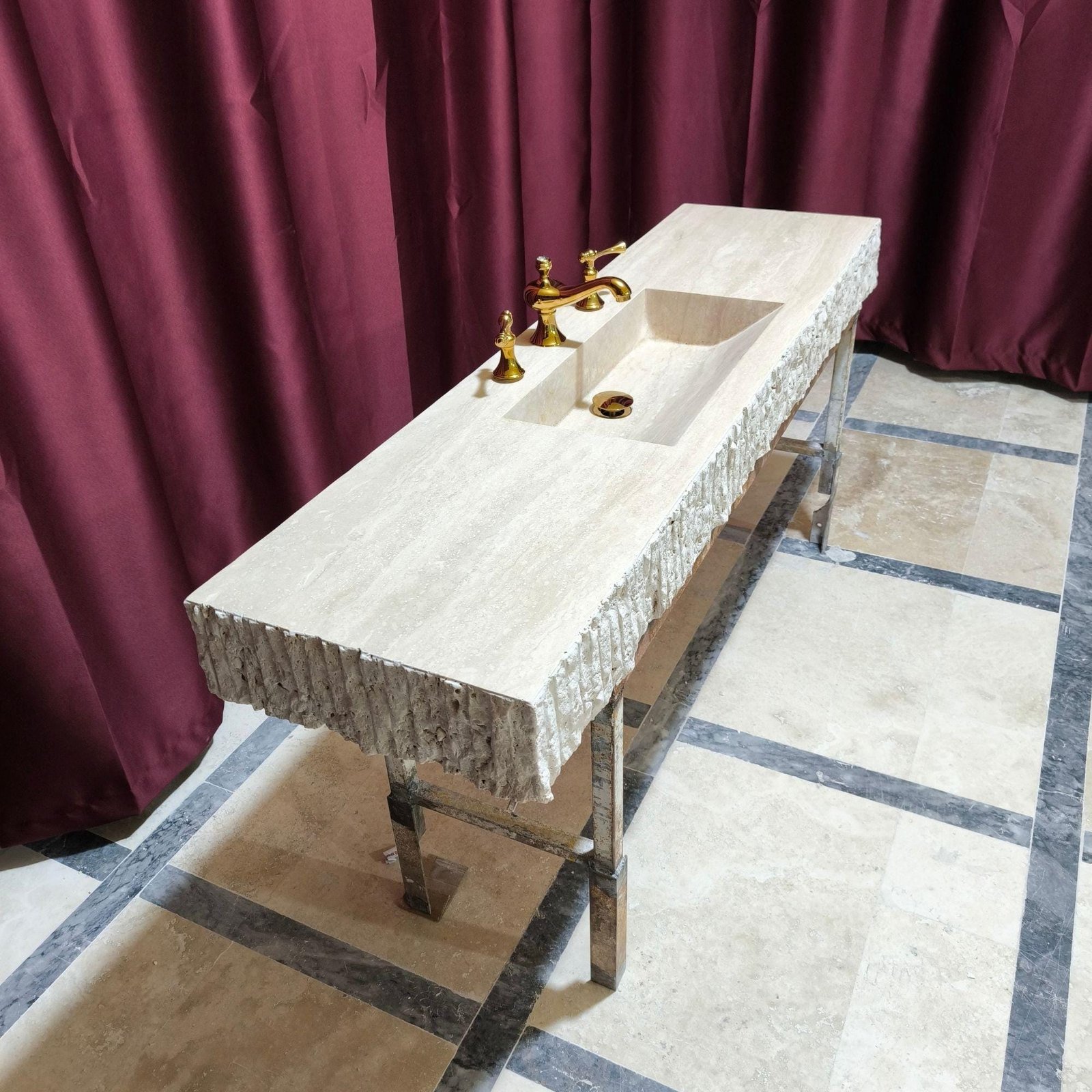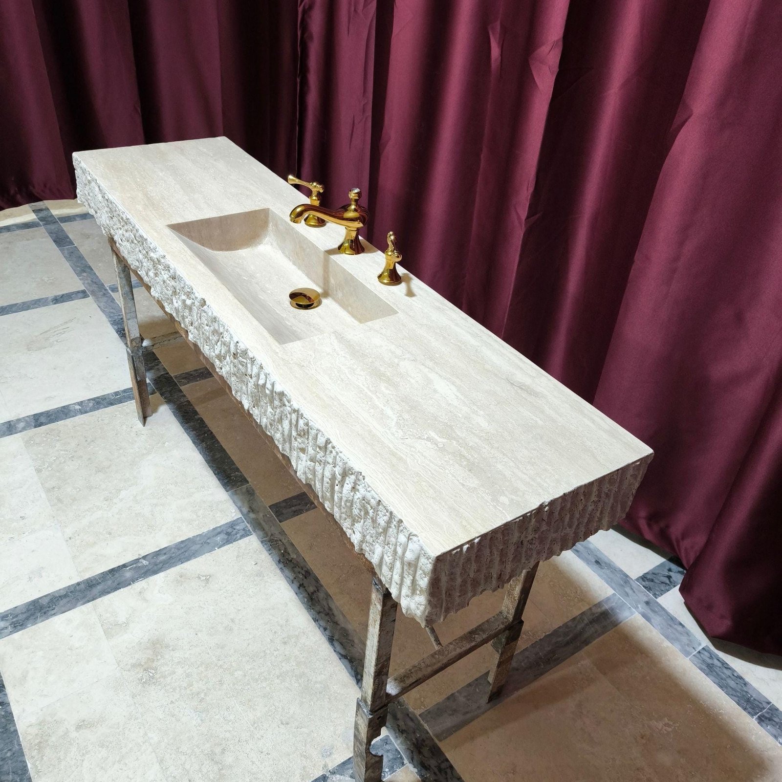 Enhance your bathroom with this stunning rustic travertine split face sink, handcrafted from natural stone. This unique marble sink adds a timeless touch of elegance to any space.
