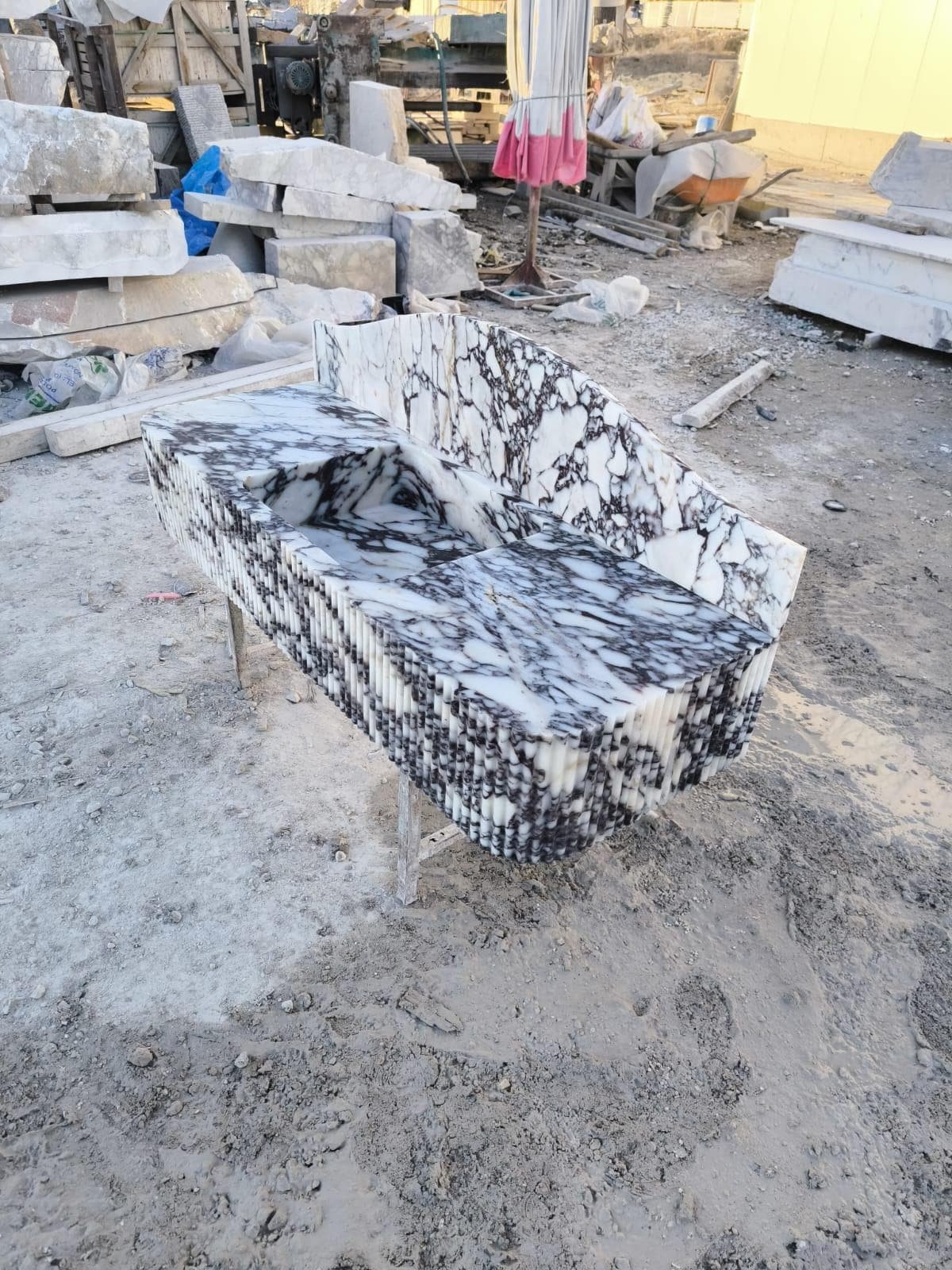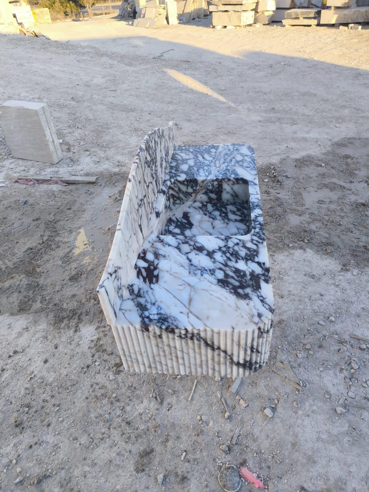 Elevate your bathroom with this exquisite Calacatta Viola Marble Sink, a true statement piece crafted from premium natural stone. The 20x58x10″ basin offers ample space, while the 12″ backsplash enhances both functionality and elegance. With its unique veining and handcrafted details, this luxury vanity sink seamlessly blends modern aesthetics with timeless beauty.