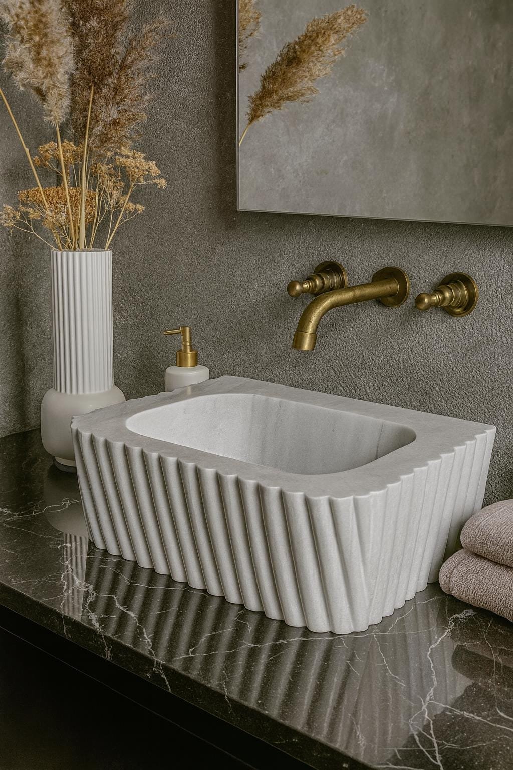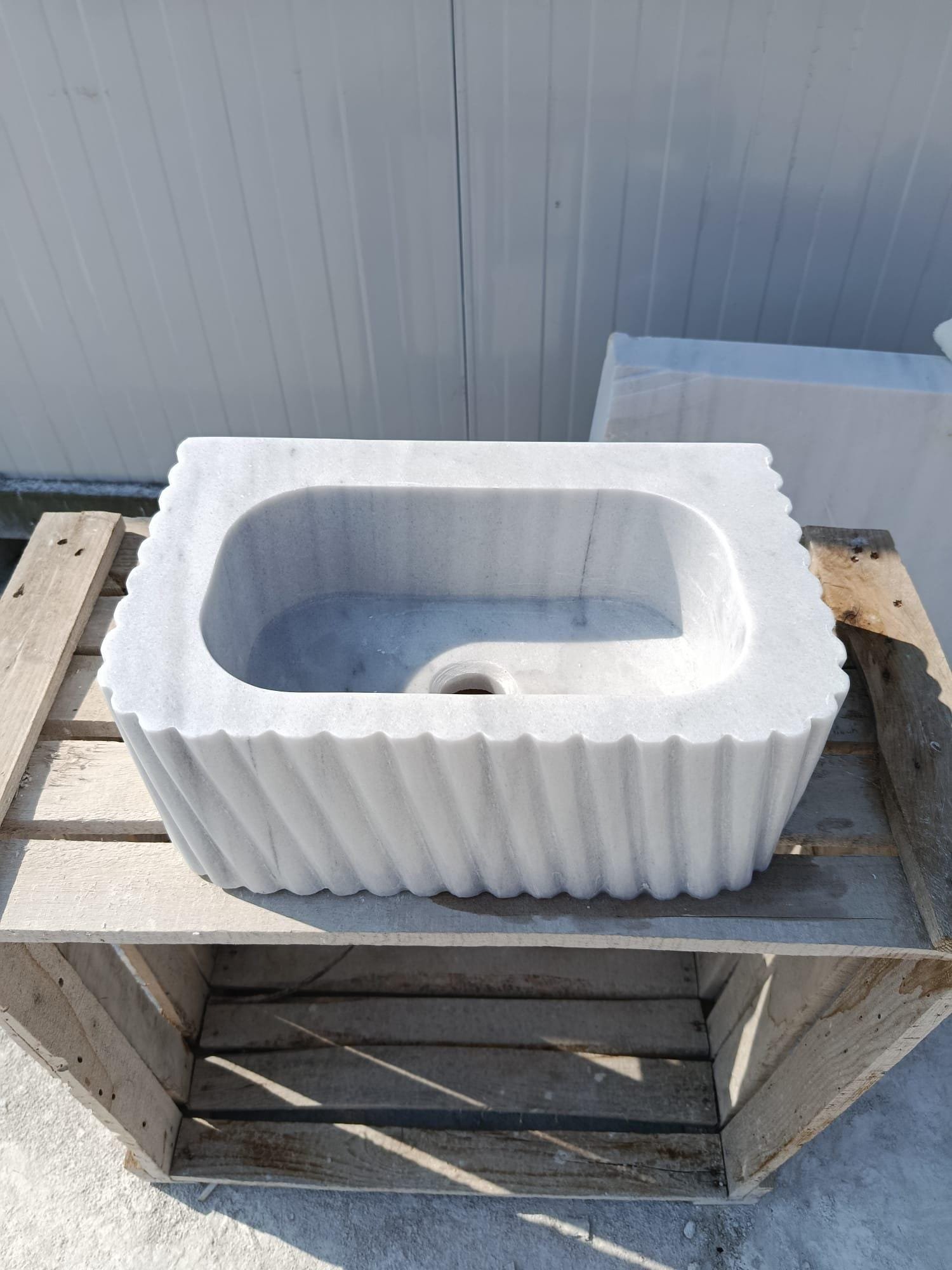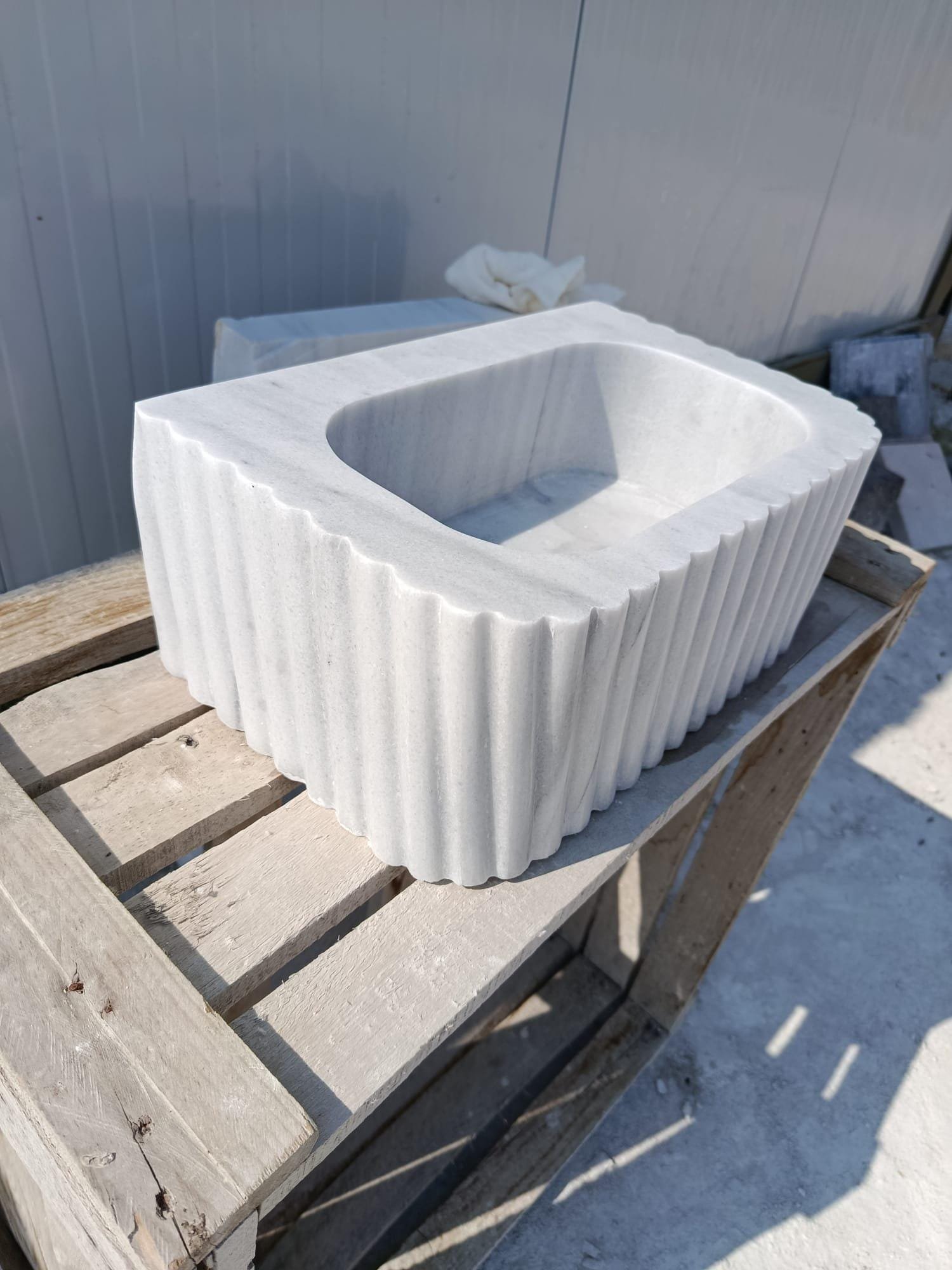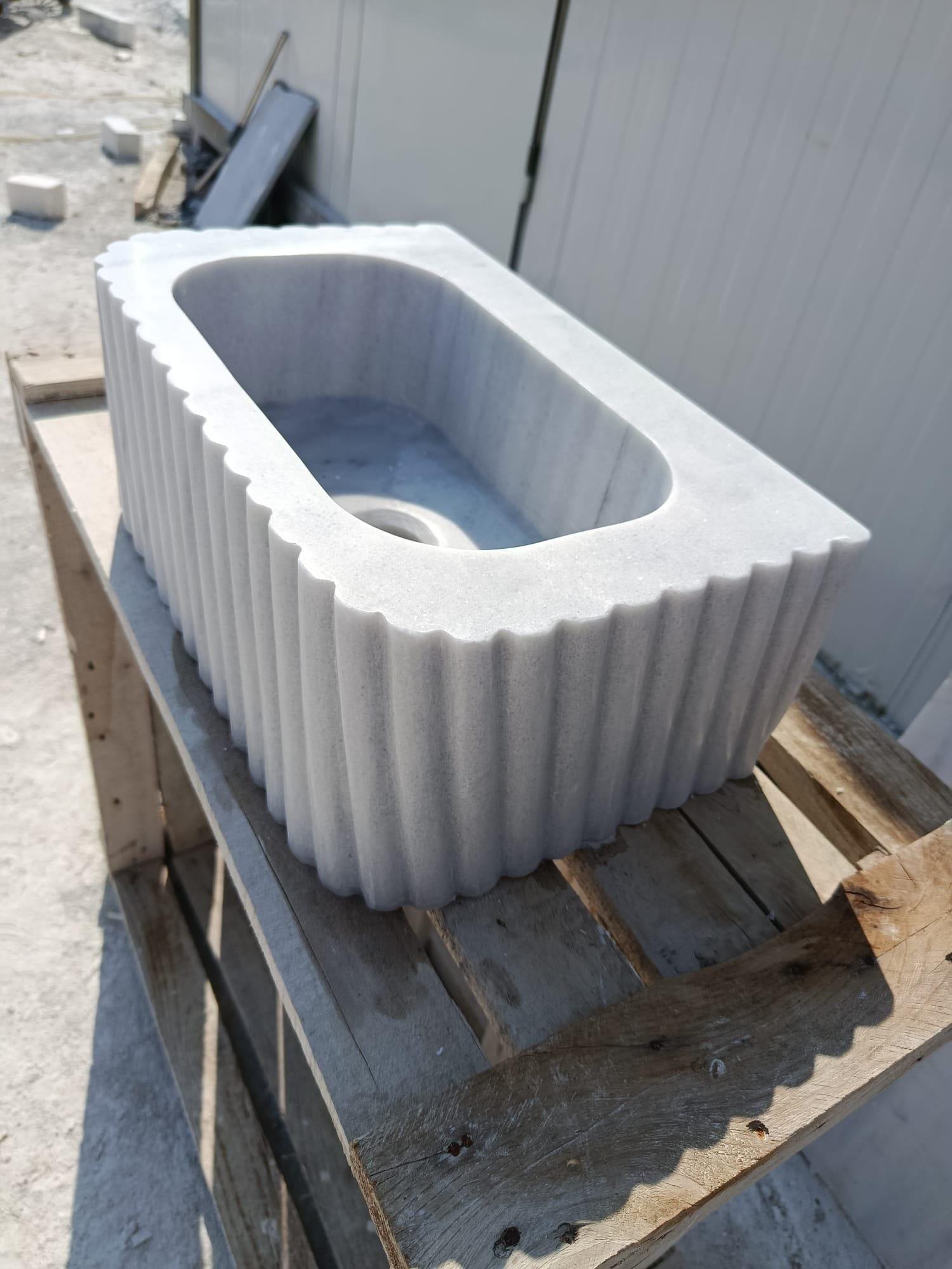 The fluted edges create a tactile rhythm that blends timeless design with modern craftsmanship. Hand-carved from premium Carrara marble, each piece radiates sophistication, offering both function and enduring beauty.