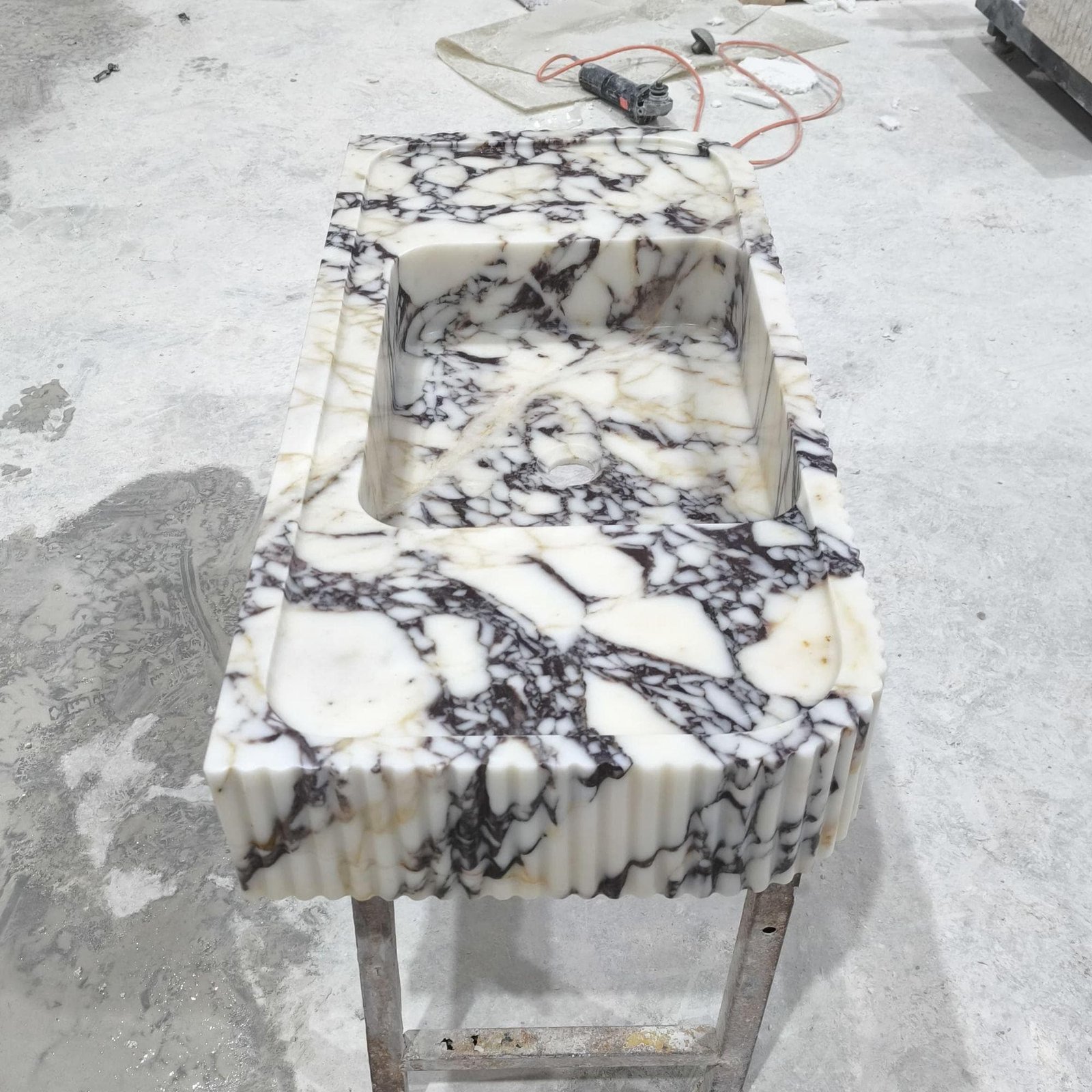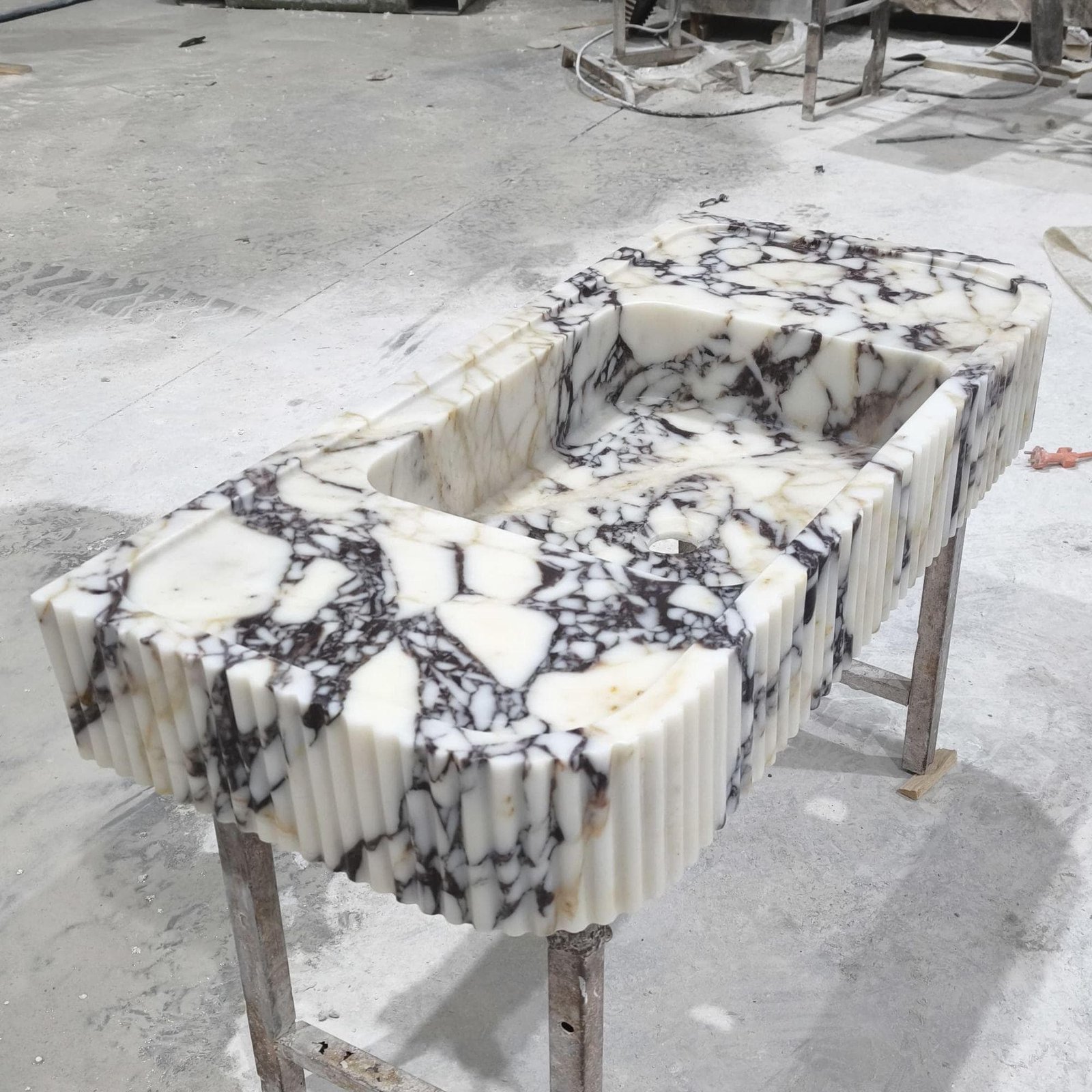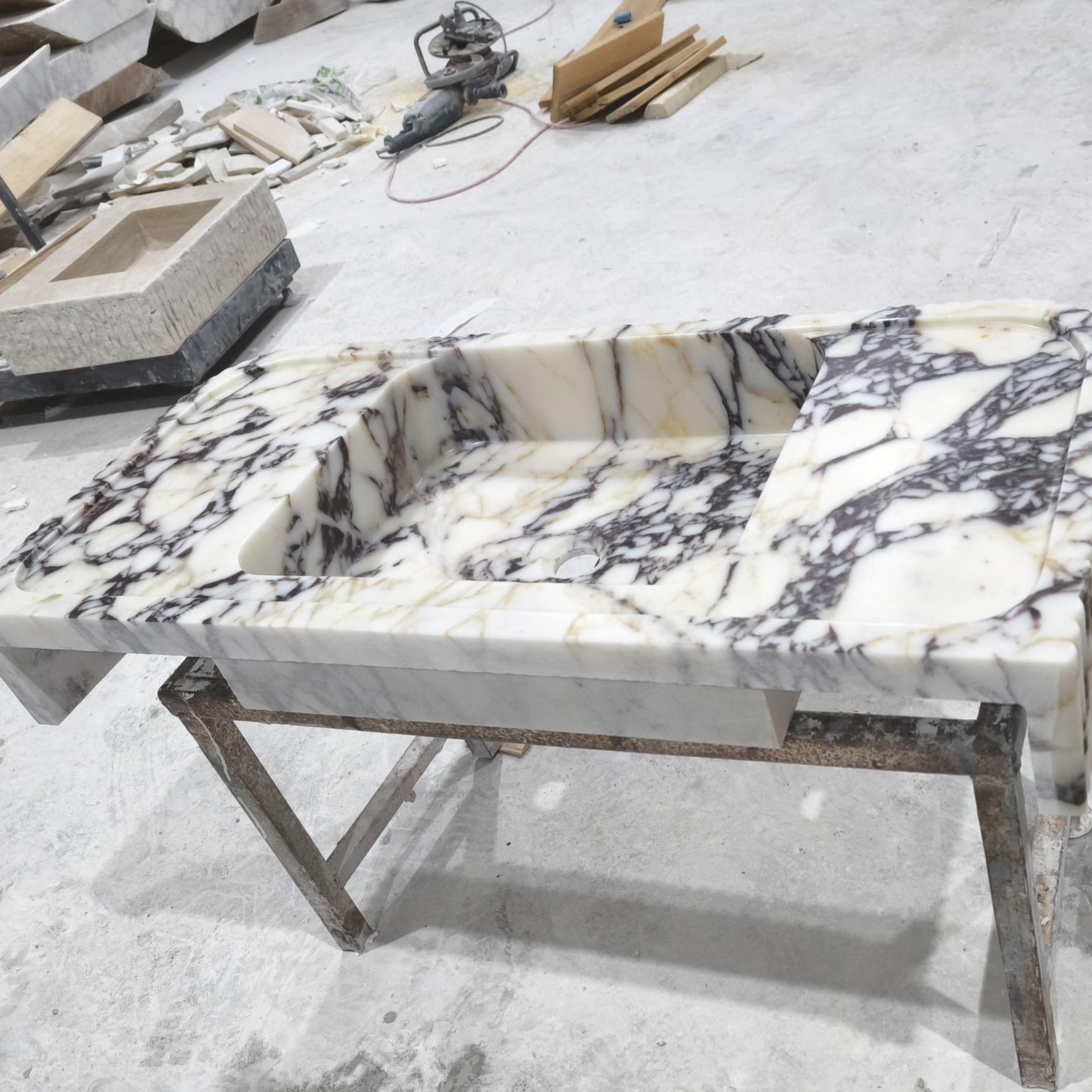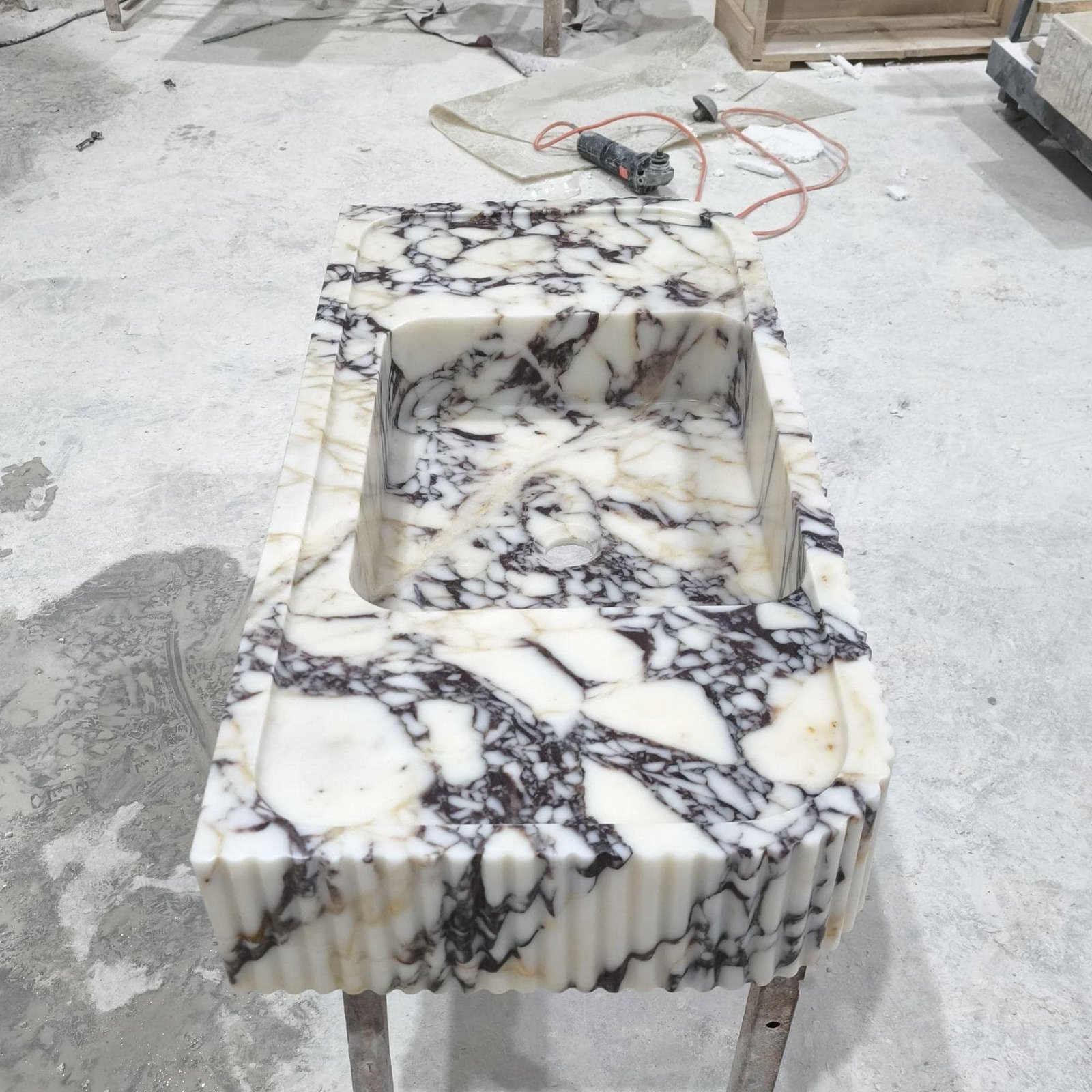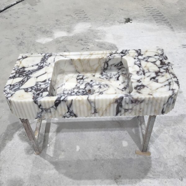 Upgrade your bathroom with this stunning Calacatta Viola marble sink (18x38x6″), a true statement piece of luxury and elegance. Crafted from high-quality natural marble, this washbasin features a bold veining pattern that makes each piece one-of-a-kind. Perfect for modern, minimalist, or contemporary interiors, this handcrafted sink adds a touch of timeless beauty to your home.