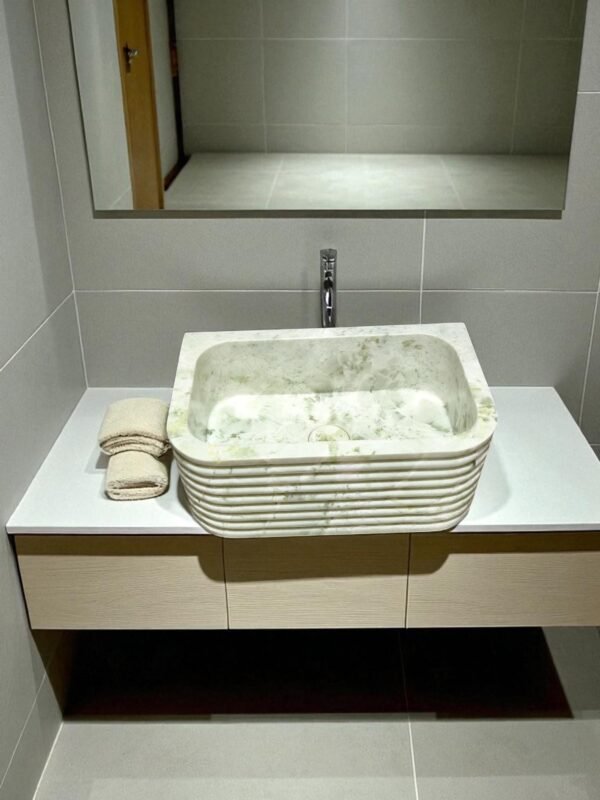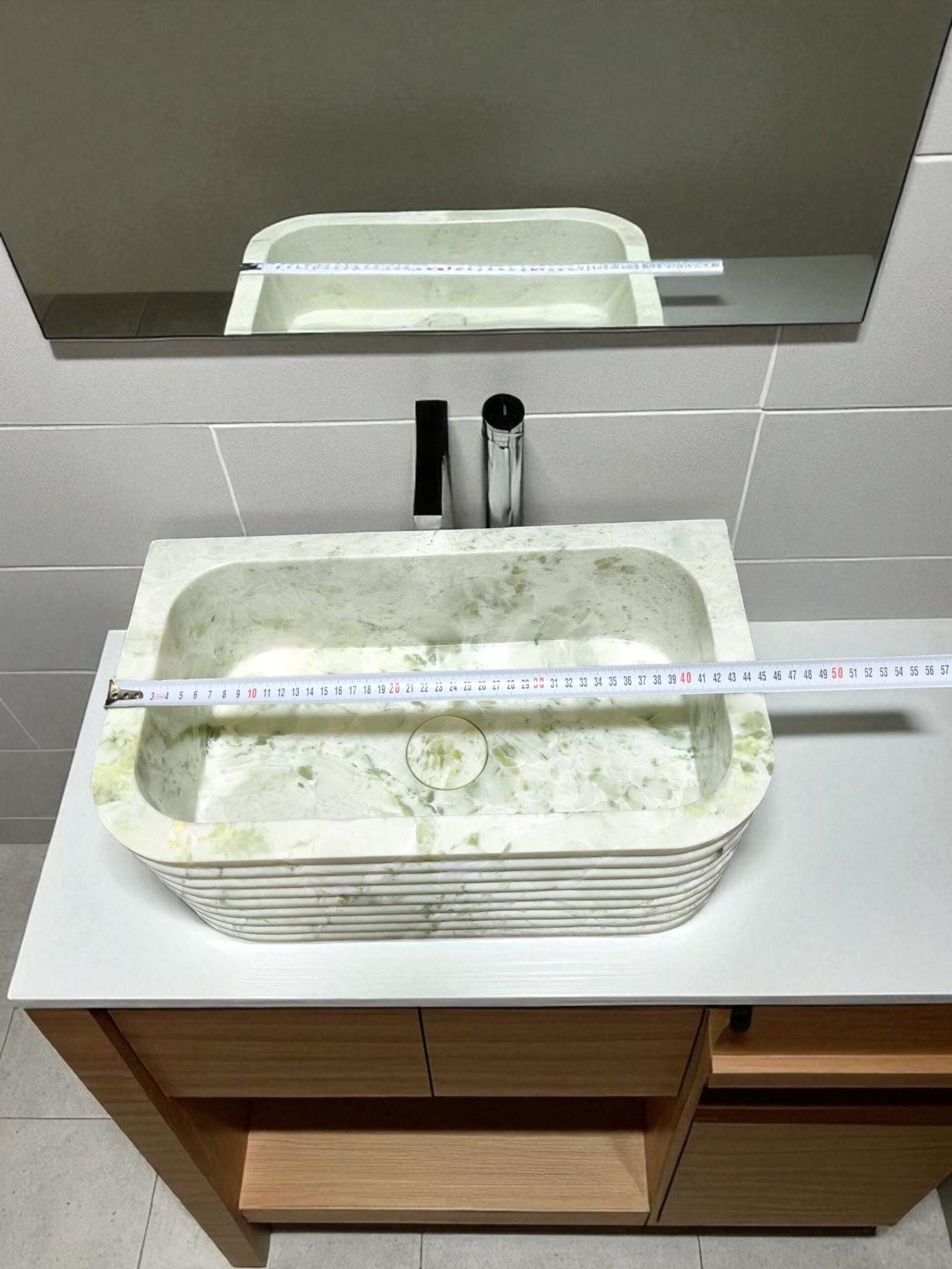 Crafted for design-forward interiors, this green marble sink features a rounded rectangular basin, deep fluted exterior, and rich organic veining. Sized at 12 x 20 x 8 inches (30.5 x 51 x 20 cm), it’s a powerful blend of bold natural beauty and minimalist sculptural form.