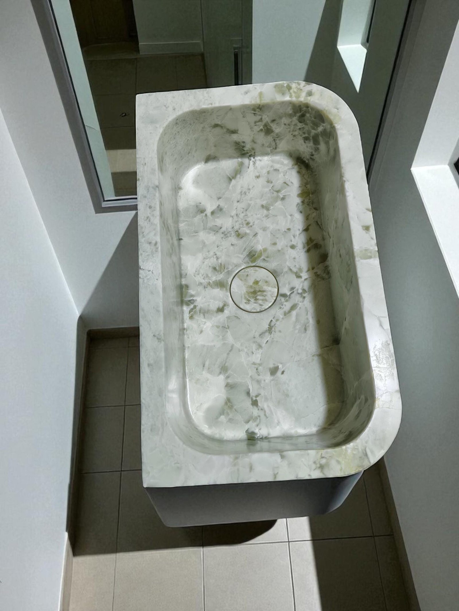 Perfect for small vanities or artistic powder rooms, this handmade stone sink offers an elegant yet grounded focal point. The unique green hues evoke serenity and strength, making it an unforgettable piece in both modern and earthy environments.