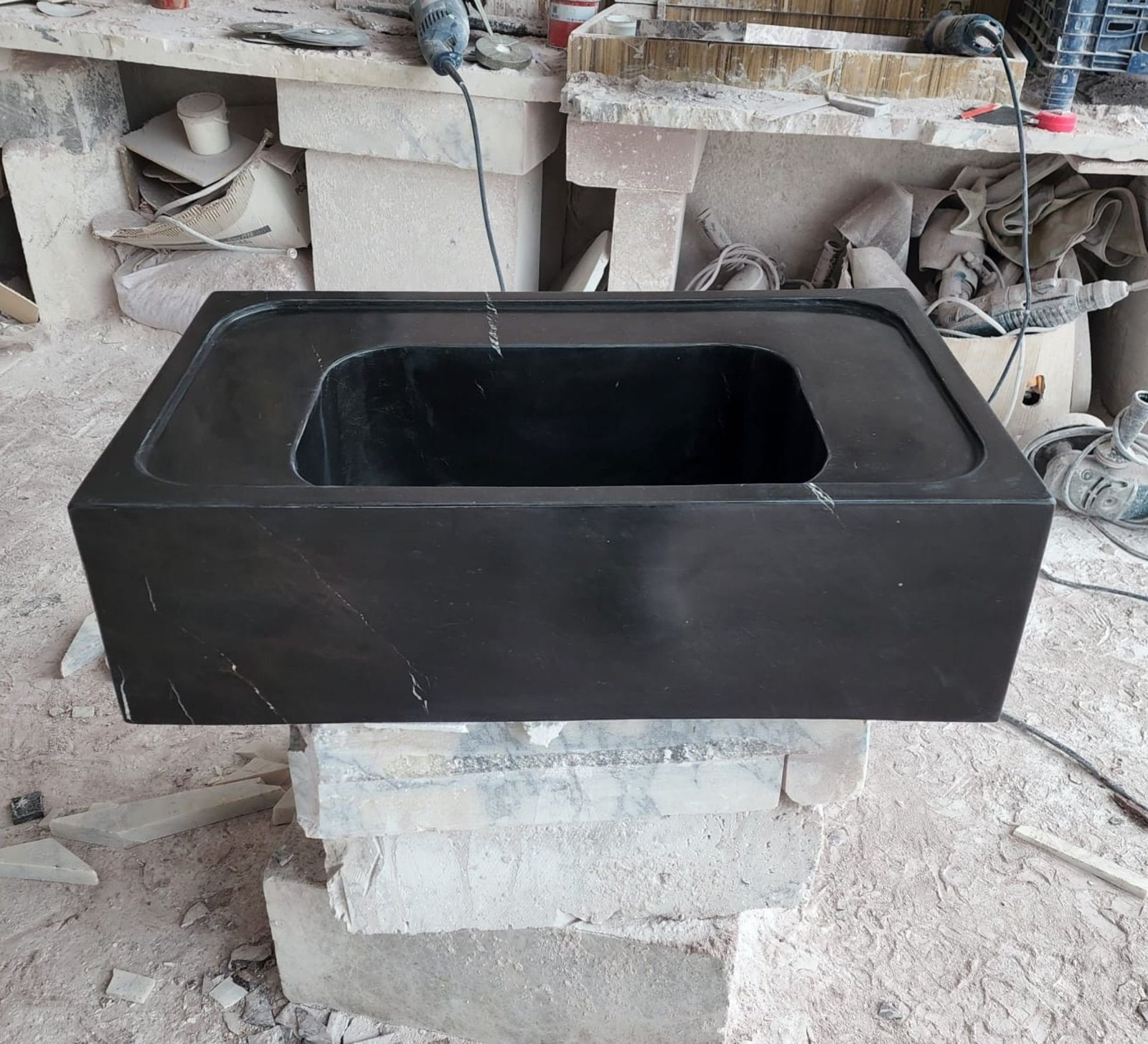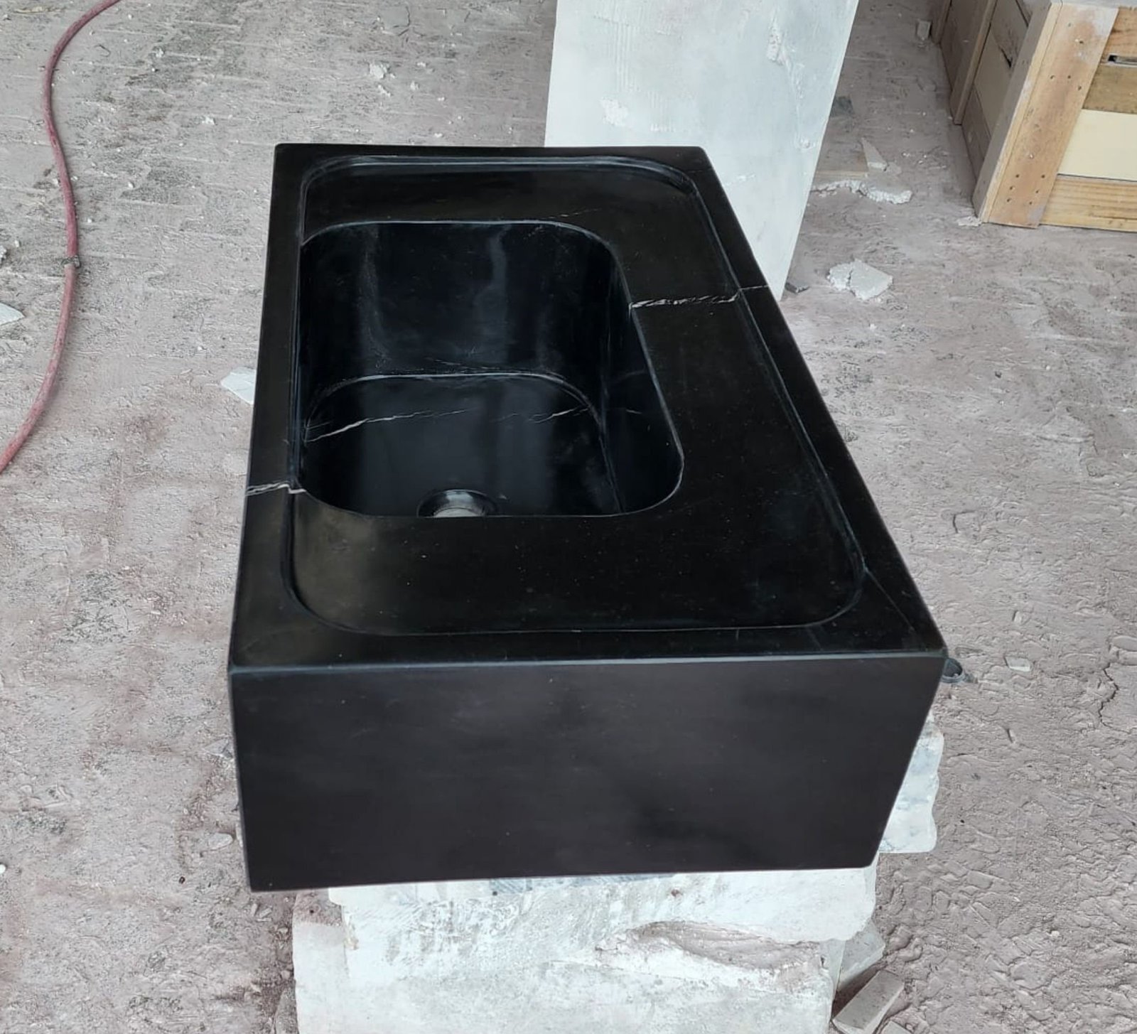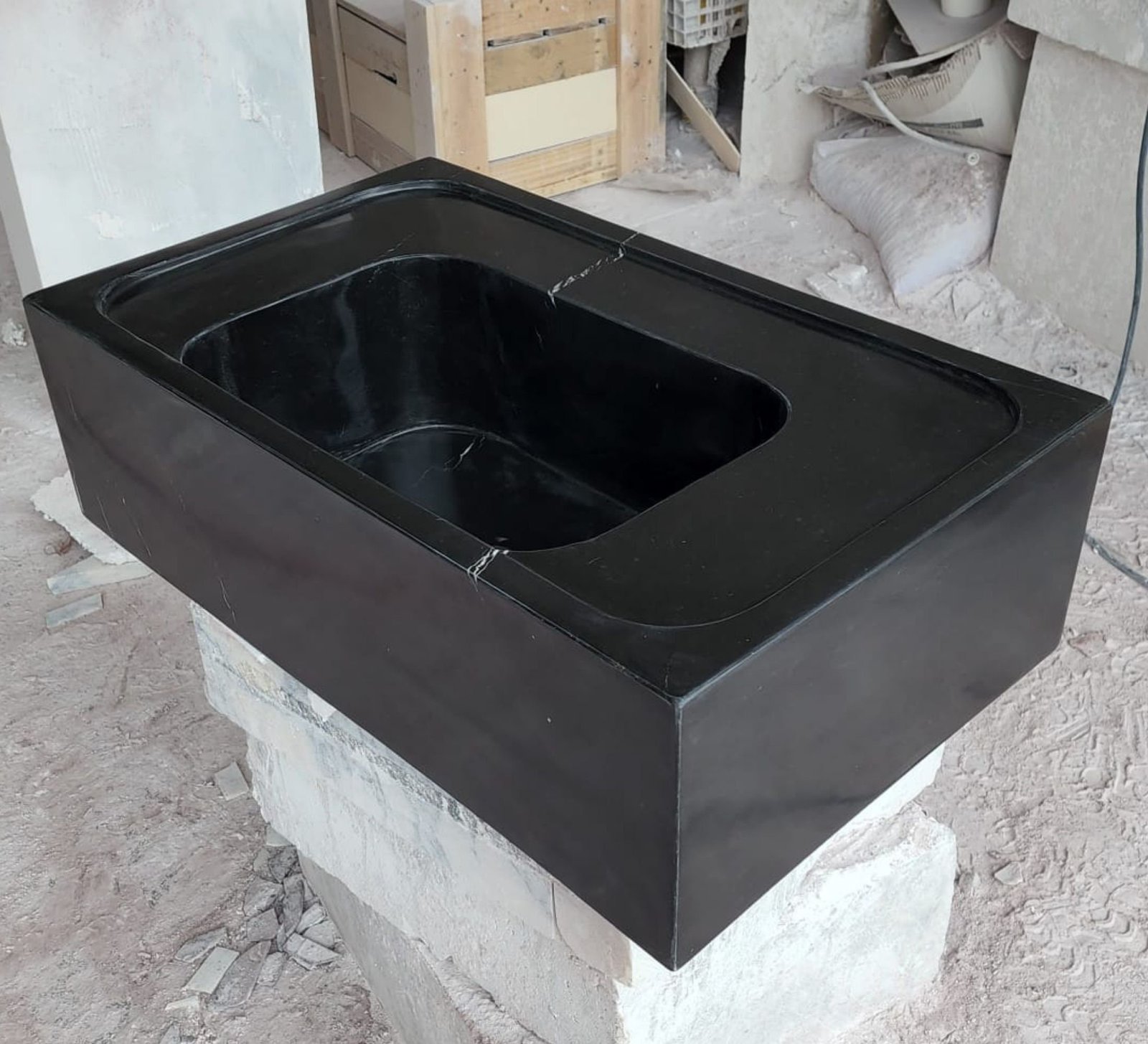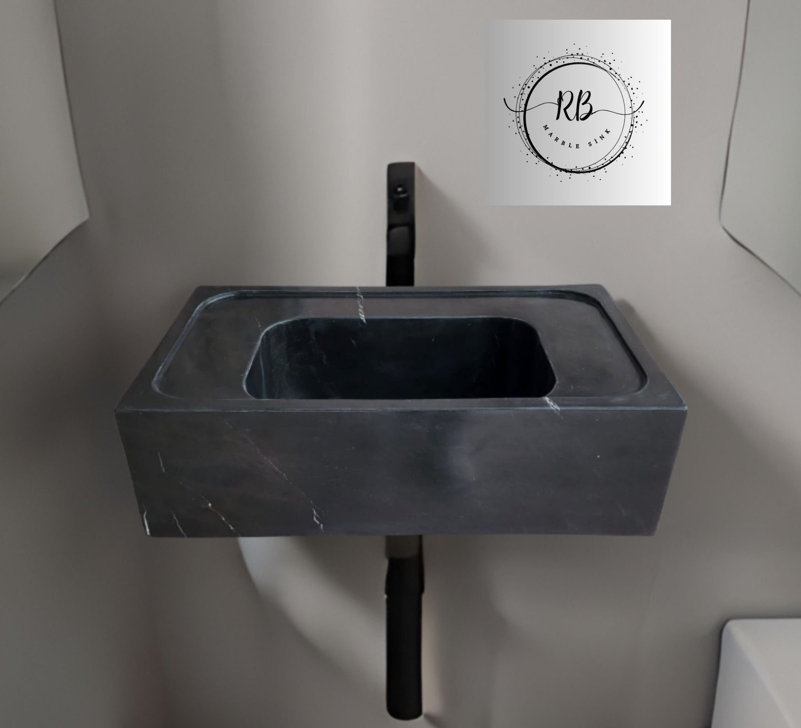 Elevate your bathroom decor with this stunning black marble sink, expertly crafted from premium Nero Marquina stone. Its sleek wall-mount design and natural stone finish add a touch of elegance and timeless beauty to your space. Perfect for custom orders, this handmade sink is an excellent choice for modern and antique-inspired bathrooms alike.