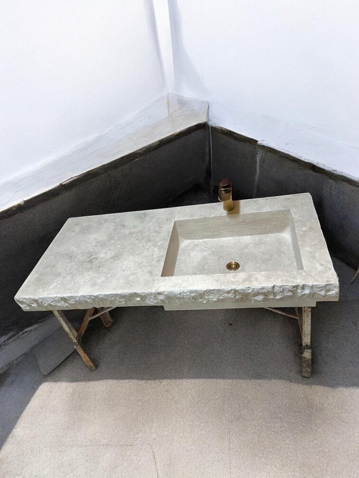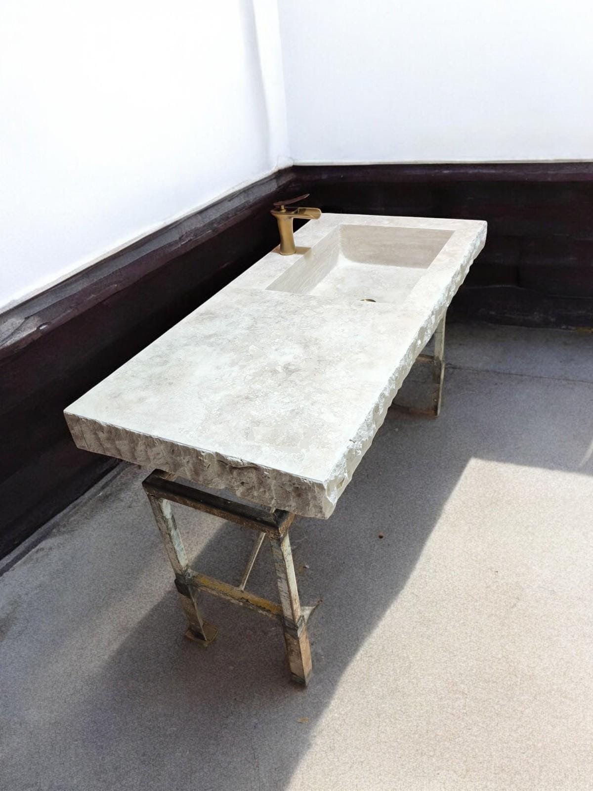 Handmade Travertine Countertop Sink: Rustic Carved Basin Vanity (24x52x7)