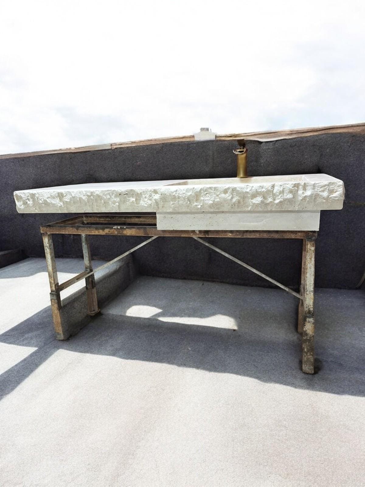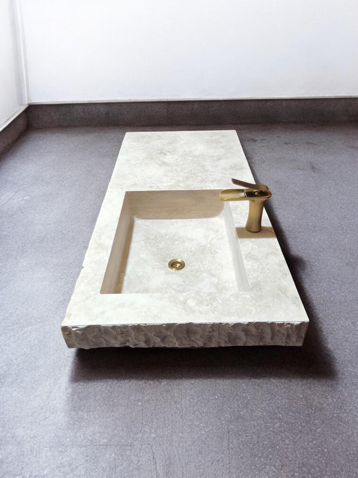 Add timeless charm and earthy sophistication to your bathroom with this handmade travertine countertop sink. Measuring a generous 24x52x4 inches, this single-block stone piece features a carved rectangular basin and a natural edge finish, blending rustic texture with refined craftsmanship.