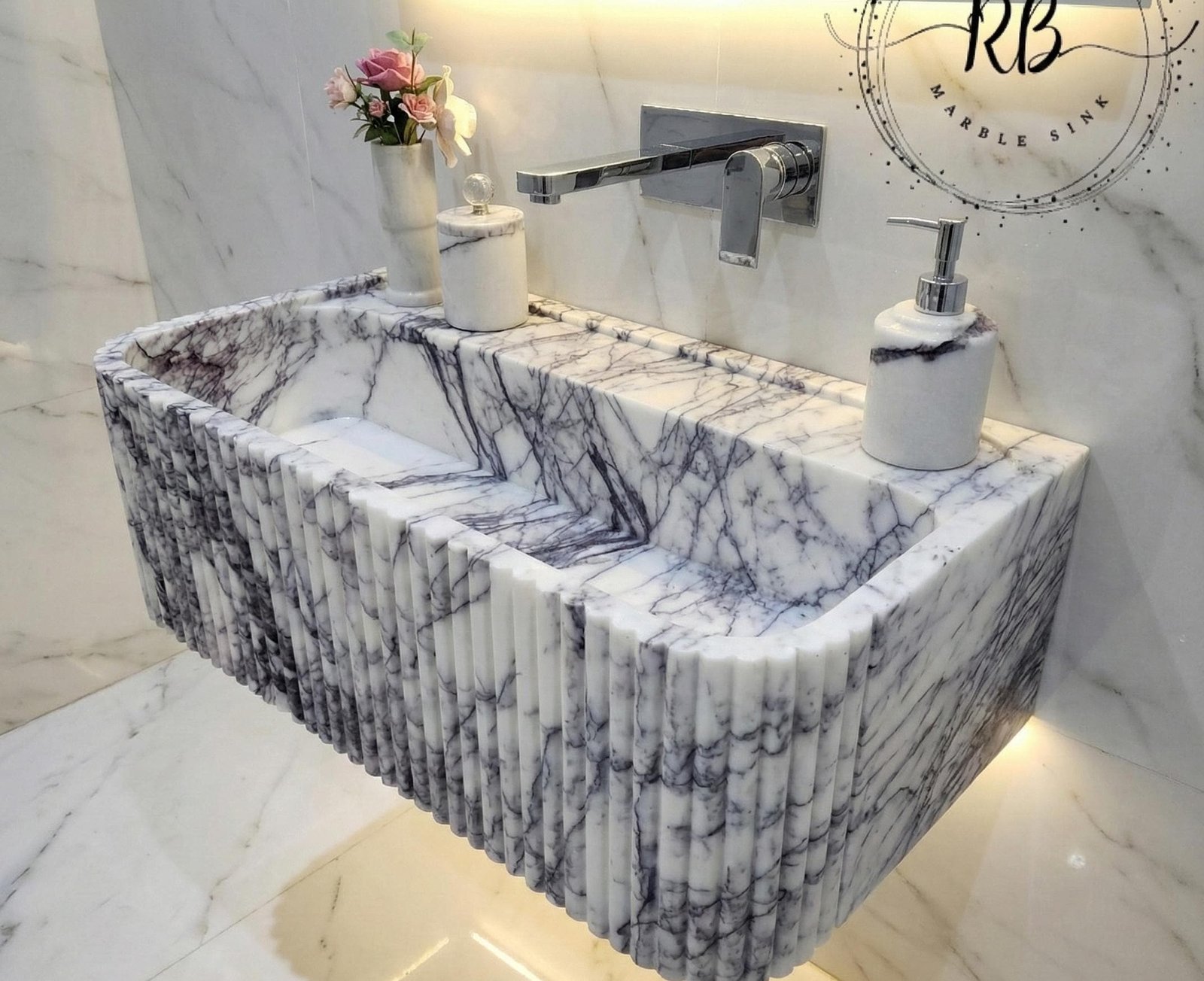 Lilac Marble Sink Hand Carved Round Corner Sink Ribbed Edges Wall Mounted Bathroom Sink Natural Marble Farmhouse Sink