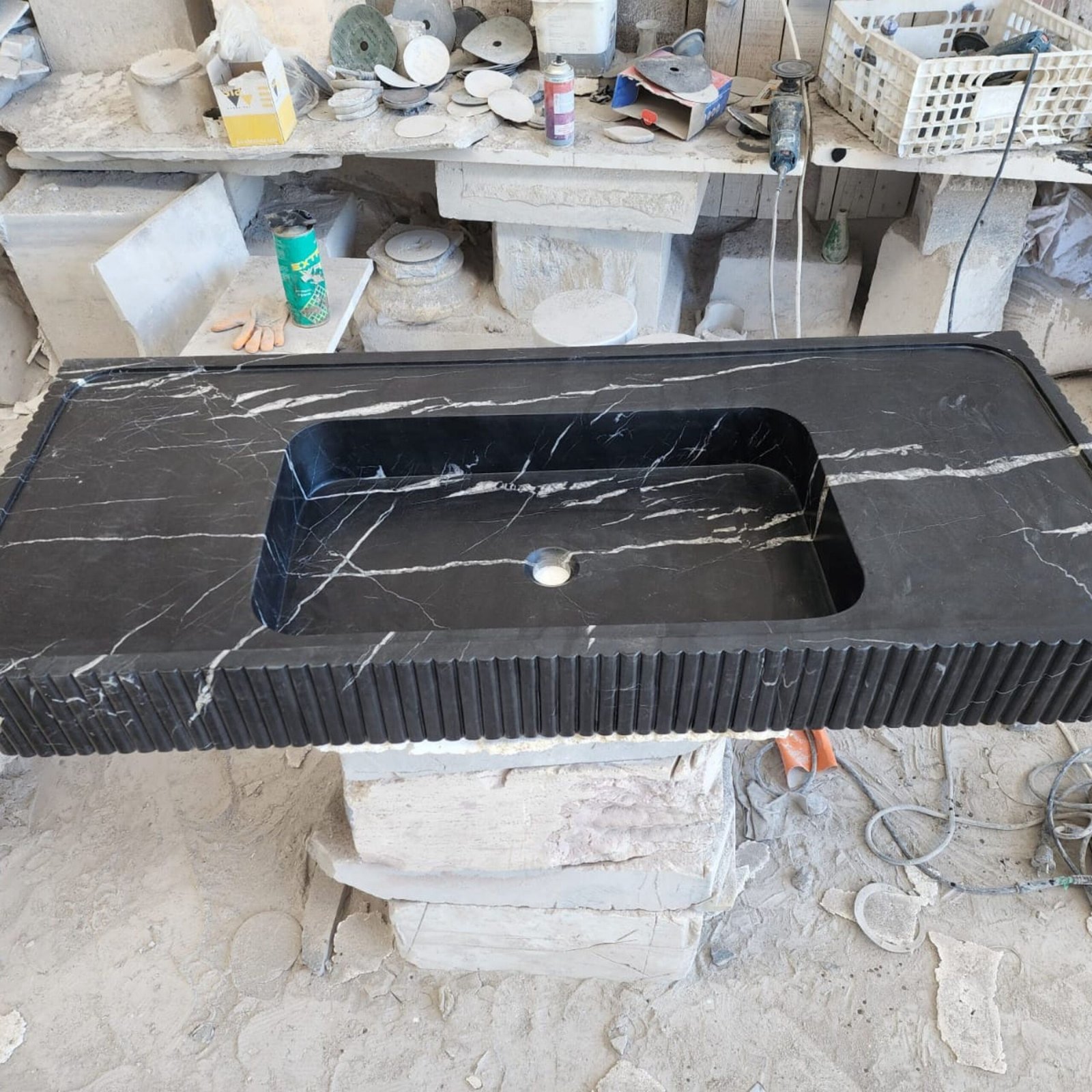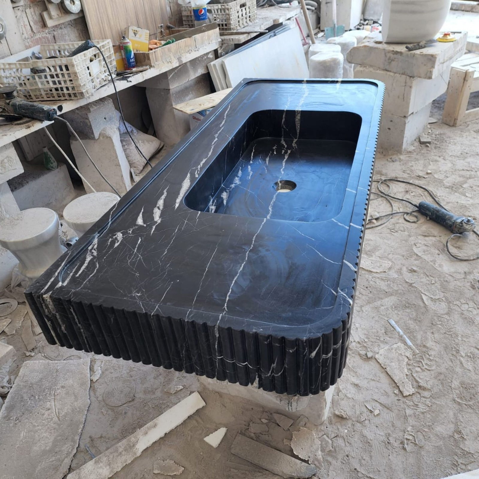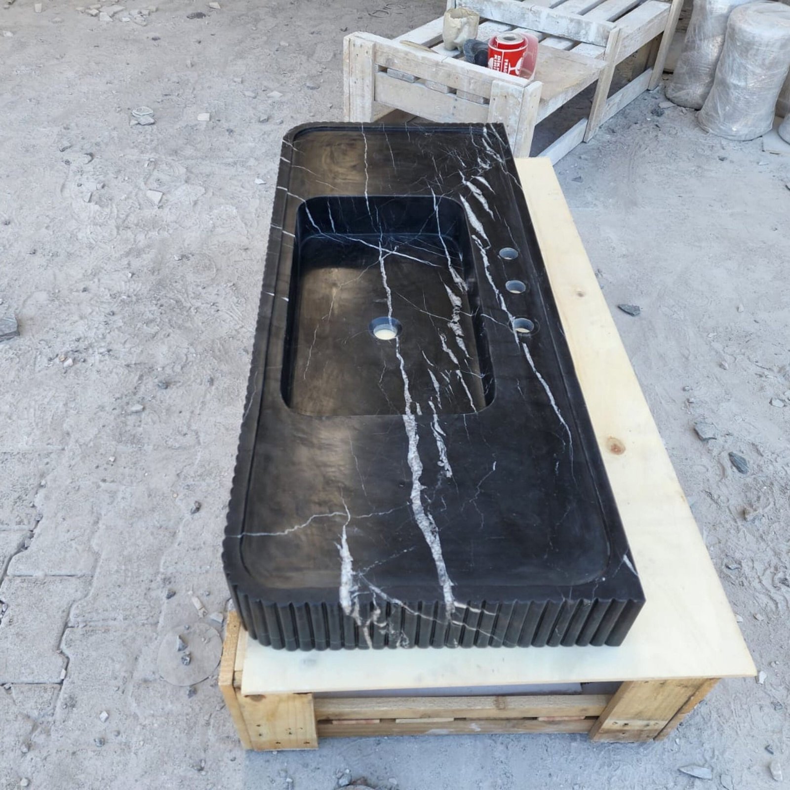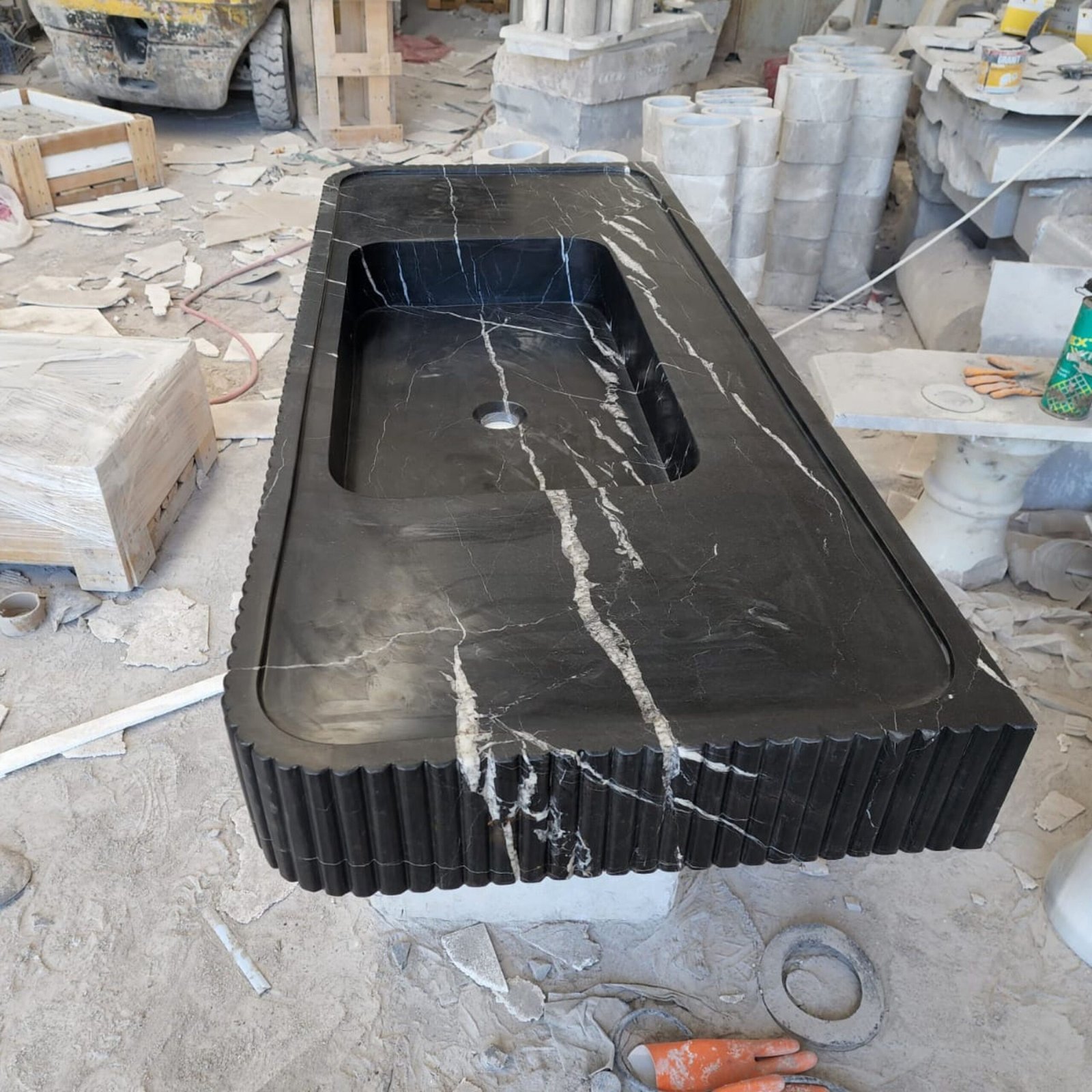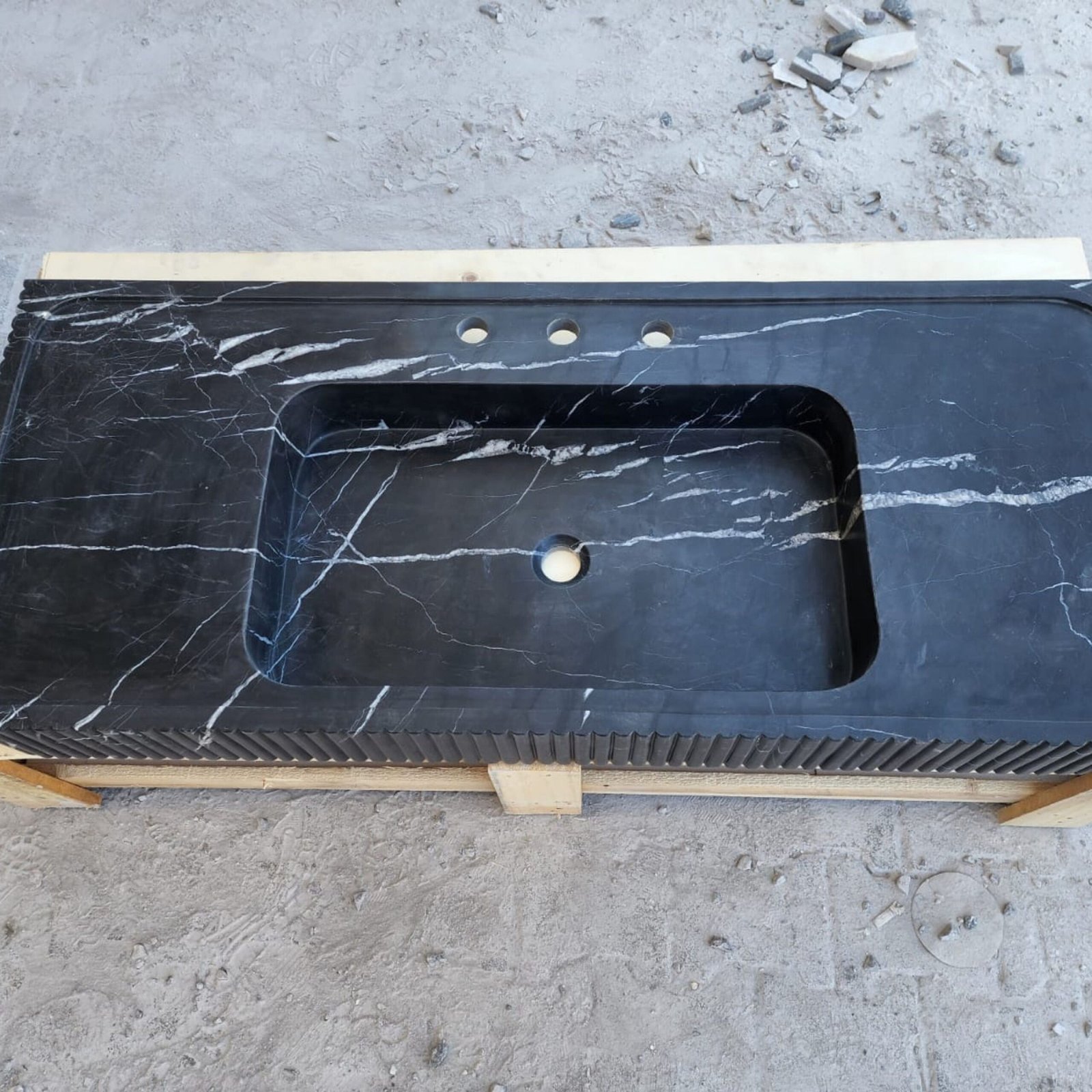 Nero Marquina Marble Sink: 48″ Grooved Black Vanity, Honed Finish