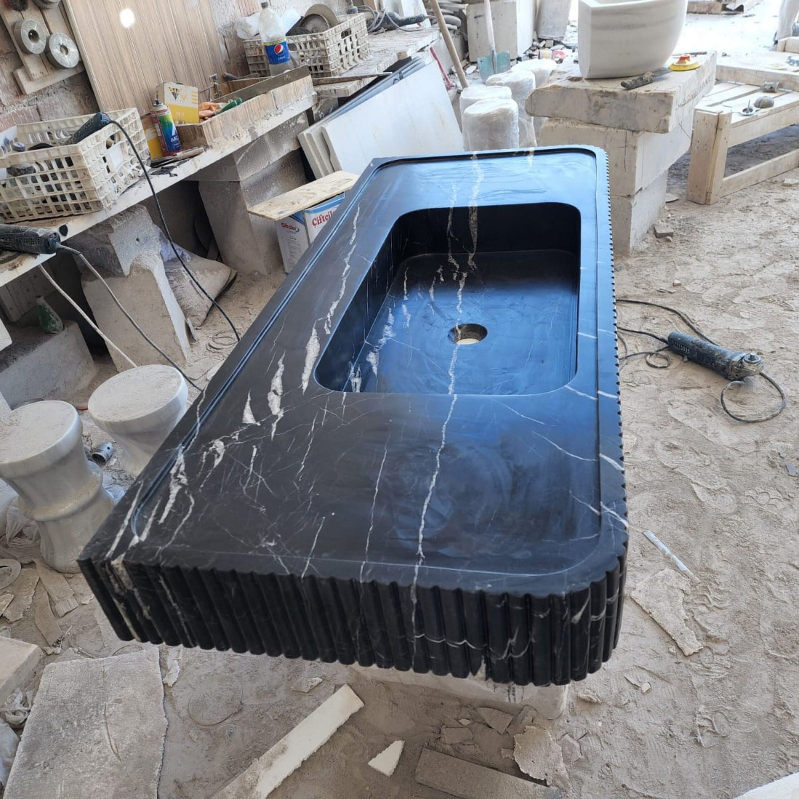 Enhance your space with the dramatic beauty of the Nero Marquina Grooved Marble Sink — a luxurious wall-mounted vanity carved from deep black marble with striking white veining. The grooved front detail blends modern elegance with artisan craftsmanship, offering a timeless focal point for designer bathrooms.