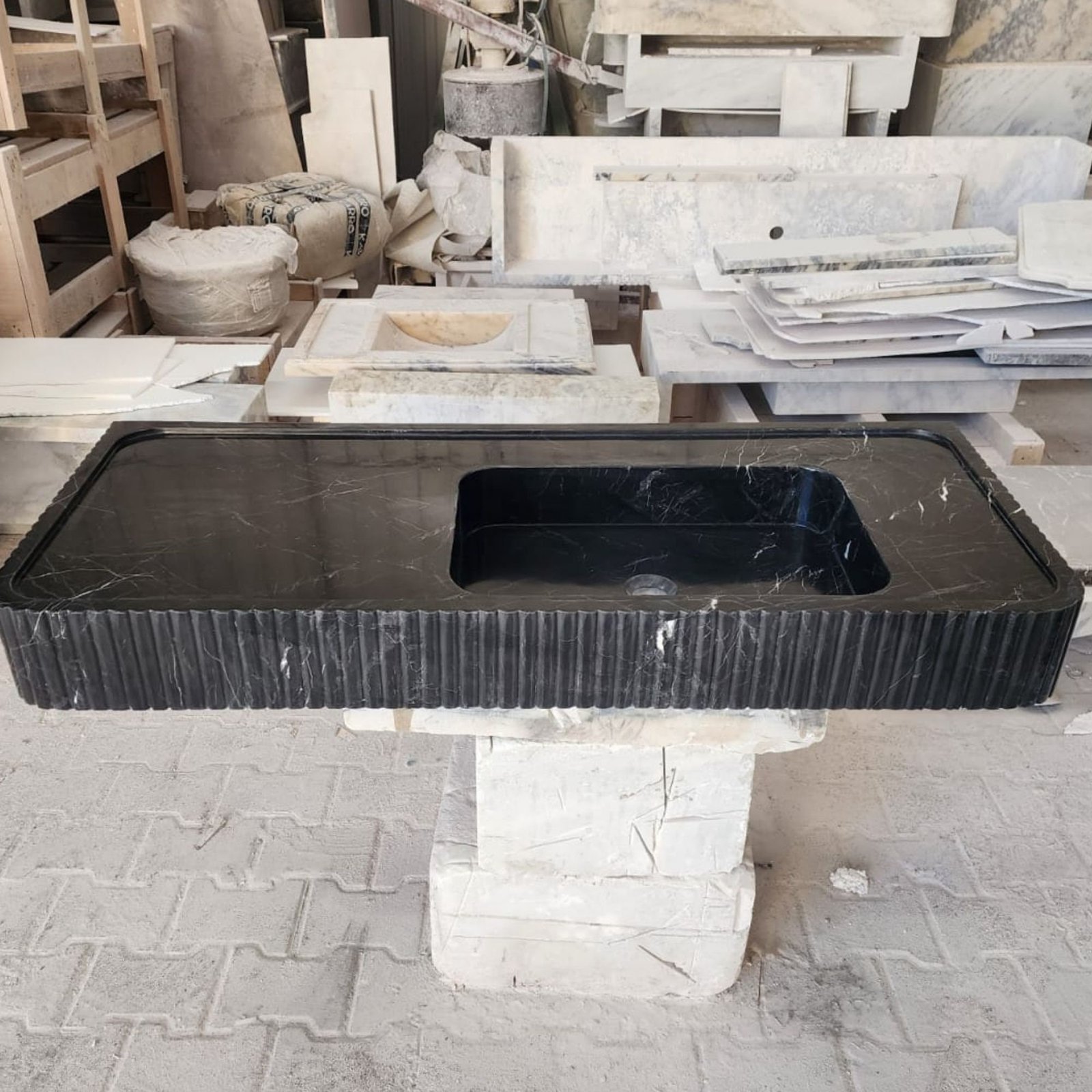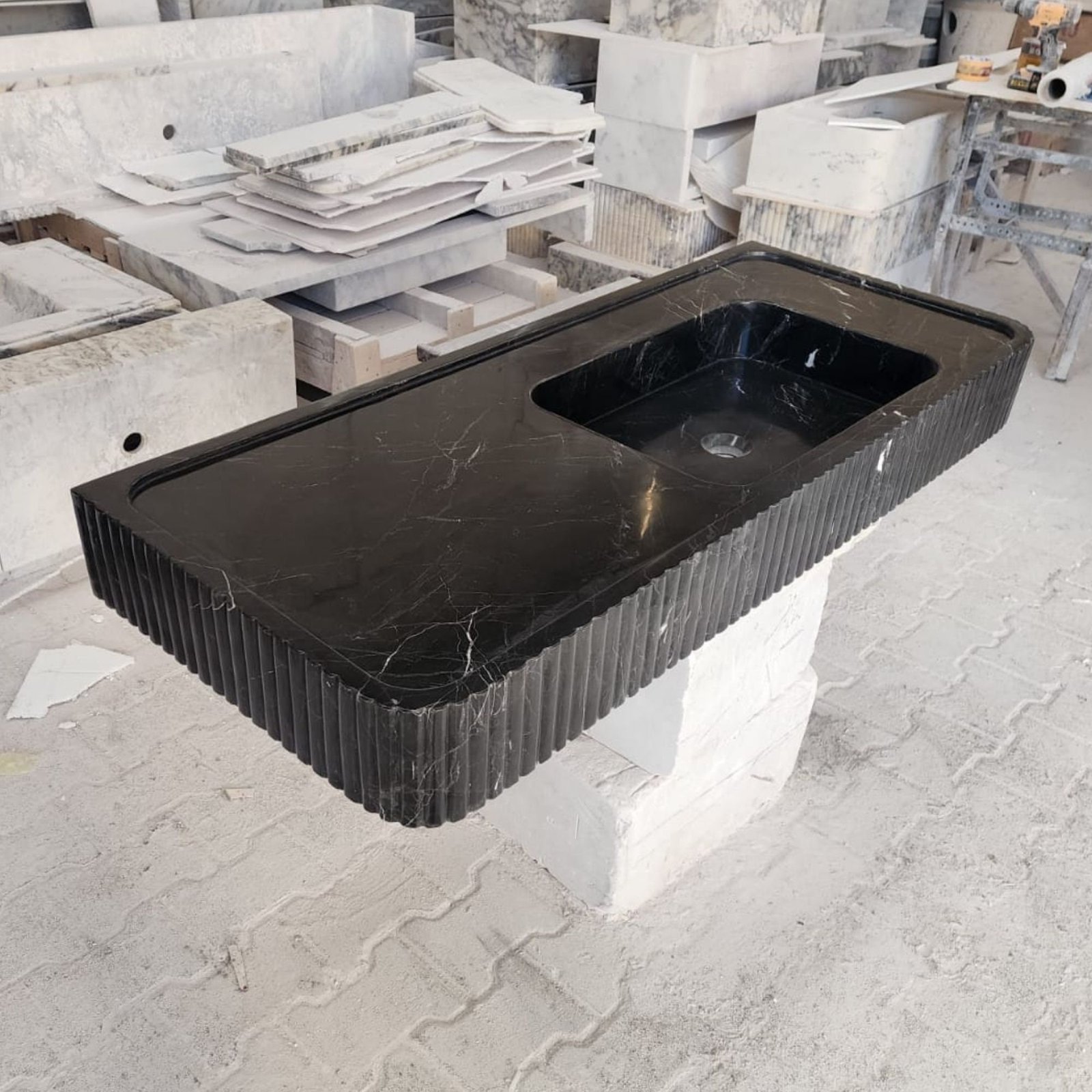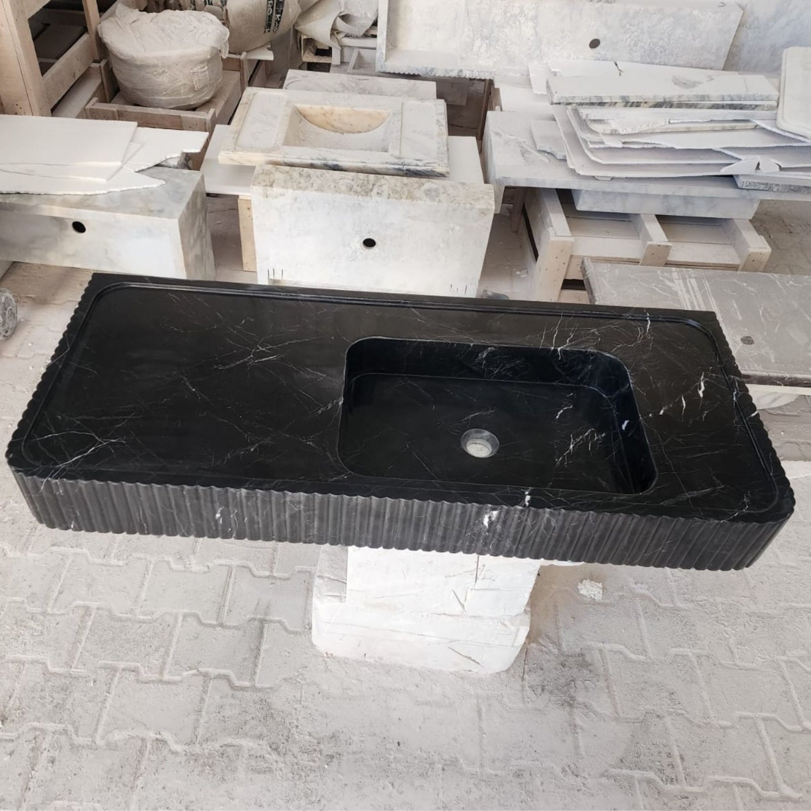 Make a bold statement in your bathroom with this Nero Marquina marble sink. Featuring a sleek fluted front design, this black marble sink is both elegant and functional. Perfect for wall-mounted installation, it is an excellent addition to powder rooms or luxury bathroom interiors. Crafted from premium natural stone, its timeless design ensures durability and sophistication. Whether used as a focal point or a complement to your modern decor, this sink combines high-end style with practicality.