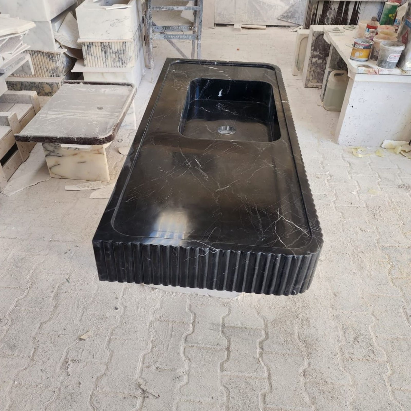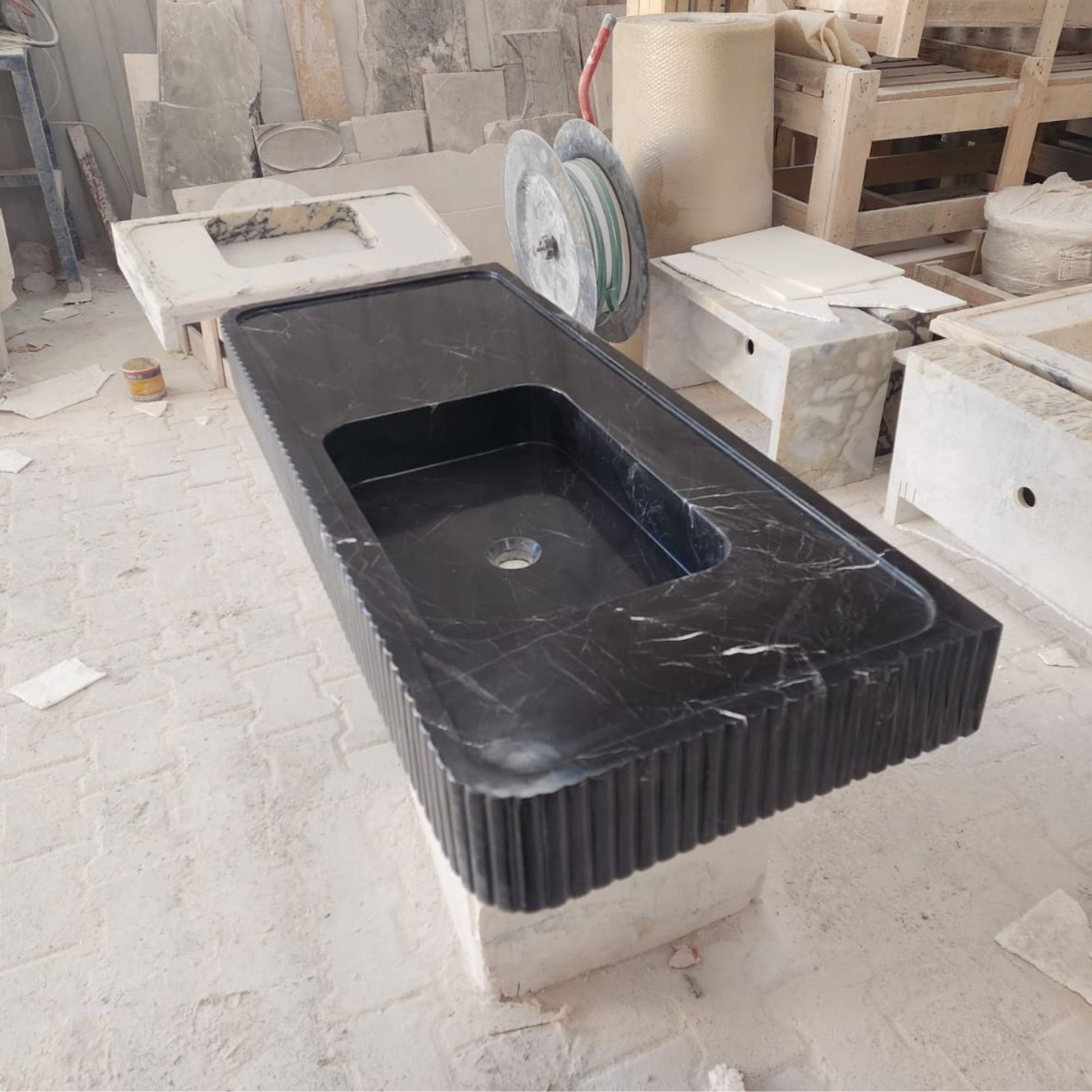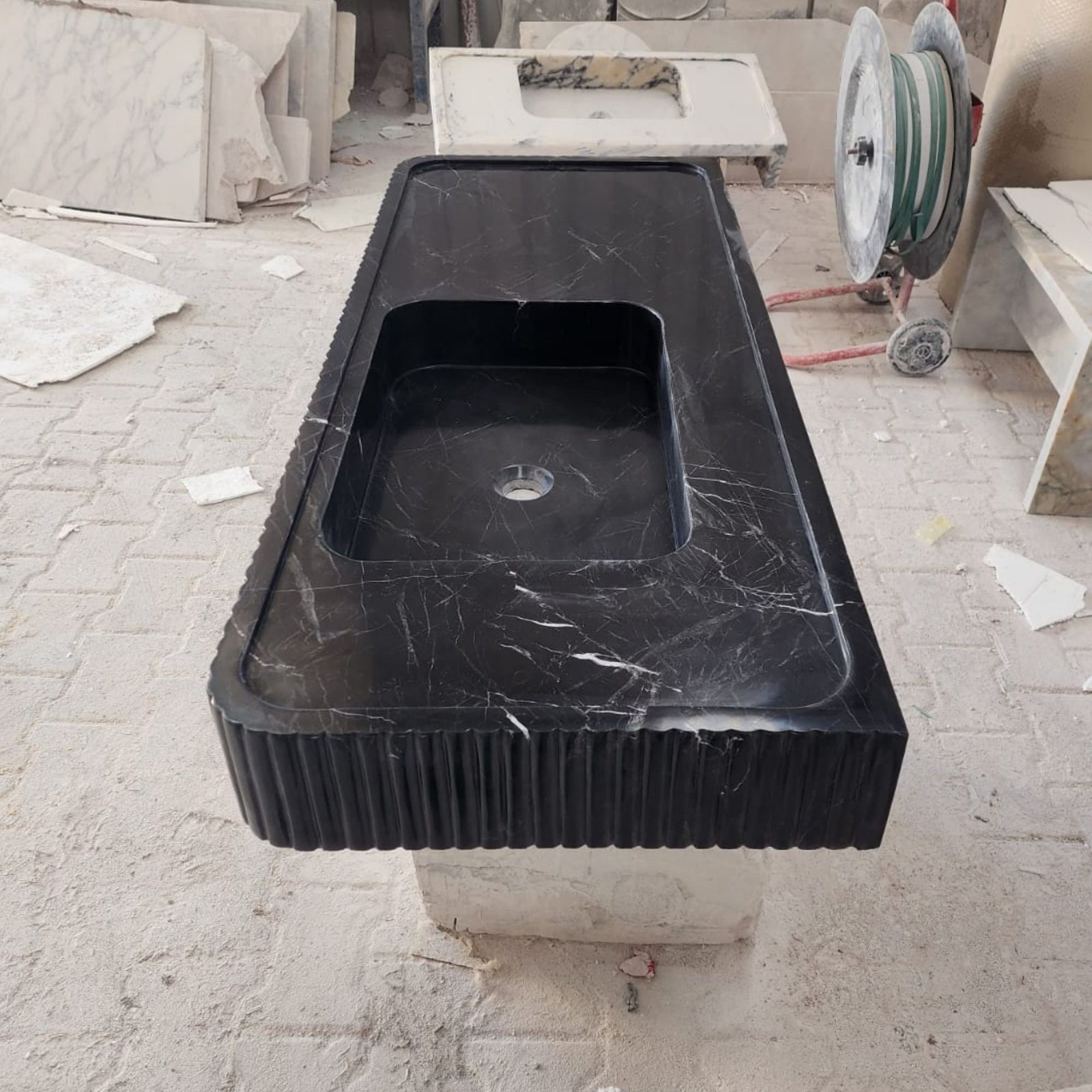Make a bold statement in your bathroom with this Nero Marquina marble sink. Featuring a sleek fluted front design, this black marble sink is both elegant and functional. Perfect for wall-mounted installation, it is an excellent addition to powder rooms or luxury bathroom interiors. Crafted from premium natural stone, its timeless design ensures durability and sophistication. Whether used as a focal point or a complement to your modern decor, this sink combines high-end style with practicality.