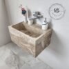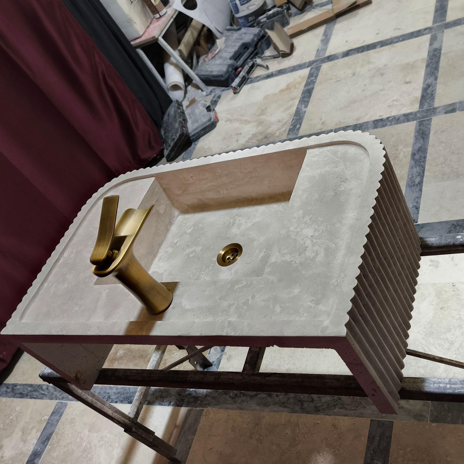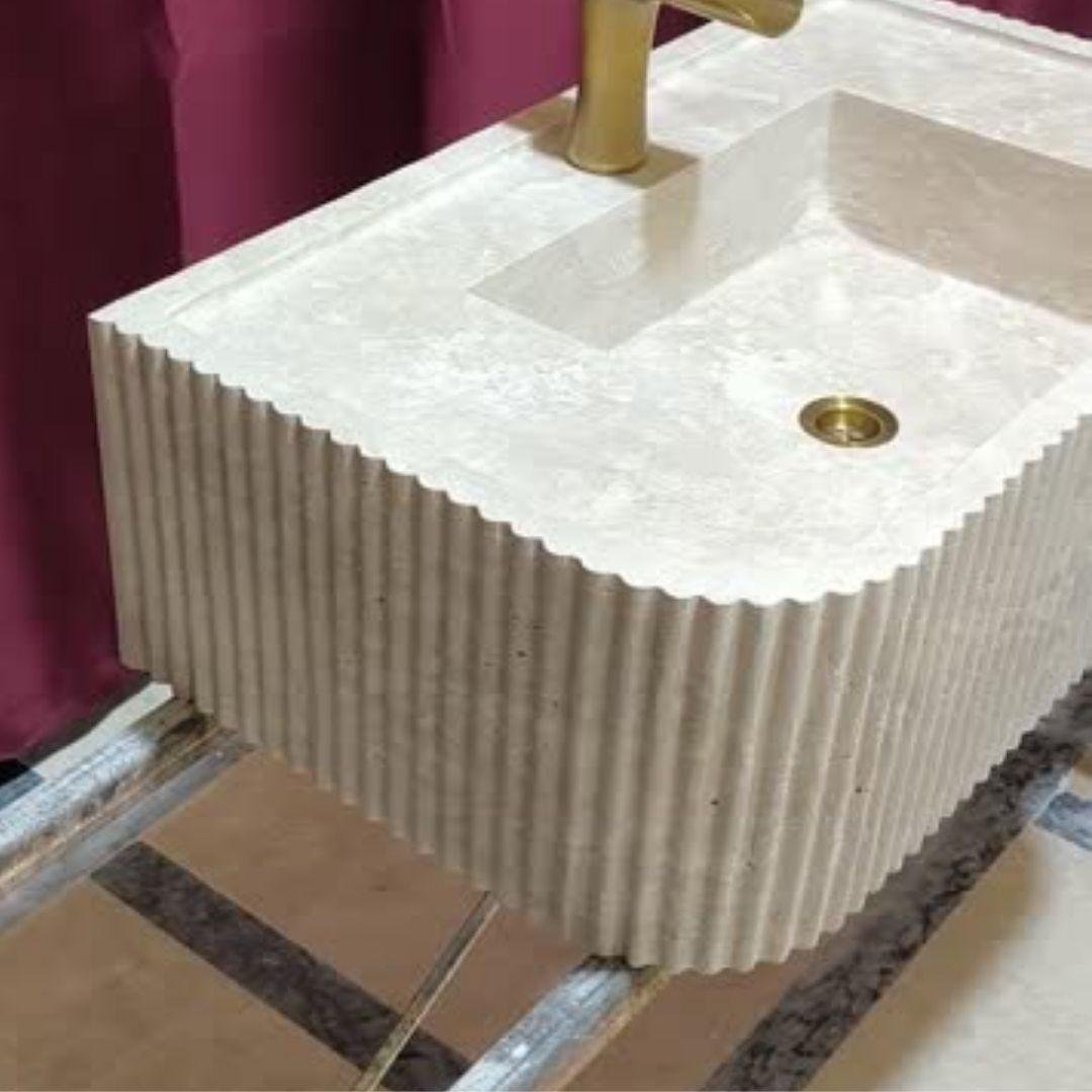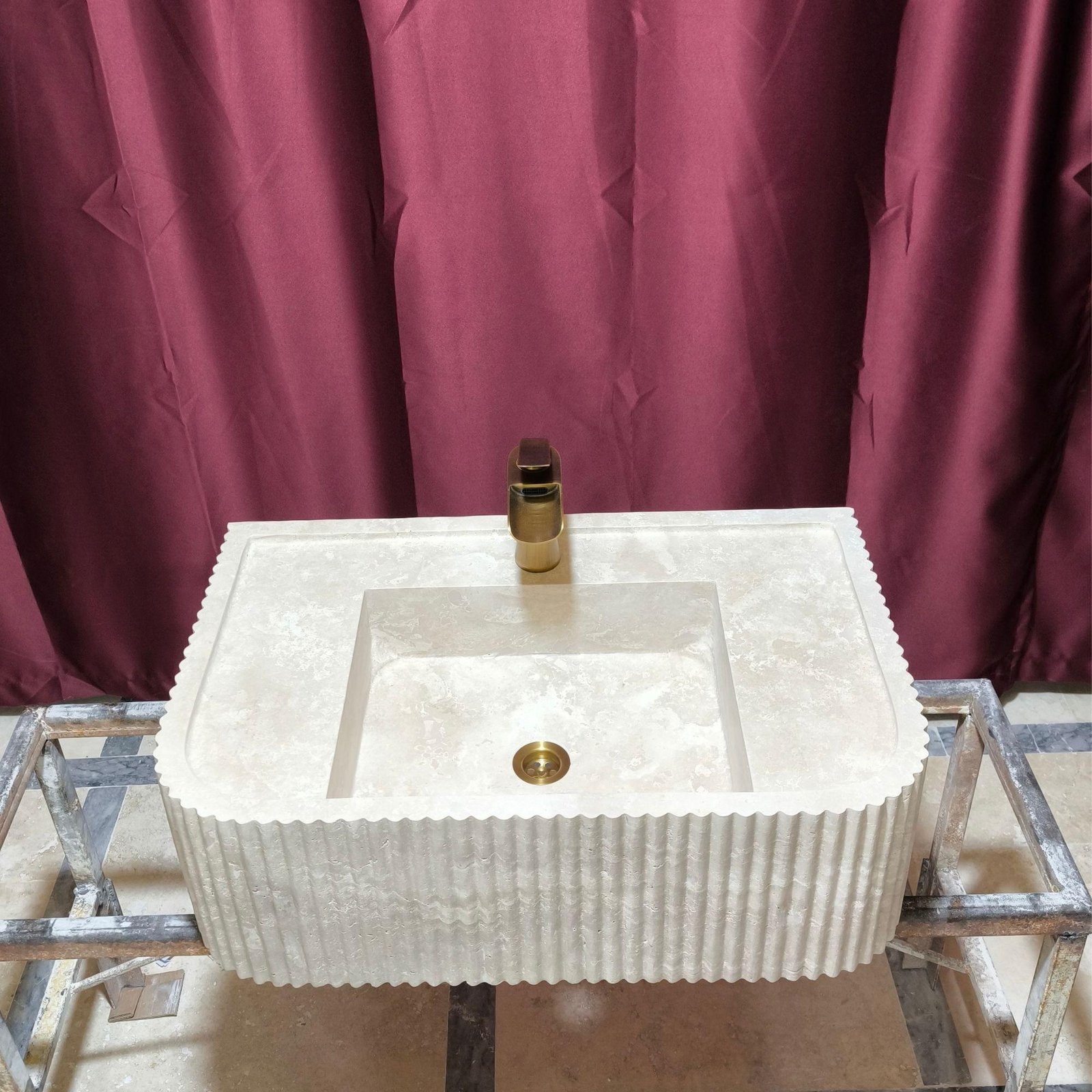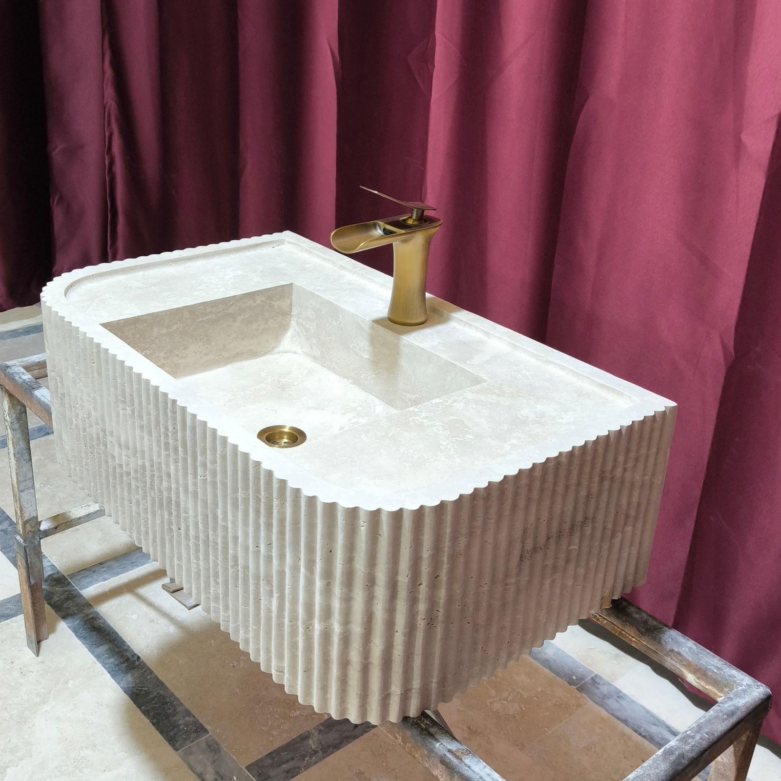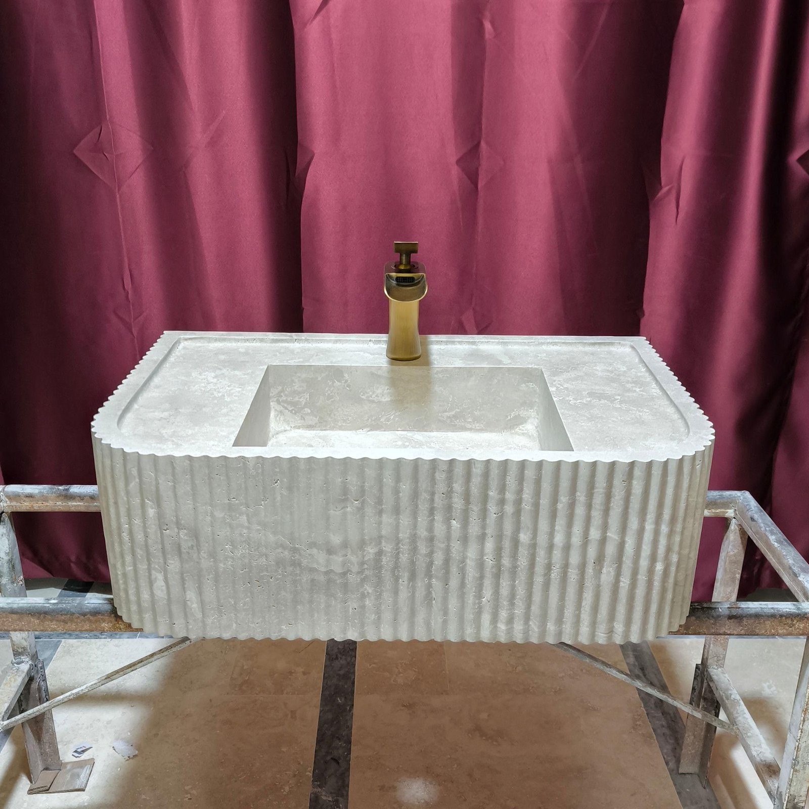 Enhance your bathroom with the timeless elegance of our Rustic Travertine Marble Sink, which features a grooved front design that adds a unique texture to your space. This stone vessel sink mounts on the wall and provides a sleek, modern look while maximizing counter space. Ideal for farmhouse style bathrooms, powder rooms, or any vanity setup, this custom marble sink is perfectly crafted.