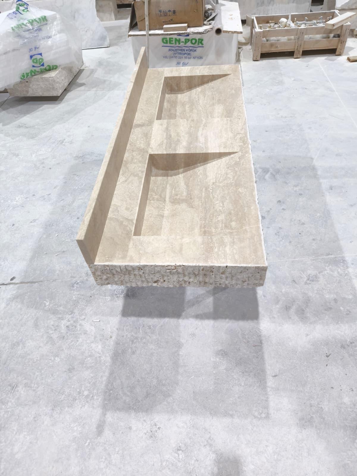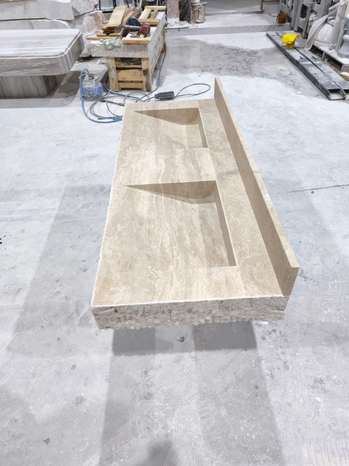 Each basin is precision-carved from a single travertine block, offering symmetry, durability, and timeless elegance.