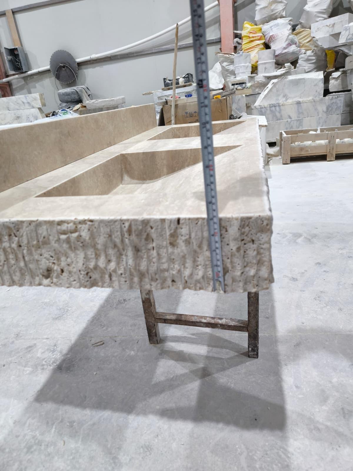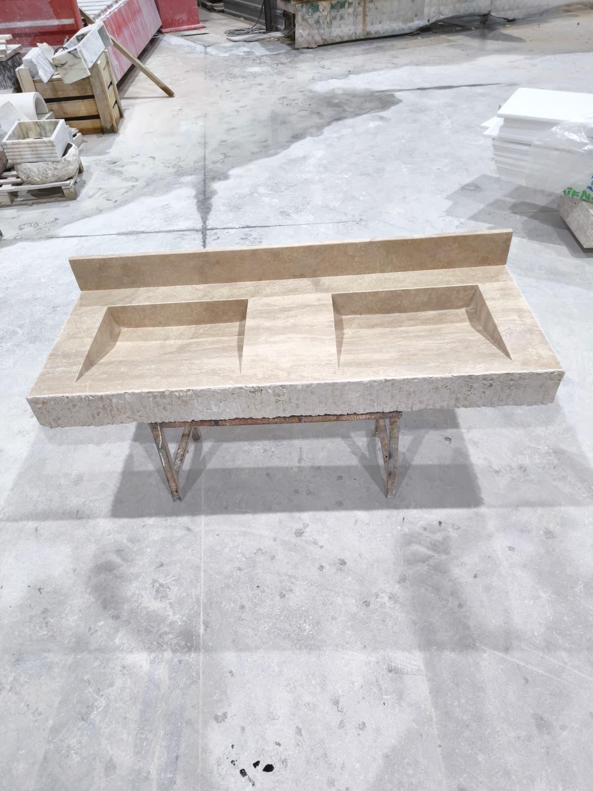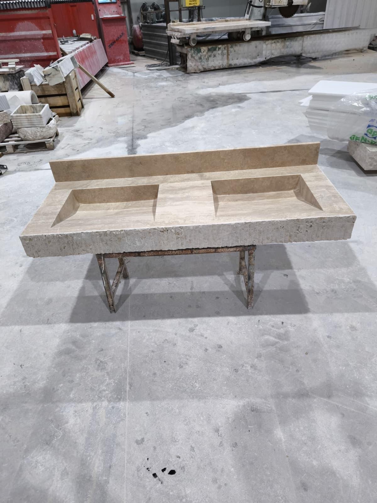 For Gina: A travertine double basin marble sink with dimensions of 1.8″ x 5.10″ x 6″ backsplash (10″) will be manufactured according to the measurements detailed in the list. Drainage and faucet hole information is also included in the attachment. Production time is 1-5 weeks. Shipping is included. In addition to the purchased bracket, one more set of brackets and two marble liquid soap dispensers will be given as a gift.