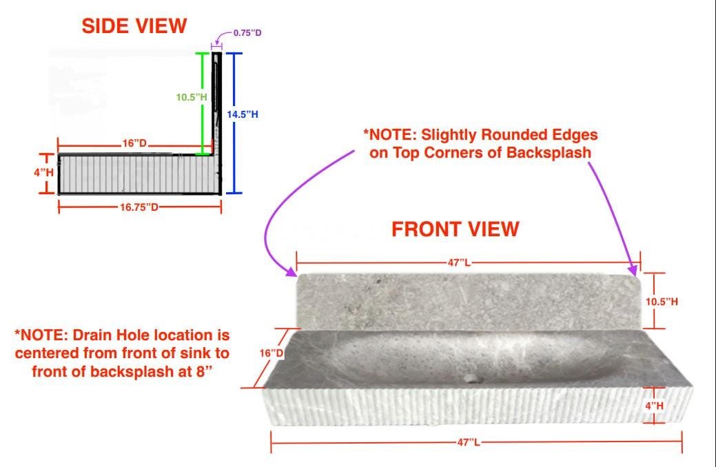 For Shelby: 16.75″x47x4″ backsplash 10.5″ is produced from tundra gray marble as shown in the pdf photo at the end of the listening. Production is made from the same honed sample stone as sent. Shipping is included. Customs duties are excluded.