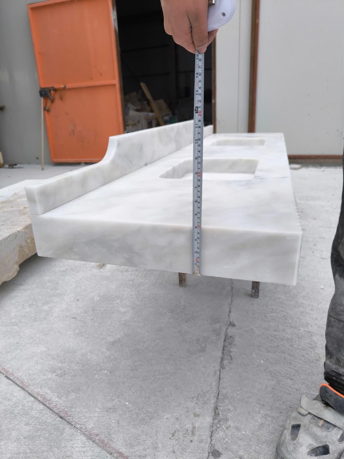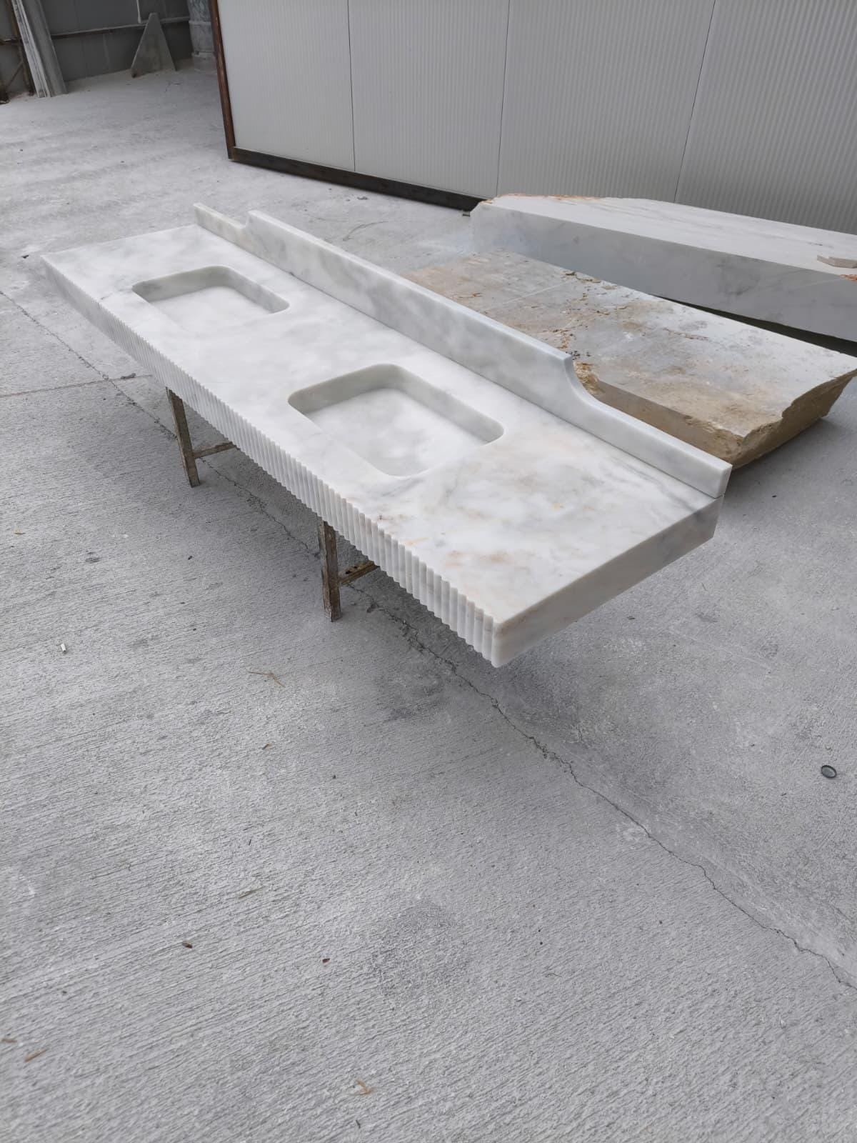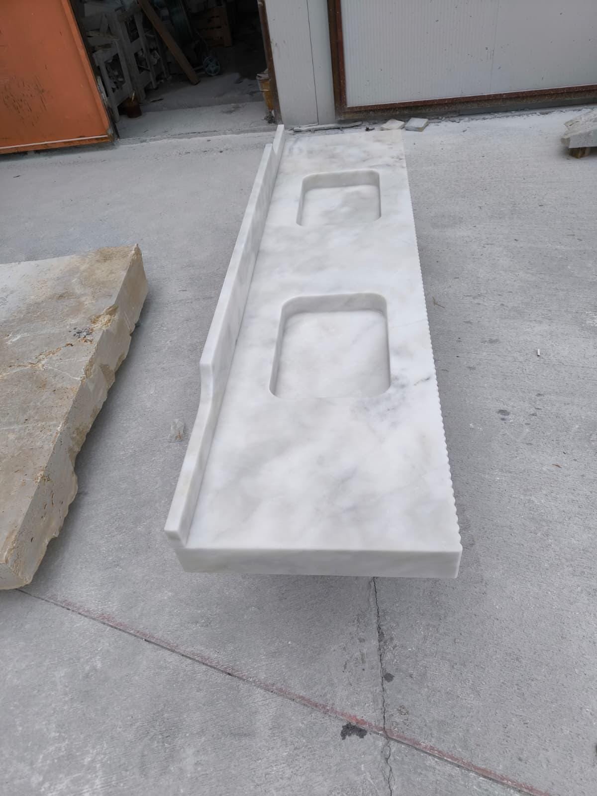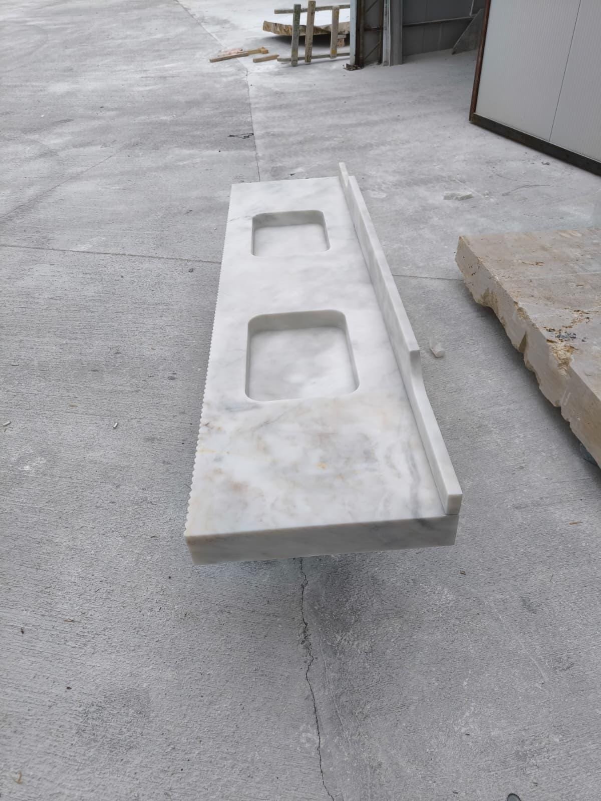 Bring timeless elegance to your bathroom with this Turkish Sugar marble sink, handcrafted from premium white and gold-veined marble. Designed with a double basin layout and an integrated backsplash, this luxury vanity top offers both beauty and functionality for modern and classic interiors.