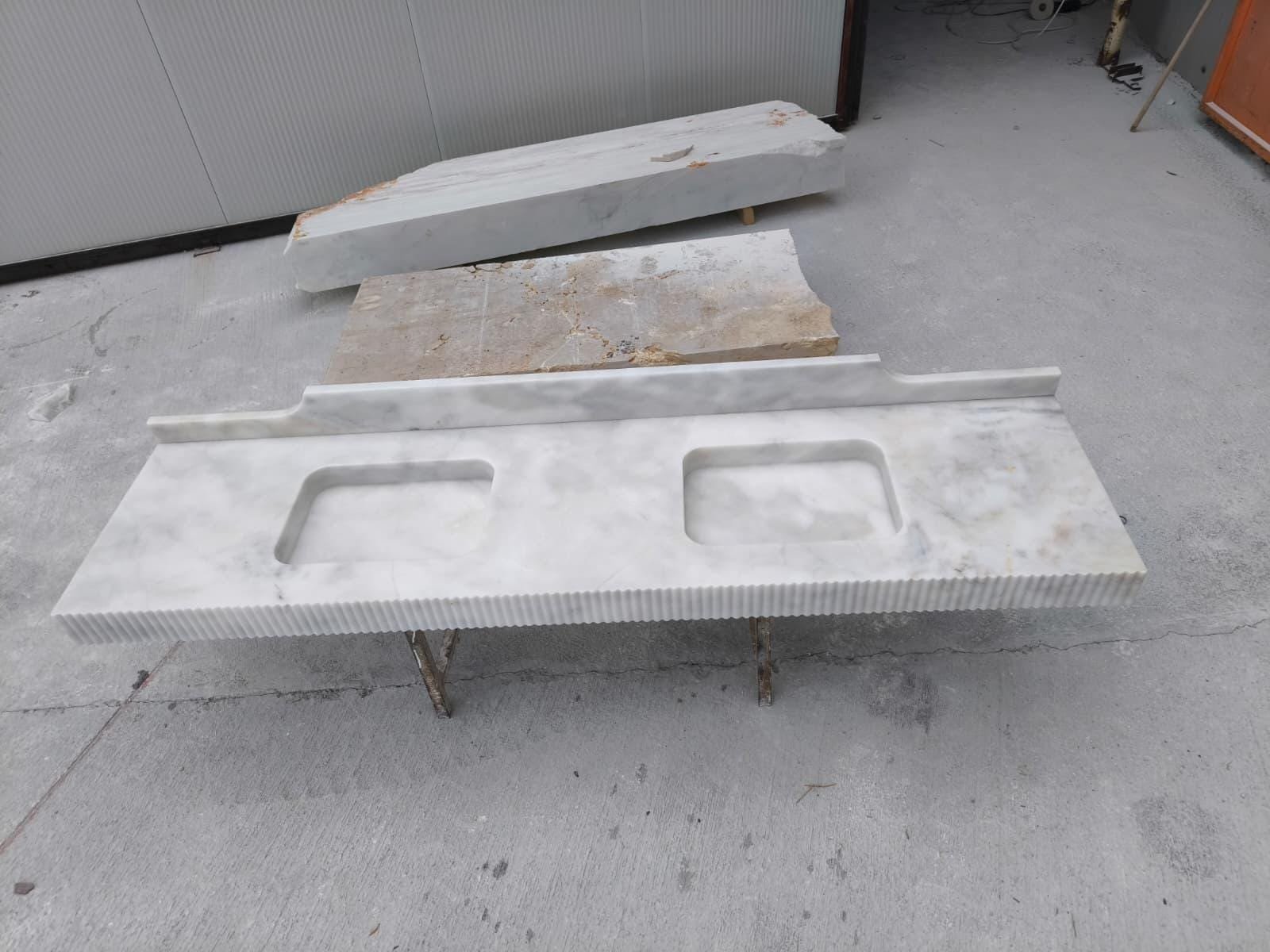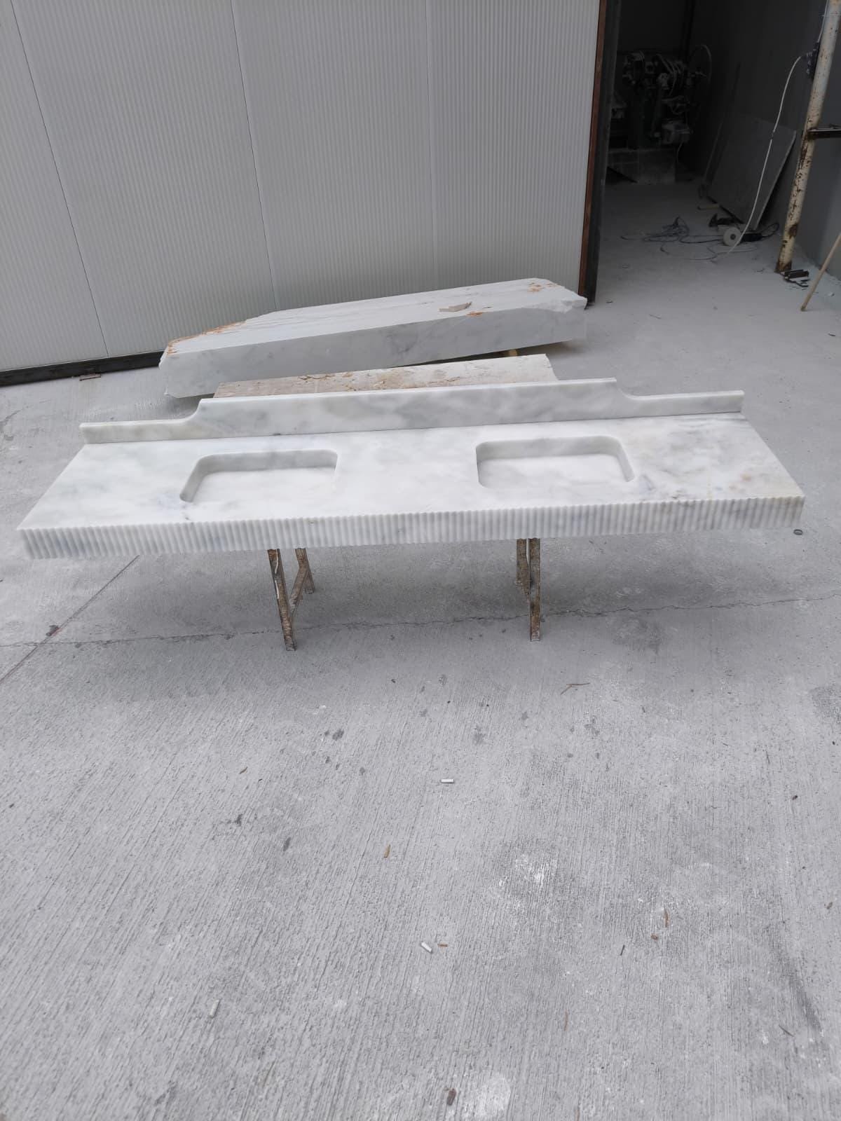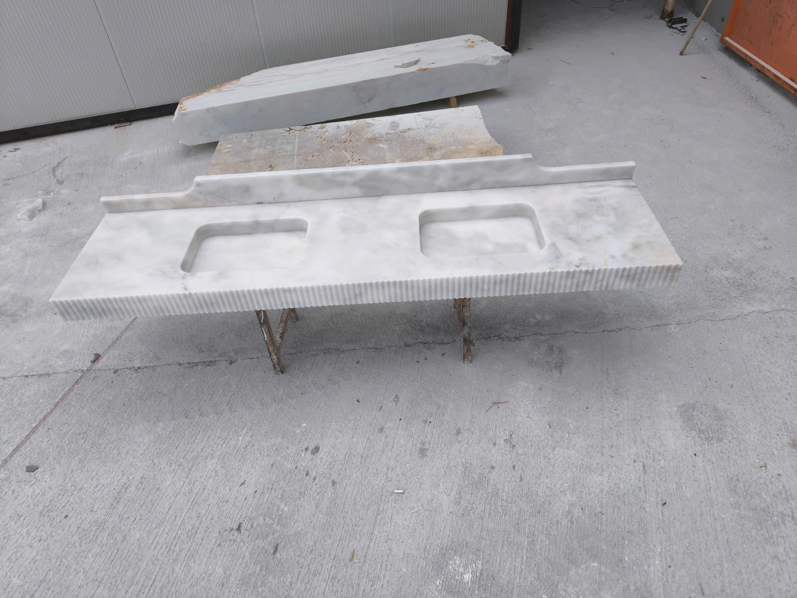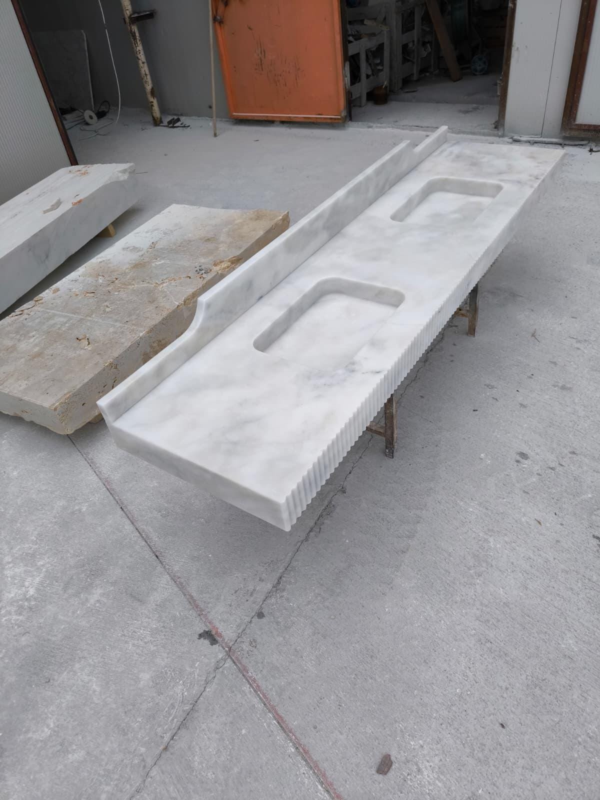 Bring timeless elegance to your bathroom with this Turkish Sugar marble sink, handcrafted from premium white and gold-veined marble. Designed with a double basin layout and an integrated backsplash, this luxury vanity top offers both beauty and functionality for modern and classic interiors.